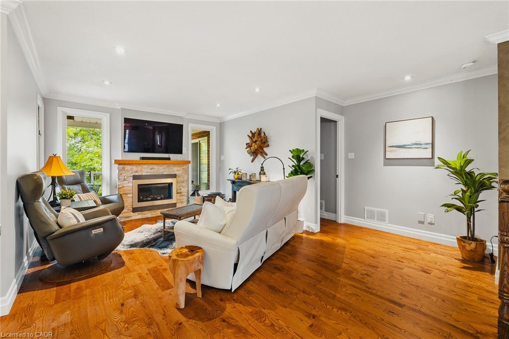 Welcome to Riverwalk, one of Cambridge's most sought after communities tucked along the banks of the Grand River. This beautifully renovated end unit offers a rare combination of privacy, natural light, and effortless living in a setting that feels worlds away from the everyday. Inside, the main floor has been thoughtfully opened up to create a bright, flowing layout where the kitchen, living, and dining areas connect seamlessly. Large windows draw in natural light and frame peaceful views of the surrounding greenery and river beyond. The main floor primary bedroom offers the ease of single level living, complete with a luxurious 5 piece ensuite featuring a freestanding jetted tub, glass shower, and double vanity. Step directly from the bedroom onto the private deck and start your mornings overlooking the Grand River, a view that never gets old. A separate dining room at the front of the home offers flexibility for formal entertaining, a quiet home office, or a cozy reading space. Downstairs, the fully finished walkout basement adds valuable living space with a second bedroom, spacious family room, and gas fireplace that makes the entire level feel warm and inviting. Perfect for guests, extended family, or a private retreat. Riverwalk is known for its beautifully maintained grounds and welcoming community atmosphere. Residents enjoy access to a clubhouse, party room, visitor parking, and shared outdoor spaces including a community garden and arboretum. Just steps away, the Walter Bean Grand River Trail offers kilometres of scenic walking and cycling paths along the river. With major updates including a new heat pump and roof in 2025, and a location that blends peaceful nature with easy access to city amenities, this home offers a lifestyle that is both relaxed and refined. A rare opportunity for those looking to downsize without compromise or simply enjoy riverside living at its best.