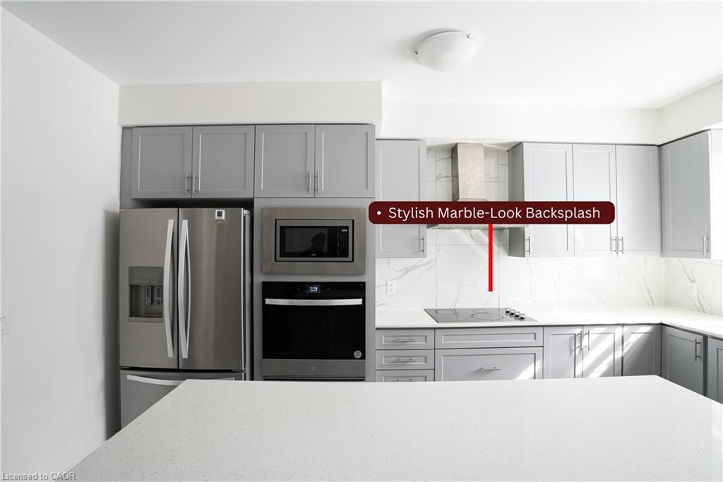 evenings at home. The heart of the home is the bright, modern kitchen with grey shaker cabinetry, quartz countertops, marble-look backsplash,