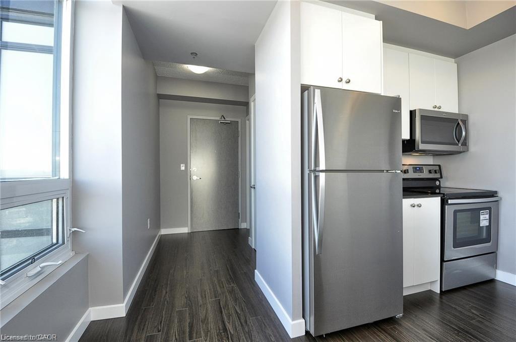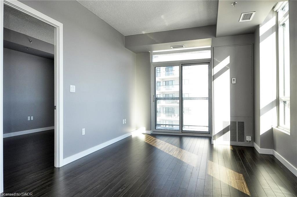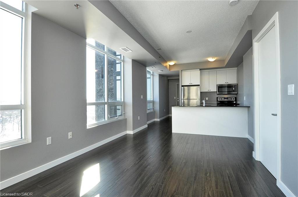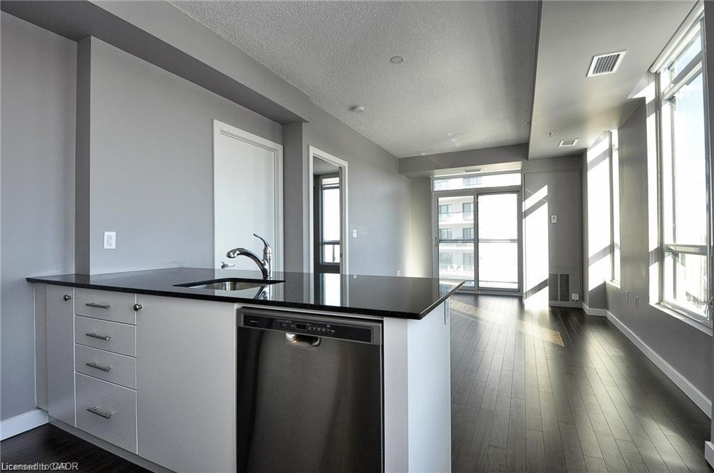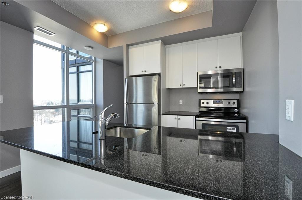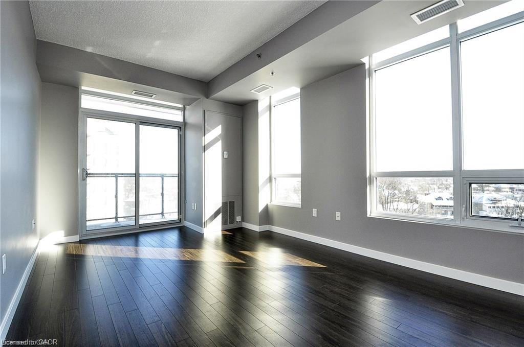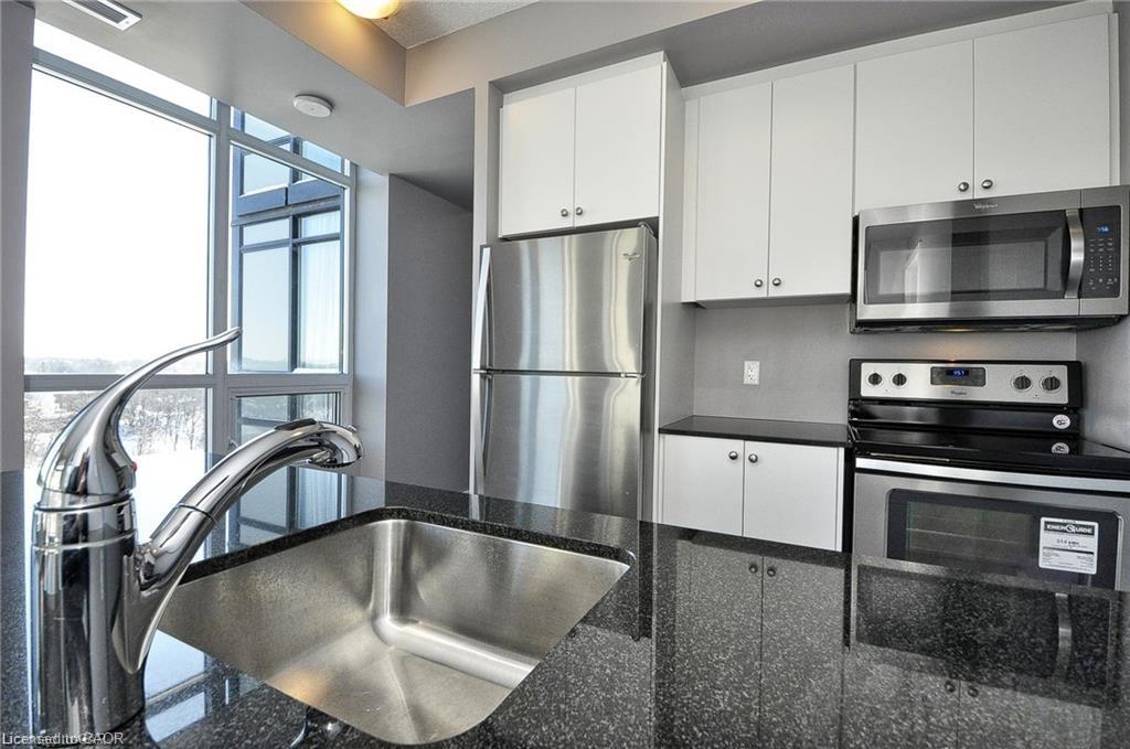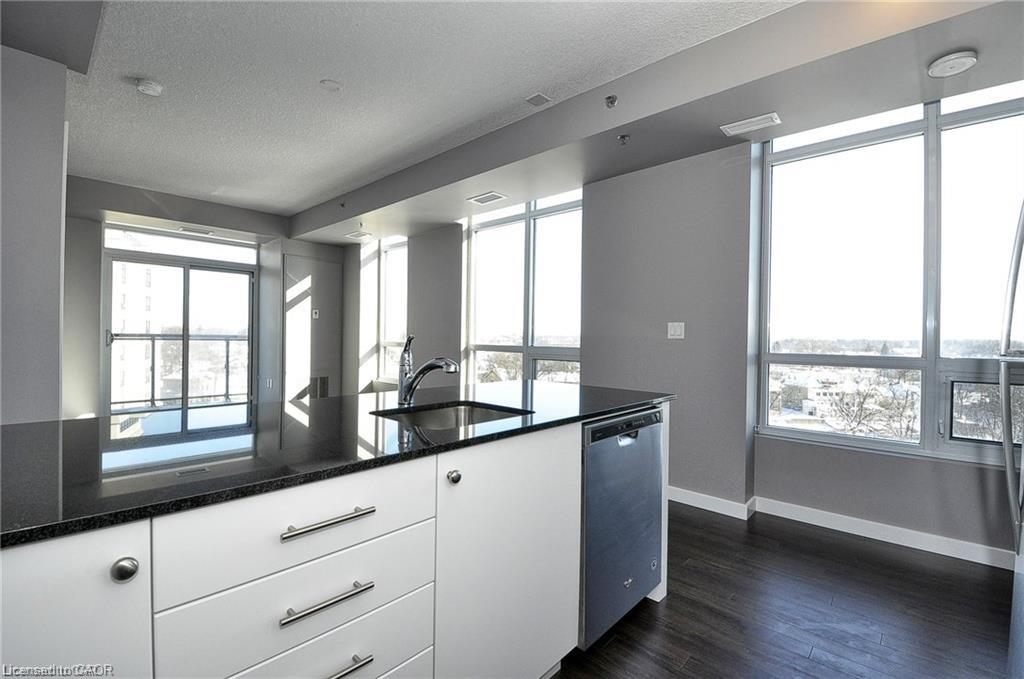 This Stunning 1 bed 1 bath corner end unit offers stunning picturesque views of the Grand River from the 105sq.ft balcony. Additional large airy windows also give you views of the gardens and street, this unit is really a must see to appreciate it. This unit offers laminate flooring, granite countertops, SS appliances and separate storage/laundry room that contains a stackable washer and dryer leaving plenty of room for your storage needs. 2 seperate owned parking spots come with this unit, 1 underground and 1 at the front of the building. A Storage locker, gym and party room round out the added features included. You will be steps away from Shopping, restaurants, trails and the Hamilton Family Theater.