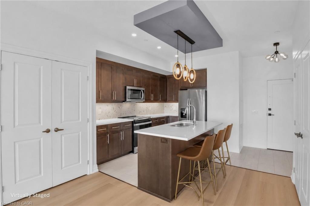The living room features a cozy electric fireplace. The primary bedroom features a beautiful ensuite bathroom with jetted tub and a glass door walk-in shower plus a walk-in closet. The building provides tremendous amenities including underground parking, controlled entry, fitness centre, guest suite, golf simulator, games room, party room, visitor parking and much more. With the ability to walk to shopping, restaurants, parks, schools and with quick access to 401... this unit truly has it all!--
