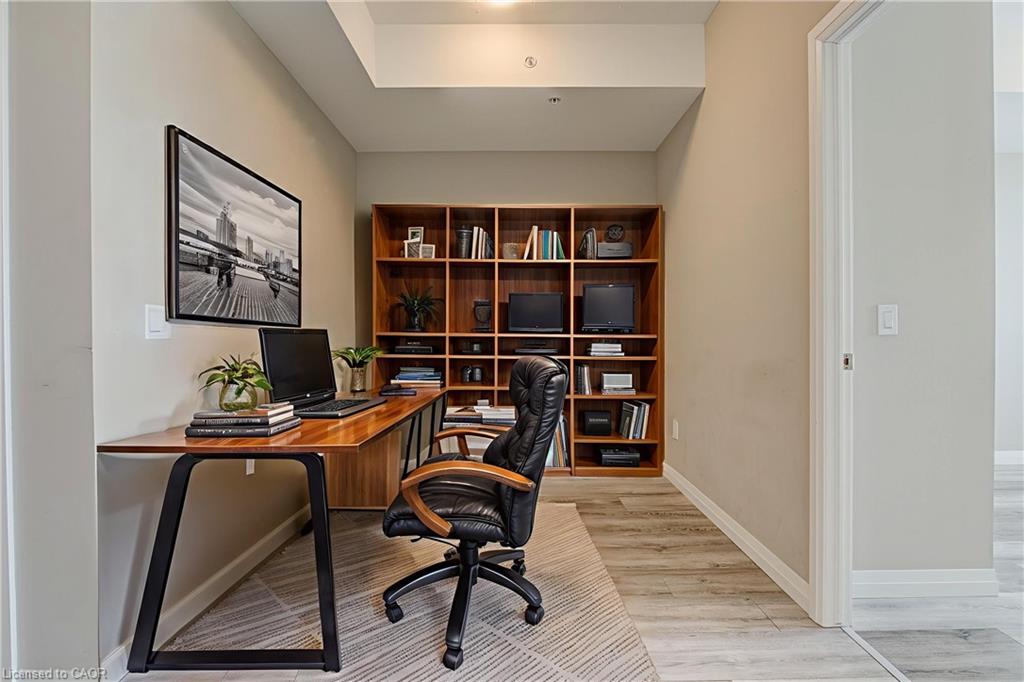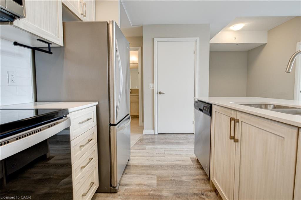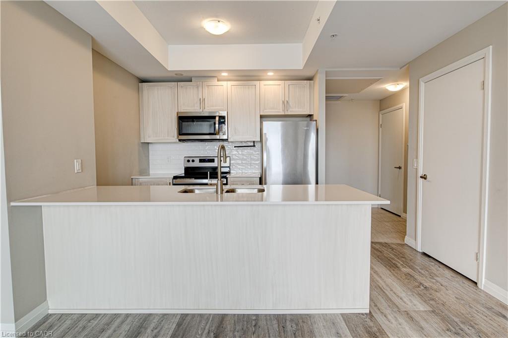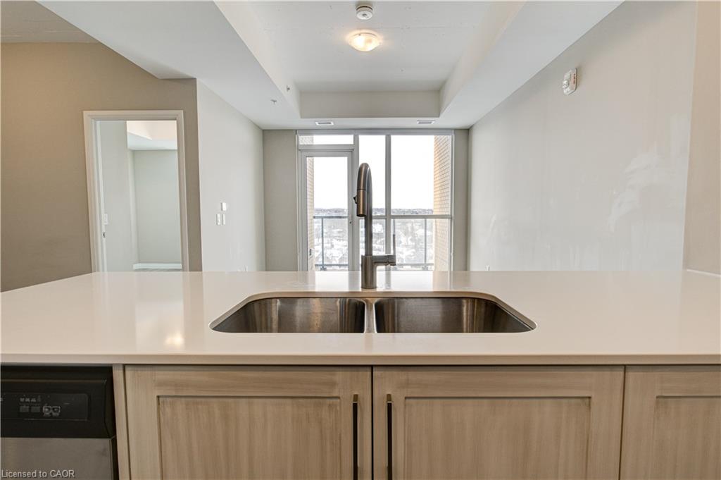Located just steps to downtown Kitchener and the beautiful Victoria Park, this 1 bedroom plus den condo at 108 Garment Street offers a welcoming place to settle into city living. Completed in 2022, the unit features a practical layout and a kitchen that truly anchors the space. Upgraded appliances and cabinetry, a double sink, dishwasher, and generous counter space make it easy to cook at home, while the extra-long peninsula comfortably seats three to four—ideal for casual meals or hosting friends. The living area flows easily from the kitchen and opens to a private west-facing balcony, offering a quiet place to unwind in the afternoon and evening. The den adds valuable flexibility, working equally well as a home office, extra storage, or cozy reading nook. The bedroom is comfortably sized, and the unit is completed by a contemporary bathroom and the convenience of in-suite laundry. Indoor garage parking for one vehicle and a storage locker are included with the unit.