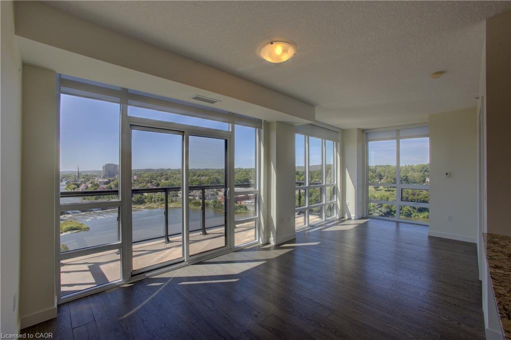 Condo living with the "BEST VIEW"! At its finest this pristine corner unit in the heart of historic Downtown Galt, offering uninterrupted views of the scenic Grand River. Rarely offered, this suite includes another 140 sq.ft. of private outdoor DOUBLE LENGTH balcony space—ideal for enjoying both sunrises and sunsets over the water and downtown skyline. The open-concept layout allows natural light to flood the space through dramatic floor-to-ceiling windows. This 2-bedroom, 2-bathroom, plus den is completely carpet-free, complete with granite countertops.Enjoy the convenience of in-suite laundry, stainless steel appliances and the bonus of a Den/Office area. This Condo has been recently painted(July 2025) allowing for an easy move in, and shows immaculately. Included is one underground parking spot, a private storage locker, and plenty of visitor parking. Residents have access to an array of amenities, including a fully equipped fitness centre, a stylish social lounge, guest suite, and an expansive outdoor terrace complete with gas BBQs right alongside the Grand River. Built in 2015, The Grand Condominiums place you steps away from everything—boutique shops, gourmet coffee, local restaurants, art galleries, live theatre, weekend markets, and the scenicTrans Canada Trail. Commuters will love the quick access to the 401, Hwy 8, and Hwy 7/8, as well as excellent transit options.