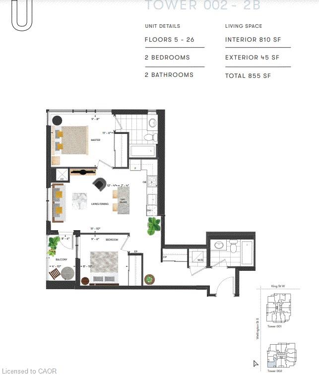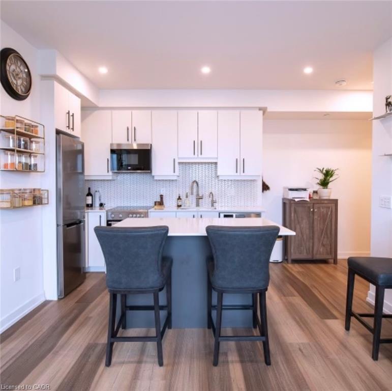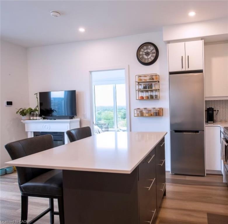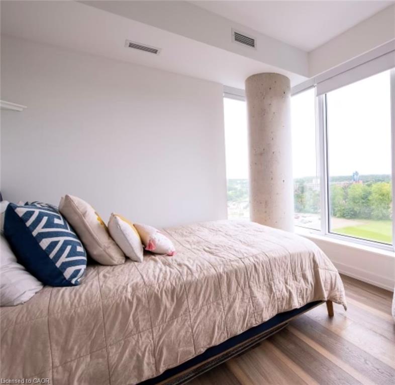 Vacant and ready for occupancy now! Come check out this perfectly appointed 810 square foot unit with its own private balcony at the highly regarded Station Park Union Towers. The spacious floor plan offers 2 beds and 2 baths with ensuite and an open concert layout. Loaded with upgrades, this corner unit faces northwest and has floor to ceiling windows allowing tons of natural light to flow into the condo. The interior features a kitchen island perfect for entertaining, quartz countertops, herringbone tile backsplash, and stainless steel appliances. Centrally located in the Innovation District, Station Park is home to some of the most unique amenities known to a local development. Amenities include: Two-lane Bowling Alley with lounge, Premier Lounge Area with Bar, Pool Table and Foosball, Private Hydropool Swim Spa & Hot Tub, Fitness Area with Gym Equipment, Yoga/Pilates Studio & Peloton Studio , Dog Washing Station / Pet Spa, Landscaped Outdoor Terrace with Cabana Seating and BBQ’s, Concierge Desk for Resident Support, Private bookable Dining Room with Kitchen Appliances, Dining Table and Lounge Chairs, Snaile Mail: A Smart Parcel Locker System for secure parcel and food delivery service. Enjoy being steps from the Light Rail Transit, grocery stores, Victoria Park, restaurants, and the vibrant festivals and nightlife Kitchener-Waterloo has to offer. The condo comes with 1 underground parking space, locker, and Internet included.