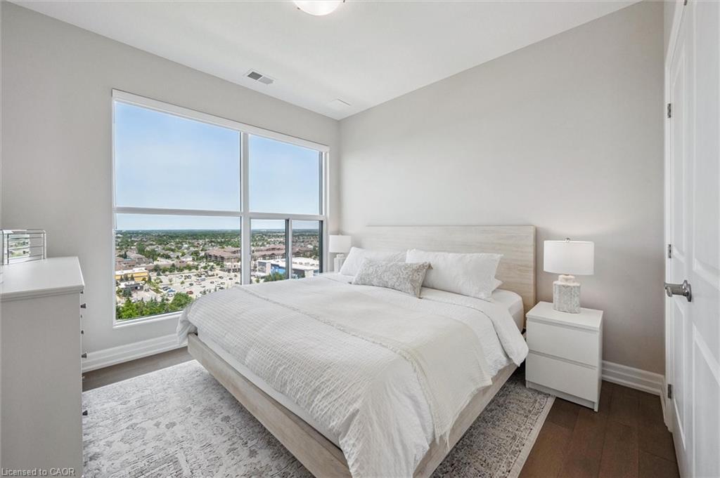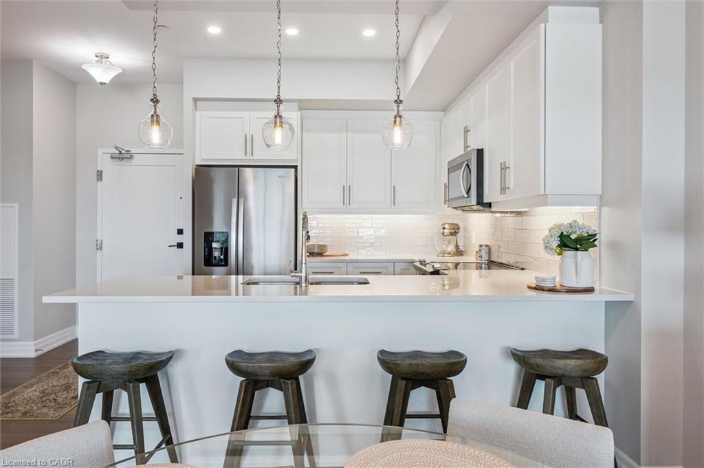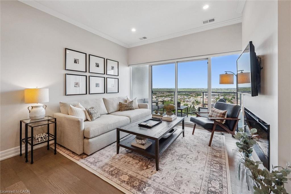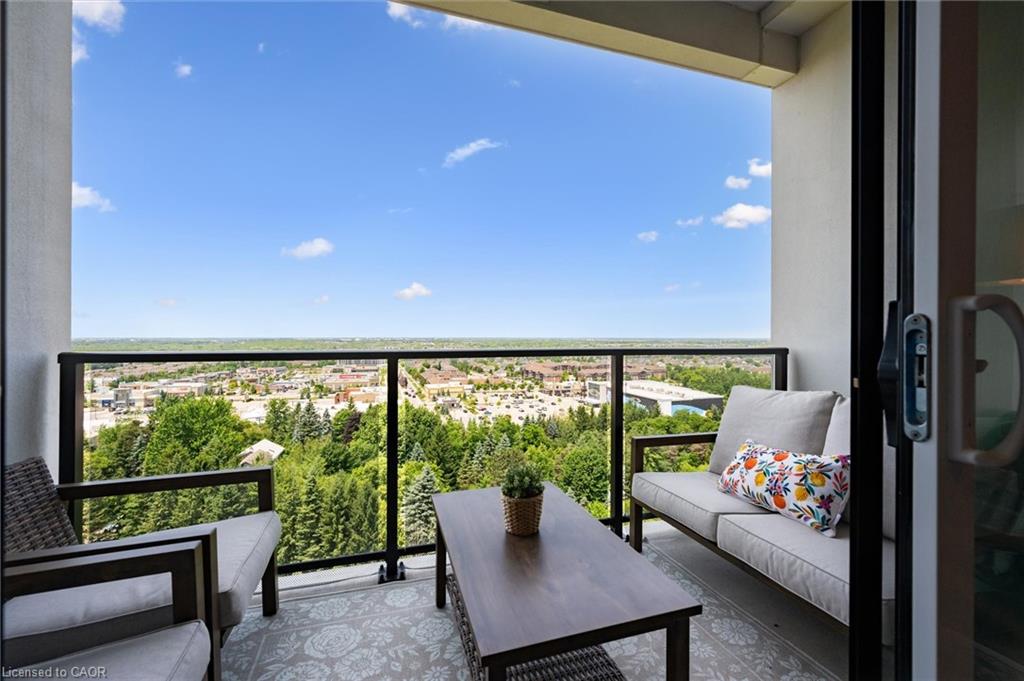 Set high above Guelph's vibrant south-end this suite showcases impressive 941sqft, 1-bdrm + den where modern elegance meets breathtaking views! Bathed in natural light this unit captures sweeping vistas of treetops & city skyline offering serene backdrop for everyday living. At this price point it offers exceptional value per sqft in one of Guelph's desirable neighbourhoods. Designed W/upscale finishes this modern suite exudes comfort & sophistication. Soaring ceilings & wide-plank engineered hardwood create airy ambience that flows seamlessly through the open-concept living space. Relax by fireplace in living room or step onto private balcony-ideal spot to sip morning coffee or unwind & take in city views. Gourmet kitchen W/white cabinetry, quartz counters, backsplash & S/S appliances. Oversized breakfast bar W/pendant lighting invites casual dining & entertaining. Primary bdrm W/floor-to-ceiling windows deliver breathtaking vistas. Luxurious 4pc bath W/oversized vanity, quartz counters & soaker tub surrounded by marble-inspired tile. French doors reveal versatile den-ideal as home office, guest room or creative studio. W/I closet in entryway & pantry off dining area keep everything organized & within reach. Live, work & play without leaving home! Residents enjoy amenities: state-of-the-art fitness, golf simulator lounge W/bar, social spaces W/kitchen, billiards, lounge seating & outdoor terrace. Underground parking for yr-round convenience! For parents of U of G students this suite is a smart alternative to renting. Invest in an appreciating asset 10-min from campus W/direct bus access. 24/7 on-site mgmt & controlled entry, you'll have peace of mind knowing your child is living safely while your investment grows in value. Steps to Pergola Commons for access to groceries, restaurants & shops. Quick access to 401 for commuters. Whether you're picking up produce, meeting friends for dinner or exploring parks & trails, this neighbourhood has it all!
