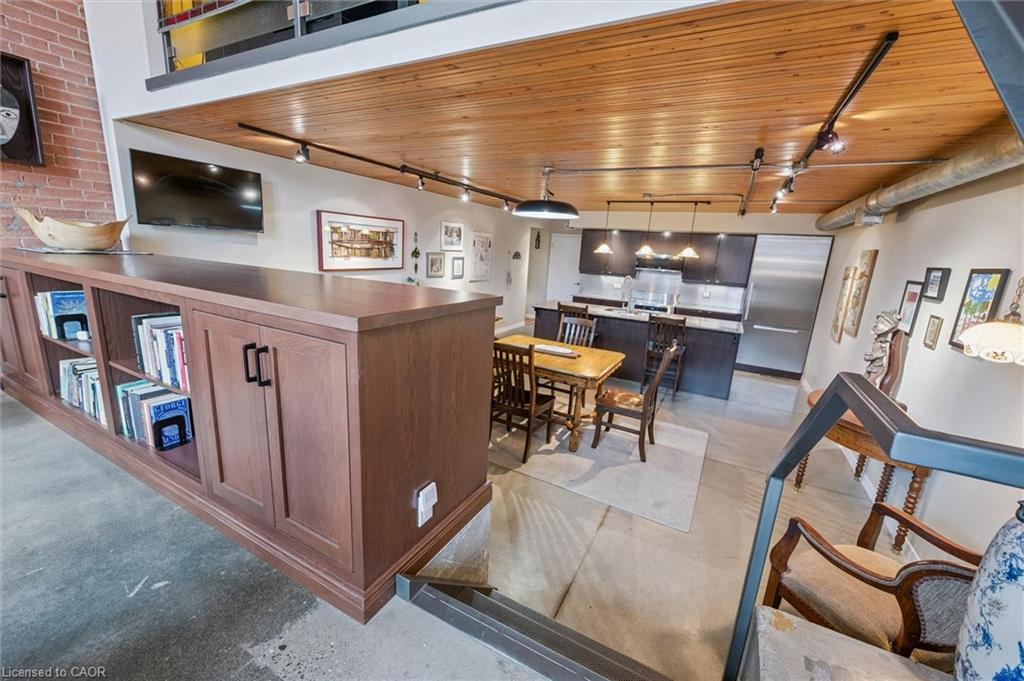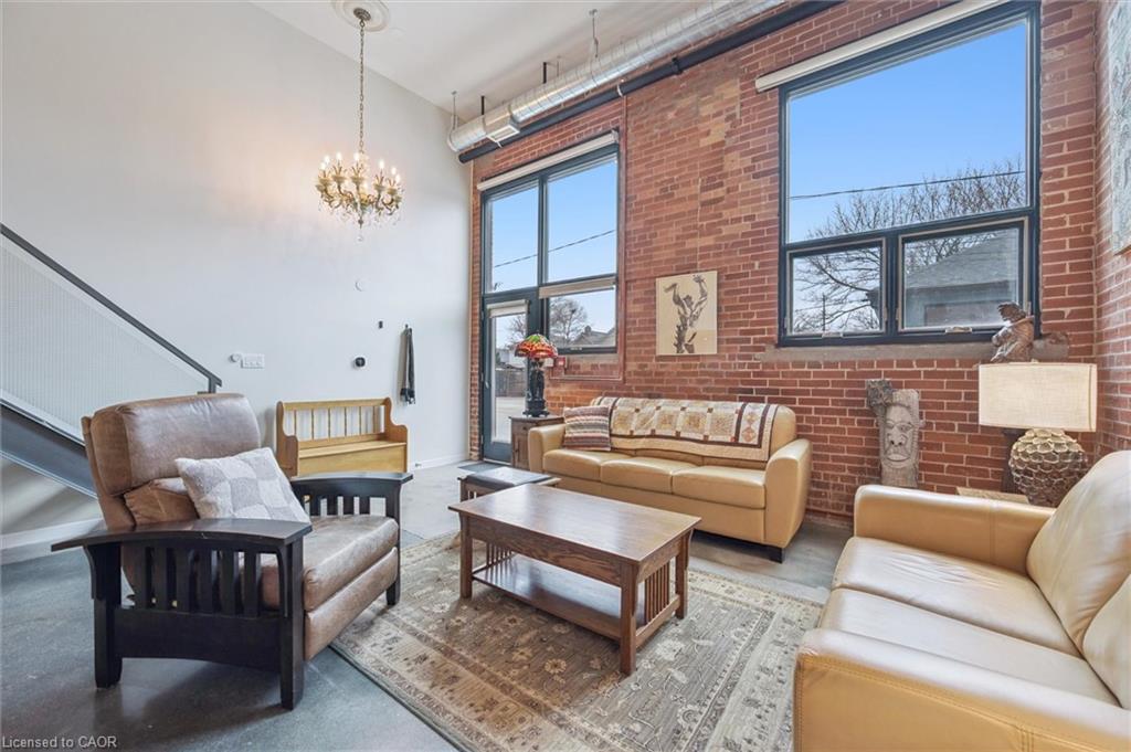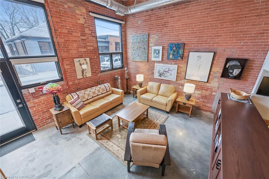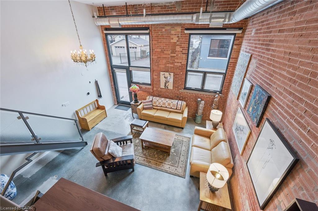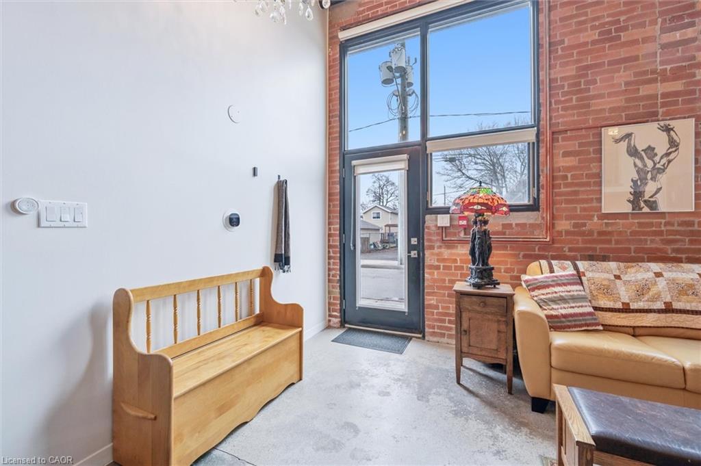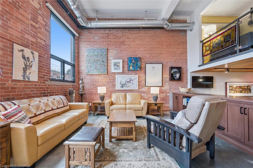 Why pay more for a high-rise condo when you can have this spacious (1585 square feet), trendy home? Newly decorated, the main level includes soaring ceilings, bright rooms, large windows, and exposed brick walls on the main level. The kitchen features stainless steel appliances (dishwasher 2026), granite counters, and an island with ample seating--all adjoining an expansive dining room and a full bath. A perfect space for entertaining. Upstairs you will find hardwood floors, an ensuite full bath, a primary BR that opens to a private patio, a walk-in closet, and a second, large, loft bedroom just waiting for guests or family members. There’s more! Smart lighting, a beautiful solid-oak bookcase room divider, floating stairs, indoor parking, water softener replaced in 2026, an extra-large storage locker, more storage behind the kitchen, and direct access to the street and the garage. #106-85 Spruce Street is located in beautiful, growing downtown Galt on a quiet street. Walk to the Grand River, theatres, numerous coffee shops, bookstores, grocery shopping, and Soper Park. A modern, chic, oasis in the city!