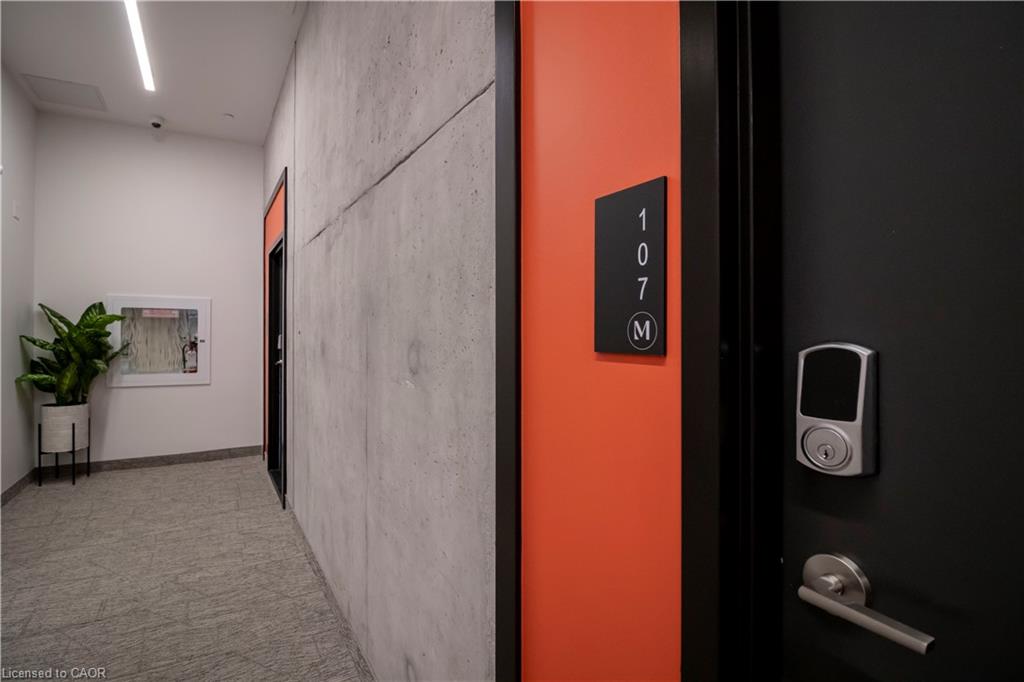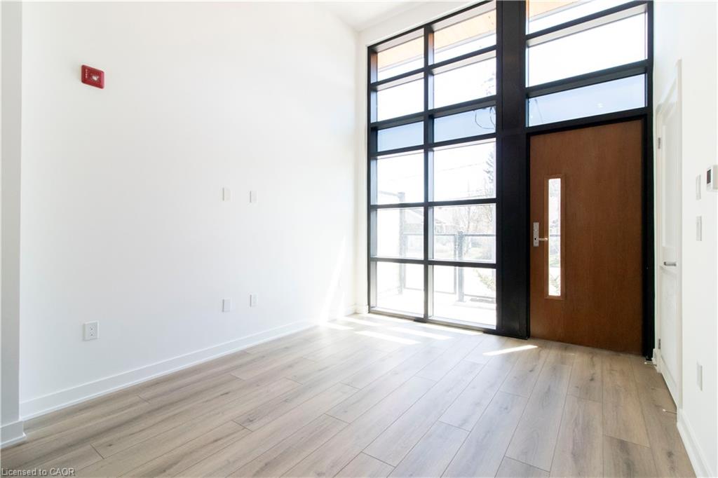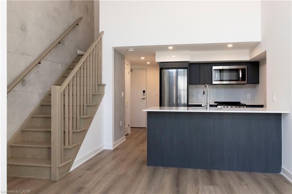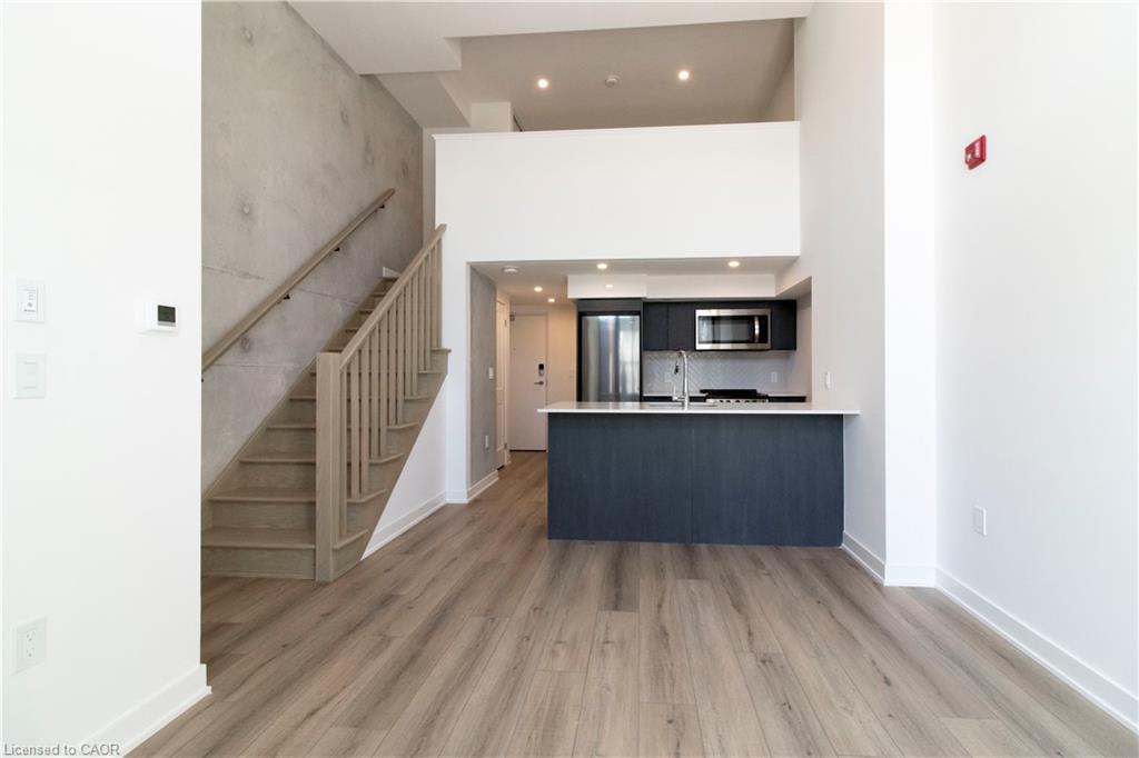 Live à la Moda—where style meets substance in this brand-new, never-lived-in double-height loft with soaring 15-ft ceilings and a polished concrete feature wall. Bathed in natural light through full-height black-framed windows, this industrial-chic unit offers a mezzanine bedroom, stylish modern kitchen with quartz counters and stainless steel appliances, and a spacious open-air terrace with natural gas hookup—perfect for grilling and entertaining. Step inside a thoughtfully designed residence boasting luxury vinyl-plank flooring, an in-suite laundry pair, sleek designer lighting, and a private entrance with secure underground parking included. This ground-floor loft is one of the most striking layouts in the building, with a sophisticated edge. Located just 3 minutes from the University of Waterloo and close proximity to Uptown, Laurier, Waterloo Rec Complex, and The Hydrocut trail system, this location supports a dynamic, active lifestyle. With many bike routes close by, secure bike parking, and an on-site bike maintenance station, it’s built for those who move. Amenities include a curated co-working lounge with coffee bar and meeting pods, pet wash station, EV-ready parking, secure parcel room, and available storage lockers—blending convenience and community under one stylish roof. Welcome to Moda Modern Loft Living.