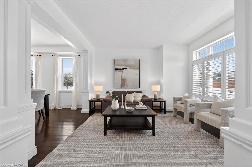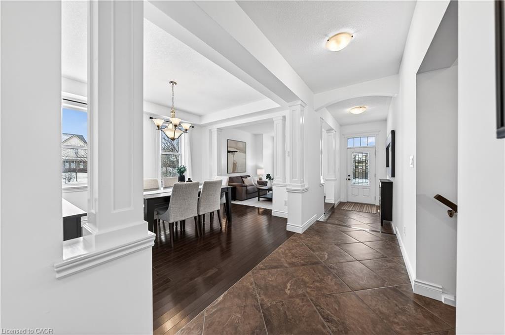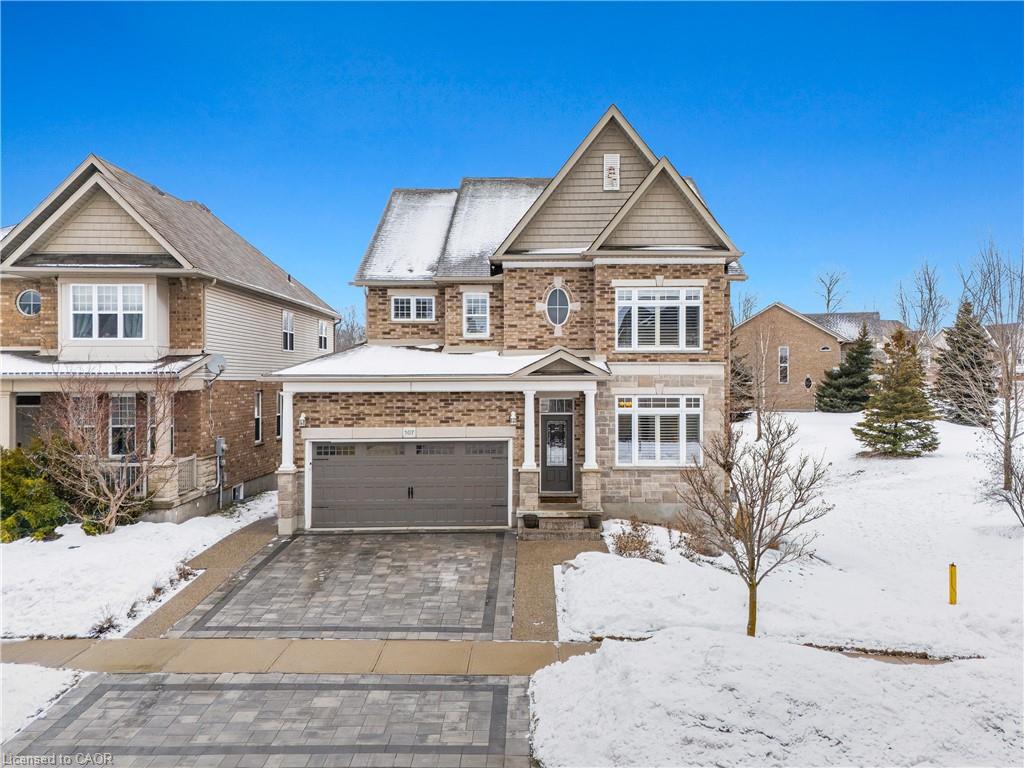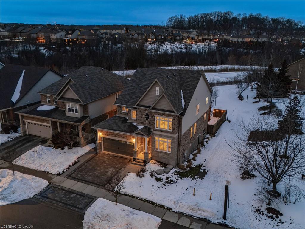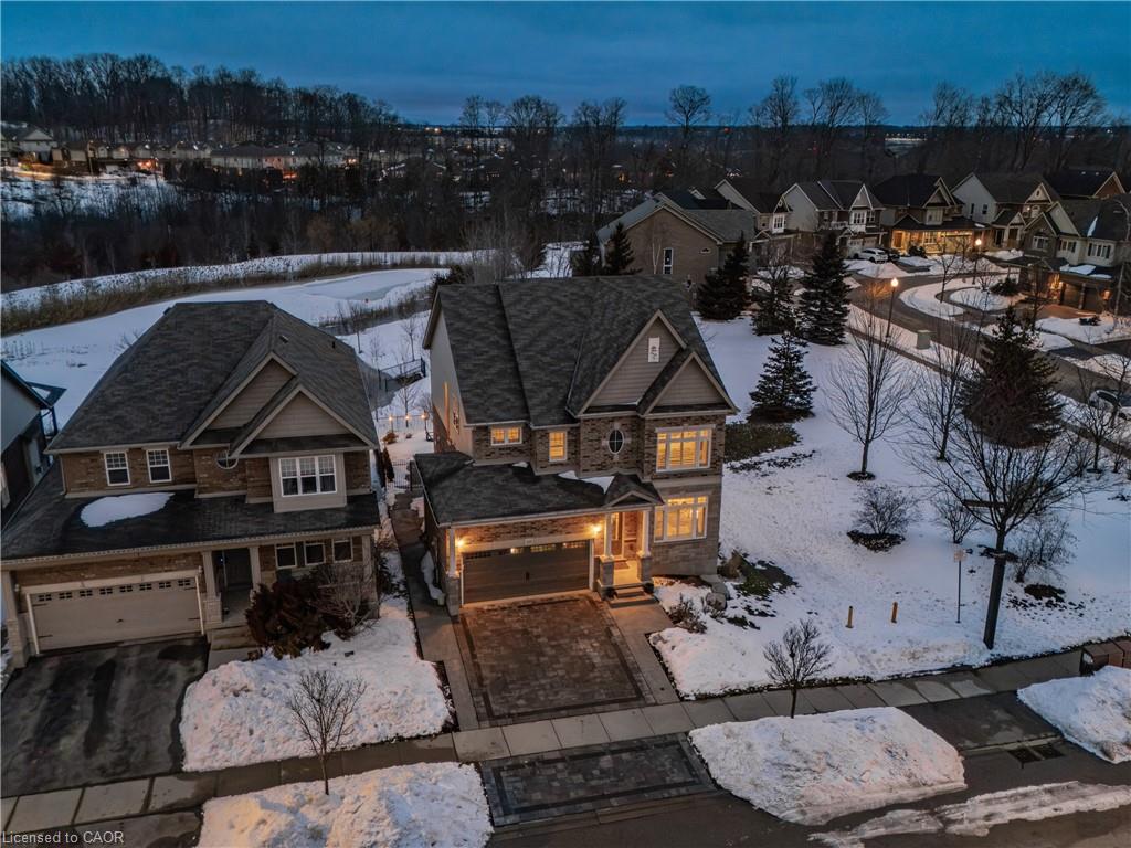 Welcome to 107 Janine Street, perfectly positioned in the heart of Edgewater Estates-one of Kitchener’s most sought-after neighbourhoods. Backing onto a tranquil pond & protected greenbelt, with no rear neighbour & parkland along the right side, this beautifully updated custom-built executive home offers a rare blend of privacy, quiet luxury, & an exceptional natural setting. Offering 2,859 SF with 5-bedrms, & 3-bathrms, this exceptional home is thoughtfully designed for family living & entertaining. The bright main level features formal living & dining spaces that flow into a modern kitchen with granite counters, premium appliances, breakfast bar, abundant cabinetry, & dinette with walkout to the deck. The spacious great rm showcases custom built-ins, gas fireplace with stone surround, & expansive windows with window seat framing the serene views. Hardwood & tile flring run throughout the main level. A well-designed mudrm with oversized walk-in closet & 2-pc bath completes the main flr. Upstairs, the luxurious primary retreat features double-door entry, window seat, walk-in closet, & a spa-like 5-pc ensuite with dual sinks, lrg shower, & soaker tub. 4 additional bedrms & a 4-pc main bathrm completes the upper level. Freshly painted throughout, with hardwood flring in the upper hallway & new carpet in all bedrms. California shutters & custom window coverings throughout. The private backyard is a beautifully landscaped retreat with extensive patio areas, mature trees, perennial gardens, built-in firepit, hot tub, & uninterrupted private pond & greenbelt views. Double-car garage & interlocking driveway-parking for 4. The unfinished lower level is fully framed/roughed-in, easy to finish-incredible future potential. Prime location: steps from Chicopee Ski Hill, the Grand River, parks, trails, top-rated schools, shopping, & quick HWY access (Expressway & 401)-ideal for both commuters & families. Homes like this don’t come along often-schedule your private viewing today!