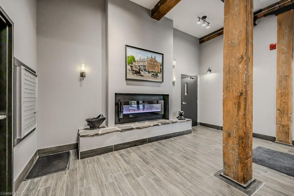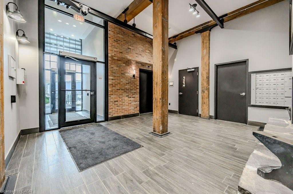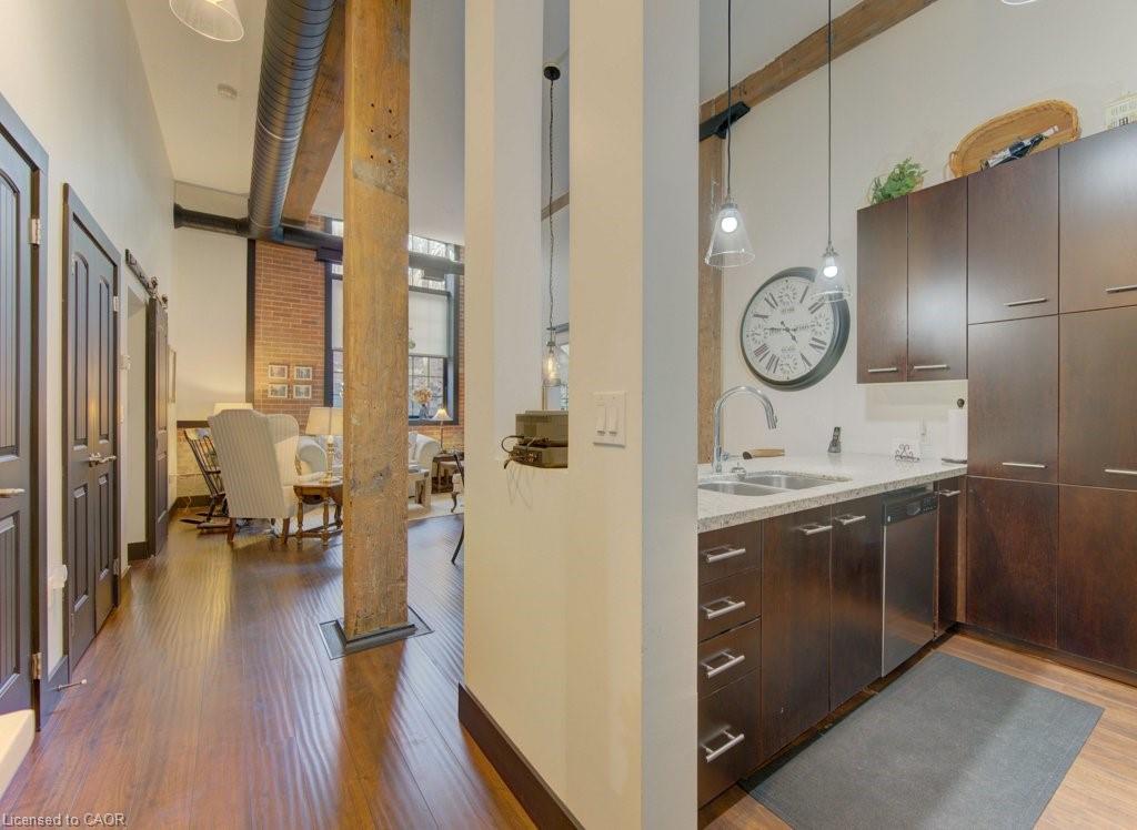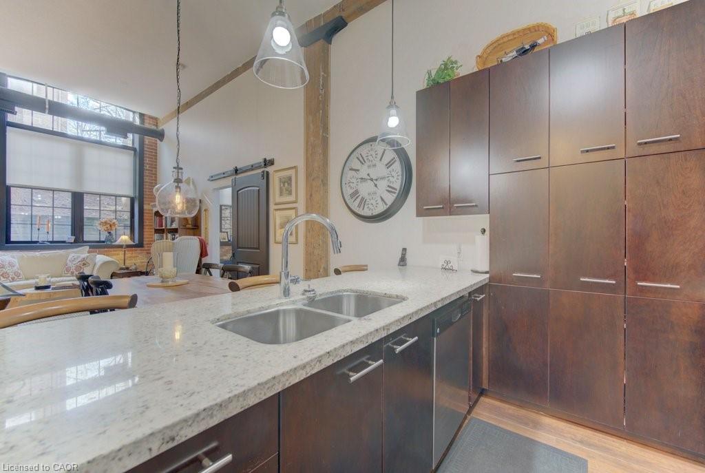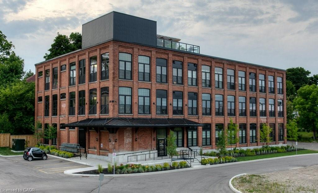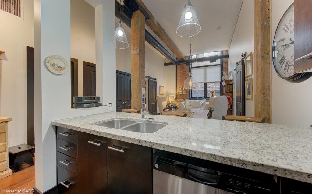 The historic Blacksmith Lofts welcome you to explore urban style with everyday functionality in this rare 2-bedroom loft. Offering a highly sought-after split-bedroom layout, this unit is ideal for professionals, downsizers or anyone looking for flexible living space with added privacy. Step inside to soaring ceilings and an open-concept design that creates an airy, elegant feel throughout. The spacious living and dining area sits between the two bedrooms, making it perfect for entertaining or quiet evenings at home. Large windows invite natural light to pour in, enhancing the loft’s warm, refined character. Both bedrooms are generously sized and feature walk-in closets—an uncommon find in condo living. One bedroom offers semi-ensuite access to the 4-piece bathroom, adding convenience and a touch of separation for guests or shared living arrangements. The kitchen is designed for both style and practicality, with modern finishes and ample workspace to make daily living easy. Carpet-free flooring runs throughout, and in-suite laundry adds to the overall convenience. Located in the heart of downtown Galt, you’re just steps from the Gaslight District, Grand River trails, cafés, restaurants, boutique shops and the University of Waterloo School of Architecture. Residents also enjoy access to a shared rooftop terrace with sweeping city views. If you’ve been waiting for a unique loft with character, space, and a truly functional layout, this one is not to be missed. Book your showing today!