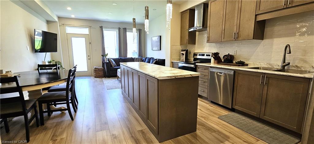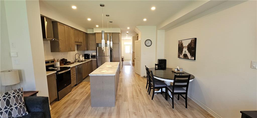 MODERN LIVING TUCKED IN THIS ACTIVE NEIGHBOURHOOD. This stylish townhome is conveniently located in the desirable and growing family-friendly neighborhood of East Galt. Presenting a stunning bright and airy open-concept layout – the kitchen with a center island, s/s appliances, and ample cabinets perfect for casual dining or entertaining. It seamlessly flows into the living room and dining room. The townhome also includes convenient upper-level in-suite laundry facilities, saving you time and effort. With over 1690sqft - 3 bedrooms and 2.5 bathrooms including the primary suite with a 5pc bathroom and 2 spacious walk-in closets. The contemporary finishes throughout the unit add a touch of style and sophistication. Located just steps away from a variety of amenities, including parks. Close to schools and for those who commute or enjoy exploring the surrounding areas, the townhome is only a 4-minute drive to Highway 8, providing easy access to transportation routes. Furthermore, it is a short 14-minute drive to Valens Lake Conservation Area. Heat, hydro, gas, water, and hot water heater are to be paid by the tenant(s). Good credit is required, and a full application must be submitted. AVAILABLE immediately.