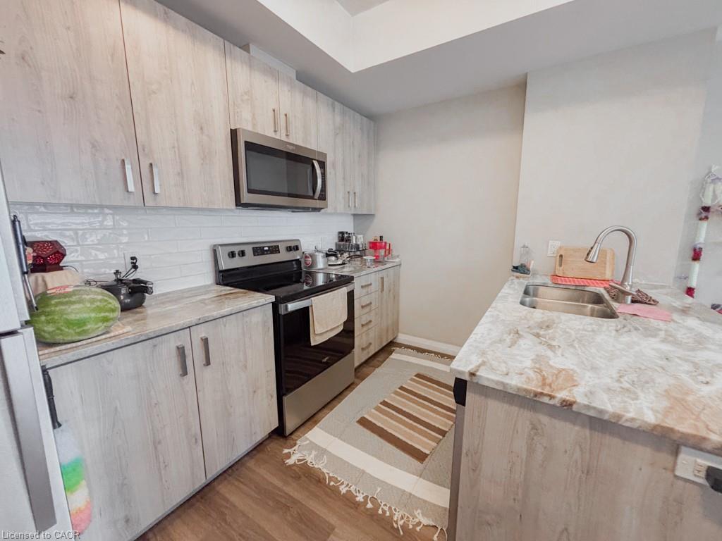 Welcome to Garment Street Condos - where contemporary style meets downtown Kitchener’s vibrant energy. Located in the sought-after third and newest Garment Condo Tower, this recently completed building redefines condo living with exclusive amenities: a private swimming pool, basketball court, fitness centre, yoga studio, party room, expansive lobby lounge, outdoor bbq's and patio and ground level retail. Work hard, play harder — it’s all here. Step inside Unit 1101, a beautifully upgraded one-bedroom suite with a sleek, open-concept design. Every detail has been carefully chosen, from the rich flooring to the crisp granite countertops and modern stainless steel appliances. The 50-square-foot balcony is the perfect perch for morning coffee or an evening glass of wine, complete with a city view. Even the lobby makes a statement with its stylish furnishings and welcoming spaces to relax or connect with neighbours. Perfectly situated within walking distance of transit, boutique shops, trendy restaurants, and the region’s thriving tech hub, Garment Street offers an elevated urban lifestyle. Come see for yourself why this is downtown Kitchener’s most talked-about address. Perfectly located steps from the ION Light Rail, Victoria Park, and Downtown Kitchener’s shops, markets, and dining, with convenient access to tech offices and the University of Waterloo campus. A standout opportunity in one of the region’s fastest-growing neighbourhoods!