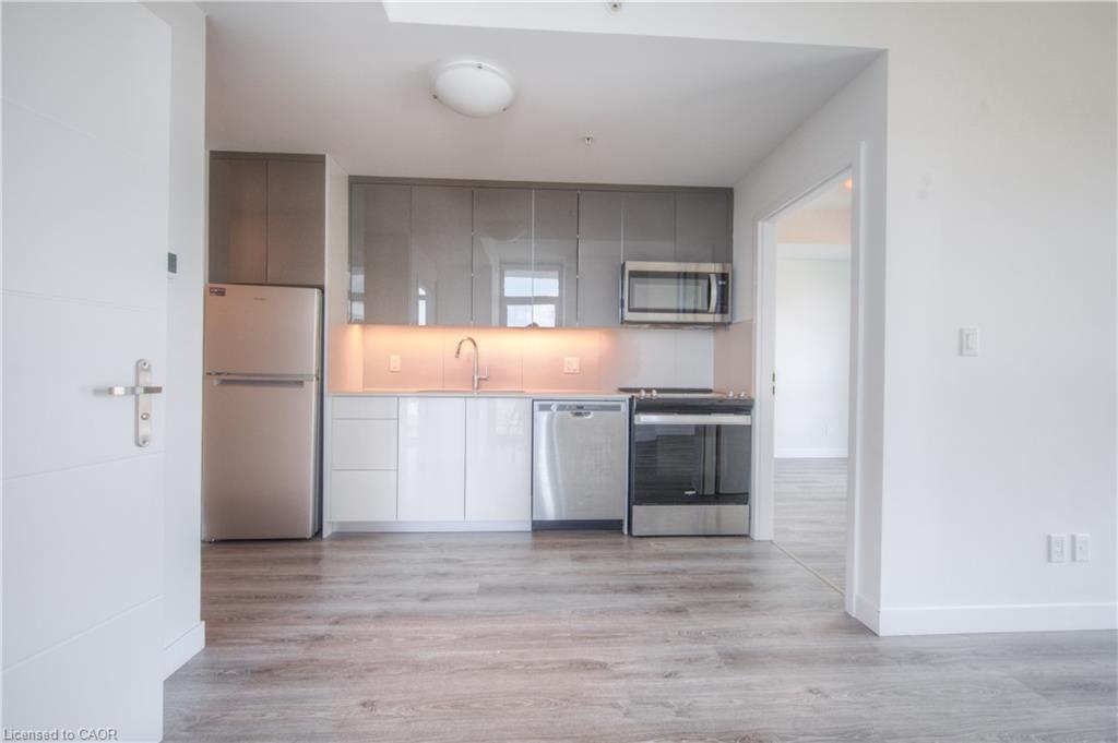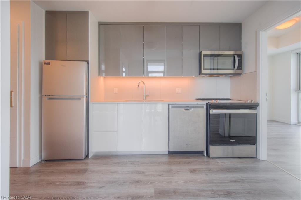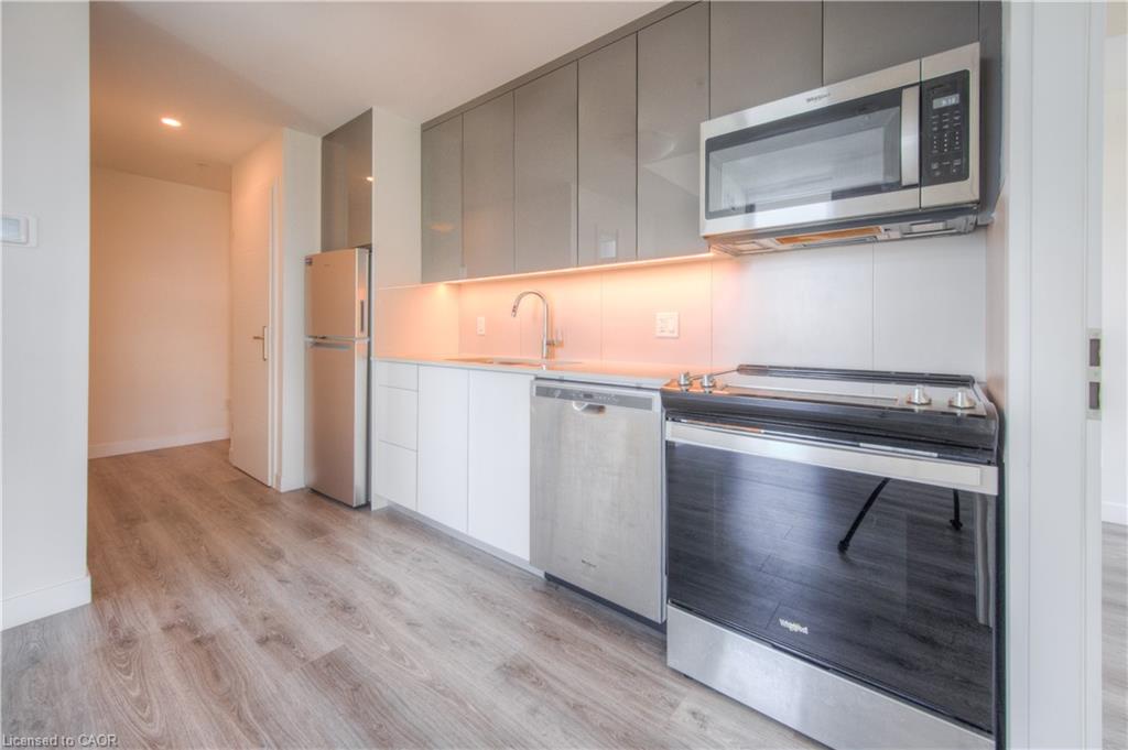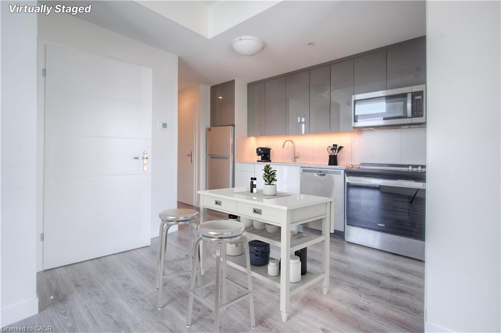 Enjoy luxury and leisure in the heart of downtown Kitchener at DTK Condos. This carpet free 2-bedroom/2-bathroom CORNER unit on the 11th floor is perfect for those looking for a life of leisure in the hustle of a growing city! Large windows create a light and airy feel that brightens the open concept living area, complete with a full kitchen and in-suite laundry. The gorgeous indoor living space opens up to a balcony offering beautiful views of the surrounding city. Plus, the building offers endless amenities including a concierge service, WIFI, a rooftop patio (with a dedicated dog space), a fitness room, a party room, etc. And right outside you can find GRT bus and ION rail stops, restaurants and cafes, Victoria Park, the Kitchener Public Library, Conestoga college, schools and more! This is the perfect living opportunity for young professionals or growing families looking for the perfect mix of comfort and fun. Come view your future home today! Photos are from before the current tenant.