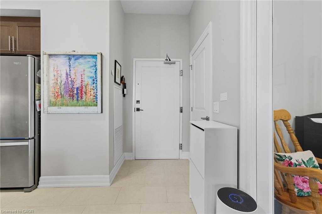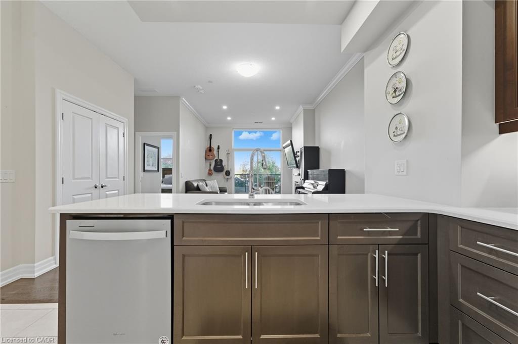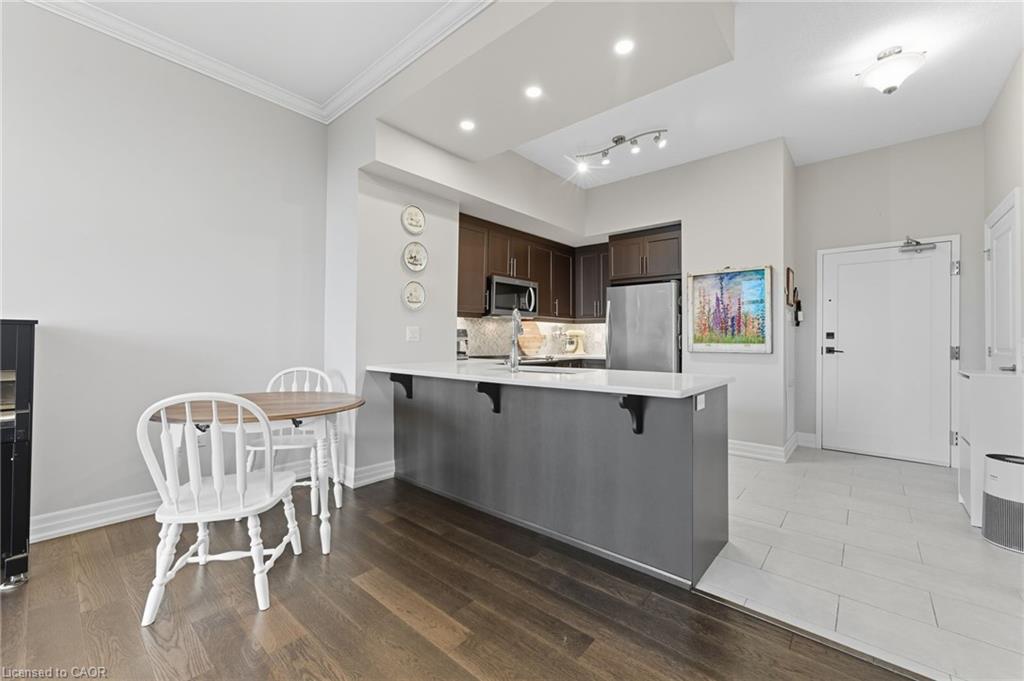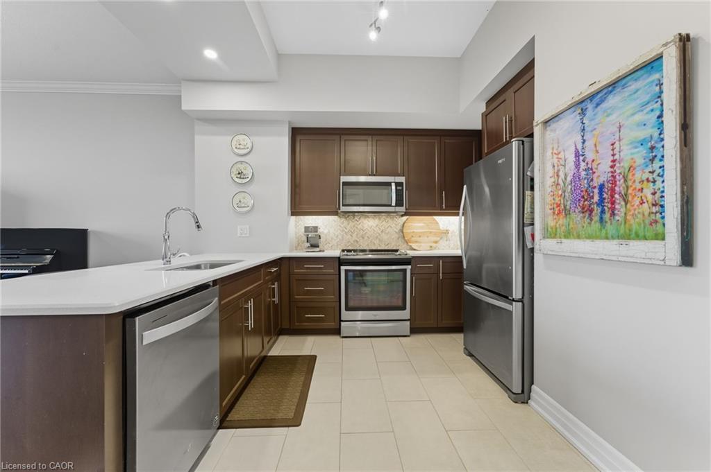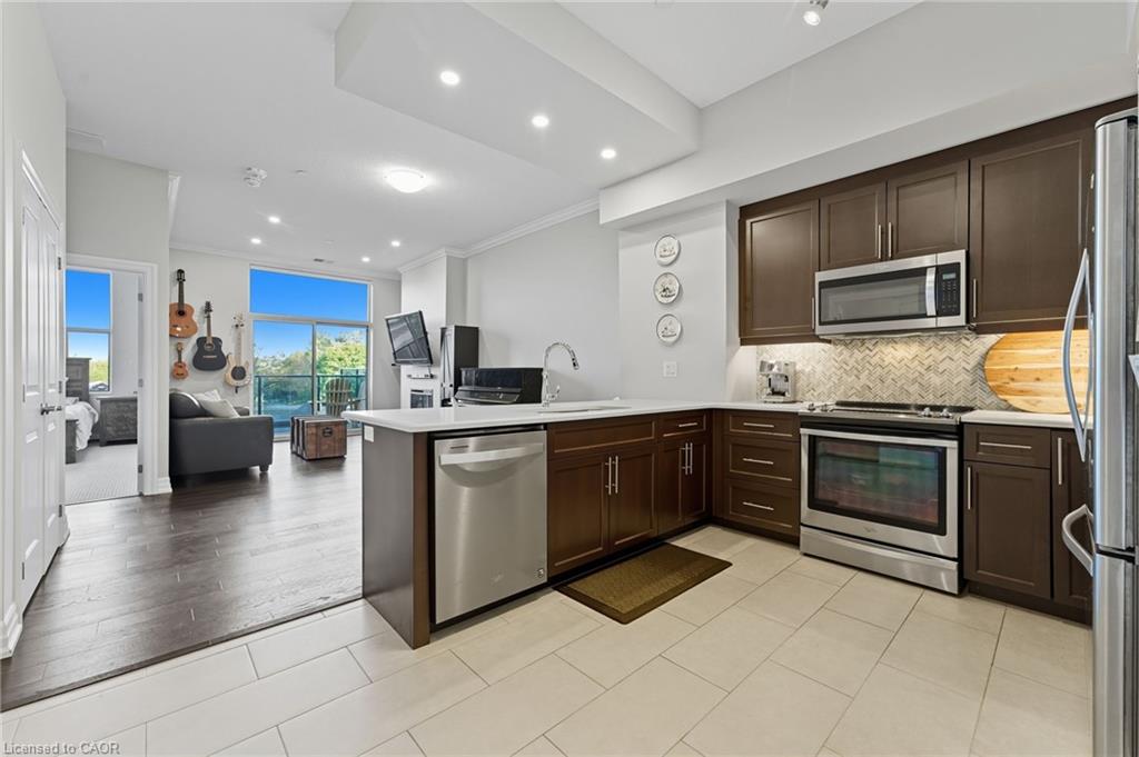 Skip the elevators and step into this stylish 1-BEDROOM + DEN condo that blends comfort, function, and a touch of luxury. Located in one of Guelph's most sought-after south-end communities-just steps from shopping, restaurants, and movie theatres, with easy access to the GO Bus and public transit, this unit offers both convenience and connection.Inside, you'll find a thoughtfully designed layout featuring a modern kitchen with QUARTZ counters, a sleek BACKSPLASH, built-in microwave, and bar seating that opens to a comfortable dining and living area. The included wall-mount for your TV and a built-in electric FIREPLACE add warmth and sophistication. The spacious bathroom features HEATED FLOORS, a rare luxury you'll appreciate year-round.Enjoy exceptional amenities right at your door: guest suites, a fully equipped fitness room, and even a golf simulator-all on the same floor! When it's time to entertain, head up to the 13th-floor party room and take in the sweeping southern views. UNDERGROUND PARKING adds comfort and security to this already complete package.Whether you're a first-time buyer, downsizer, or investor, this condo offers an unbeatable combination of style, location, and lifestyle-all in one smart move. BEST VALUE IN A WELL RUN BUILDING IN GORDON SQUARE. Quick Occupancy available.