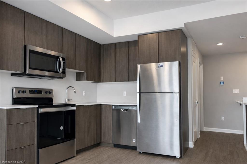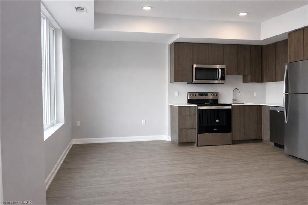 Welcome to this modern, front-facing 2-storey townhome in the sought-after Marquis Towns community in North Guelph. This bright and functional layout offers approximately 1,000 sq ft of open-concept living space, featuring 2 bedrooms, 2 bathrooms convenient in-suite laundry, and two private balcony.The main living area showcases a contemporary kitchen with quartz countertops, stainless steel appliances, and ample cabinetry, flowing seamlessly into the living space—ideal for everyday living and entertaining. Large front-facing windows provide plenty of natural light throughout. Upstairs, you’ll find two bedrooms including a spacious primary bedroom retreat along with a full bathroom. Located directly across from Riverside Park and surrounded by trails, green space, and everyday amenities, this home offers the perfect balance of nature and convenience. Easy access to major routes, shopping, and transit makes commuting simple. A great opportunity to lease a newer, low-maintenance home in one of Guelph’s most desirable communities.