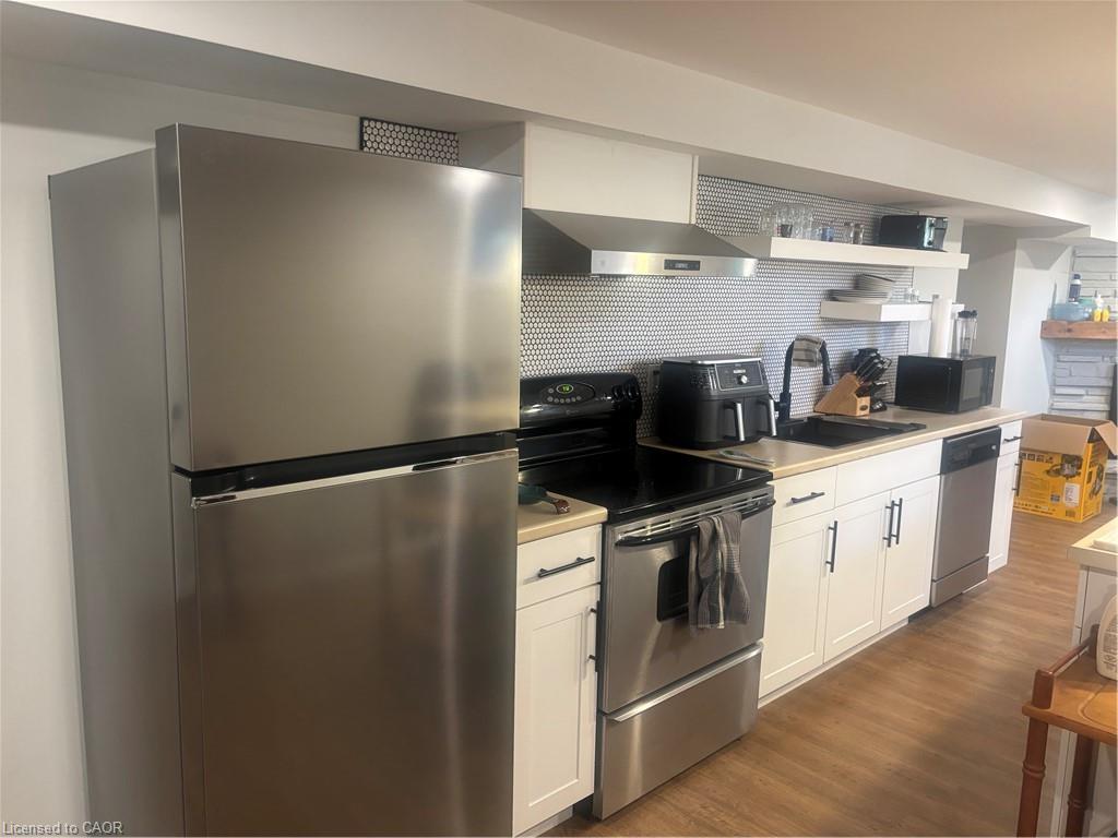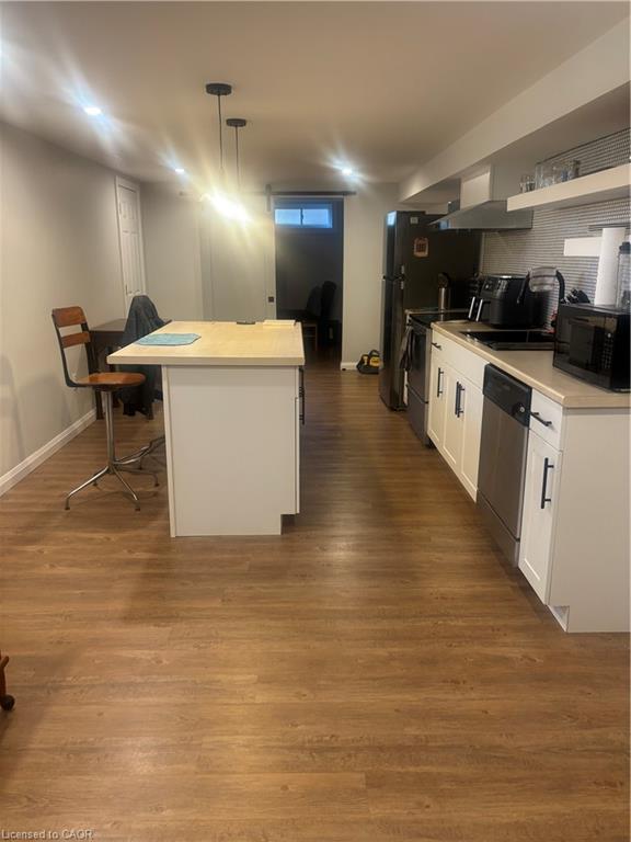 Renovated and updated, this spacious 2 bedroom, 1 bathroom full basement rental is located on a quiet treed lined street in an excellent neighbourhood within walking distance to grocery, shopping, restaurants and public transit. Easy access to expressway, great for commuters. This spacious and carpet free unit has everything you need with 2 bedrooms, updated kitchen with ample counter/cupboard space and large island, open concept living space, laundry in suite (not shared with upper unit), and 1 parking space included. Perfect for young professional.