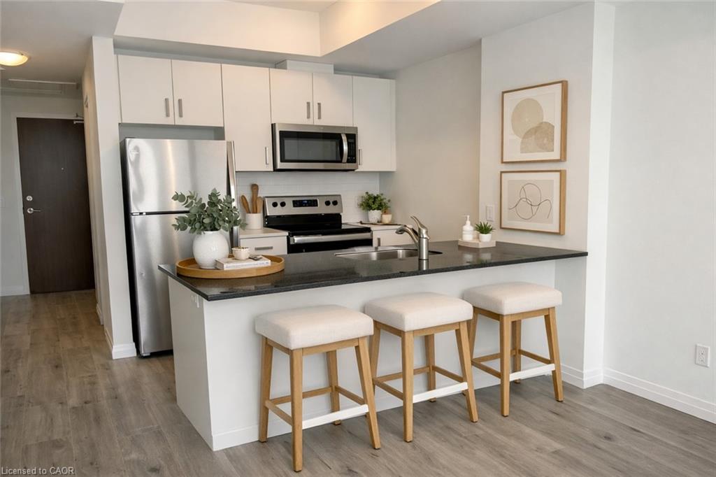 Splish Splash! Get ready for POOL season!! Live in the heart of the innovation district in Kitchener and enjoy this modern Garment St condo that offers 1 bedroom, 1 bathroom, office niche, and open concept layout. Ample nature lighting from the large windows, features include wide plank engineered flooring, upgraded cabinets to 36", granite counter top, subway tile backsplash, eat-in breakfast bar, stainless steel appliances, in-suite washer & dryer, and private balcony. Also, check out the amazing building amenities like: outdoor swimming pool, half-court basketball court, landscaped terrace with BBQ, party room & private patio, outdoor dog run with pet washing stations, fitness room & yoga/wellness studio, garbage and recycling chute. This location can't be beat as it's near light rail transit (LRT), Go-Train Station, bus transit, walking distance to the Tech Hub - Google, Desire 2 Learn, Communitech, The Tannery, walking distance to University of Waterloo School of Pharmacy and Michael G. DeGroote of Medicine (McMaster University), walking distance to downtown Kitchener, Victoria Park, City Hall, restaurants, coffee shops, and shopping. Don't delay - book your showing today!