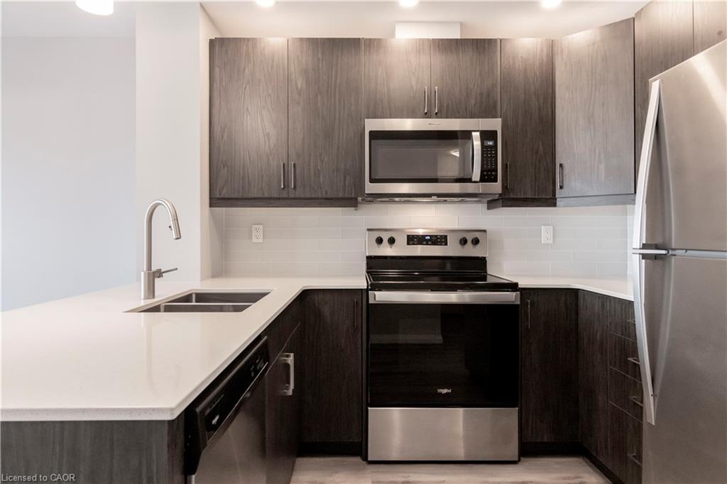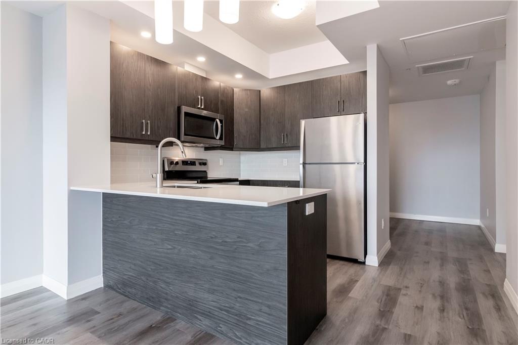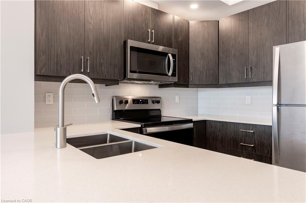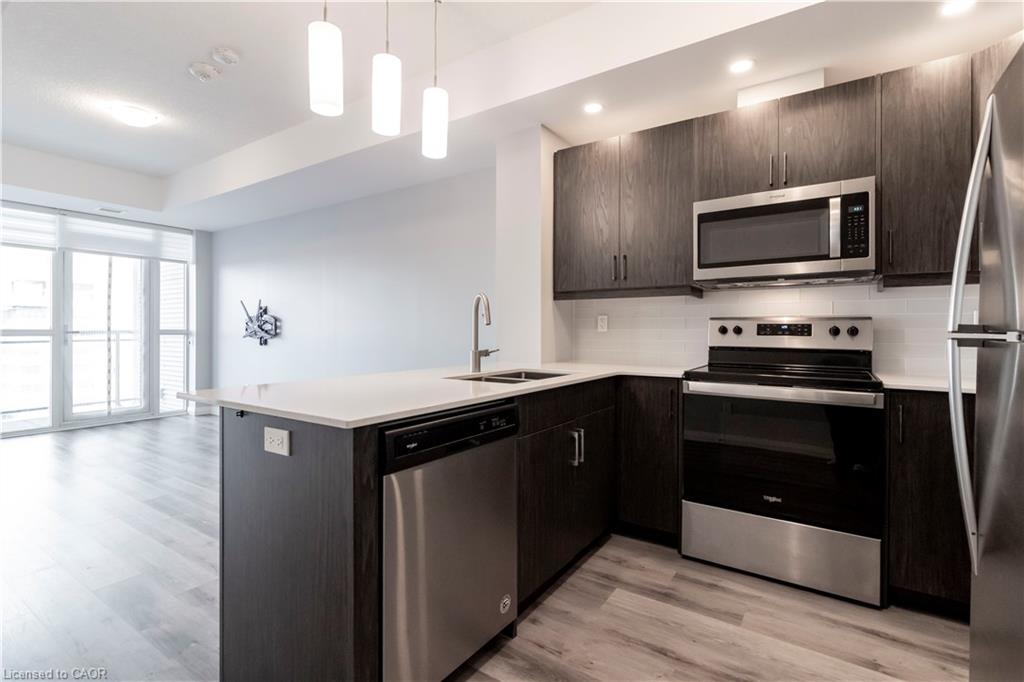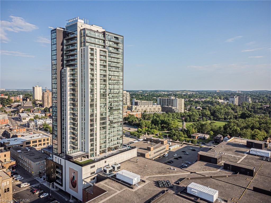 Vacant and ready to lease now! In one of downtown Kitchener's trendiest new buildings, Charlie West, here lies an opportunity to lease a condo in pristine condition. Suite 1111 is an accessible unit and offers 733 sqft of spacious interior living space with an impressive 109 sgft private balcony with eastern sunrise views of downtown Kitchener. The 1 bed/1 bath plus Den condo features upgraded flooring throughout with no carpet, a spacious kitchen with white quartz countertops, stainless steel appliances, pot lights, and a breakfast bar with seating for 3. Charlie West is an upscale, 31 story, modern glass design condominium developed by Momentum, and loaded with amenities such as a fitness centre, entertainment room, social lounge, outdoor terrace, pet run, and a concierge. There is a parking license included for underground secure parking. Situated in the heart of downtown Kitchener, you'll be immersed in a vibrant community filled with local eateries, trendy boutiques, Victoria Park, School of Pharmacy, Innovation District, and steps to the Google headquarters. Charlie West’s central location provides easy access to public transportation including the LRT and upcoming transit hub, making your daily commute a breeze anywhere in Waterloo Region or Toronto. Call today for your private showing.