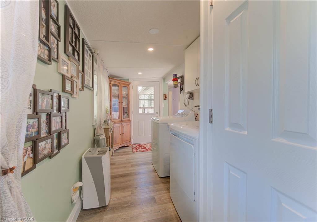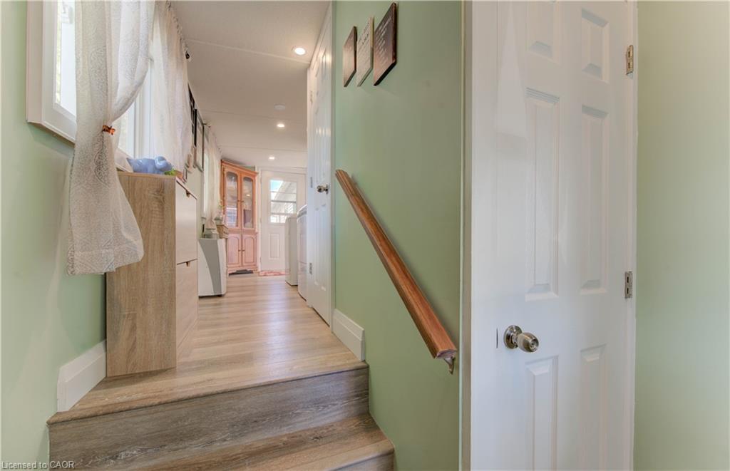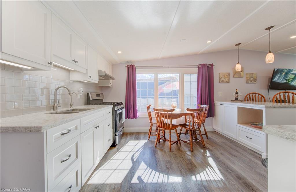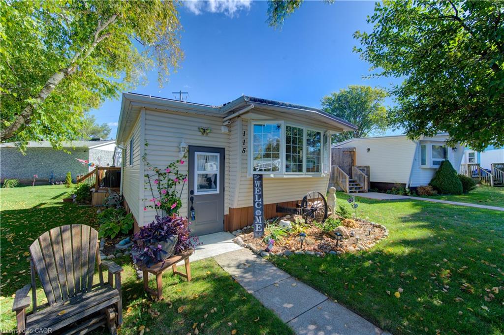 Incredible opportunity to live close to nature, in this updated and cozy home. Perfect for anyone that wants outdoor space and affordable year-round living. This lovely 2 Bedroom, fully winterized mobile home offers all the comforts and so much more than condo living. With parking for 2 and a gorgeous 10 x 30 deck (2 yrs) to relax on, you CAN have it all. Upgrades since 2021 include renovated open concept kitchen and living room, trim, pot lights, laundry and bathroom with double sink and walk-in glass shower. The kitchen boasts gas stove, tile backsplash, granite counters and breakfast bar. The living room is beautiful with Bay windows overlooking the shady front yard and gardens. With full-size washer/dryer, and a primary bedroom fully customized closet organizers and built ins, there is ample storage. The yard has multiple sheds for storing belongings and a wonderful community surrounding it. (front door 2024) roof (May 2025) Reverse Osmosis (R.O.) Water System installed Land lease fee: $775.00/mnth + common element fee $45.63/mnth payable to Park Close to expressway for easy commuting Minutes from the vibrant St. Jacobs Market and local amenities