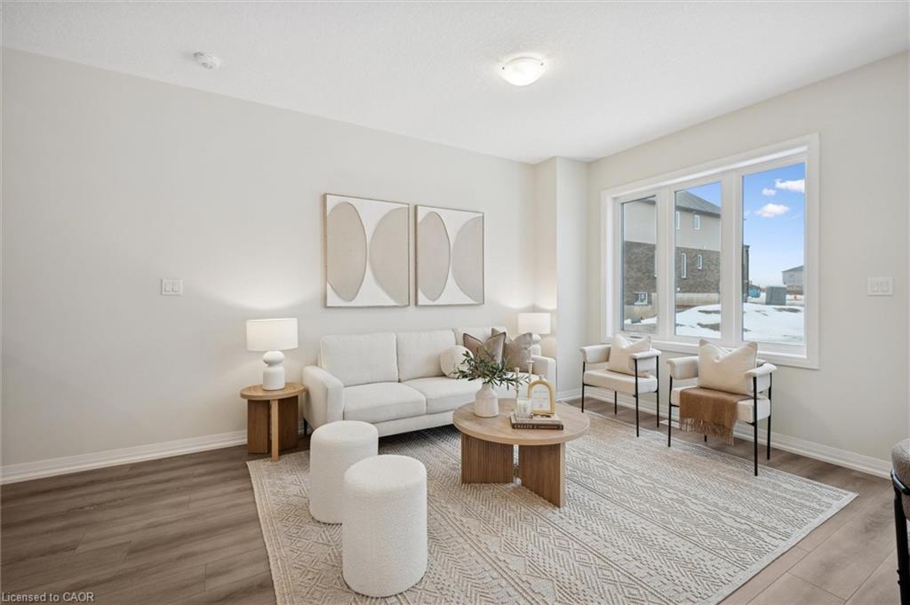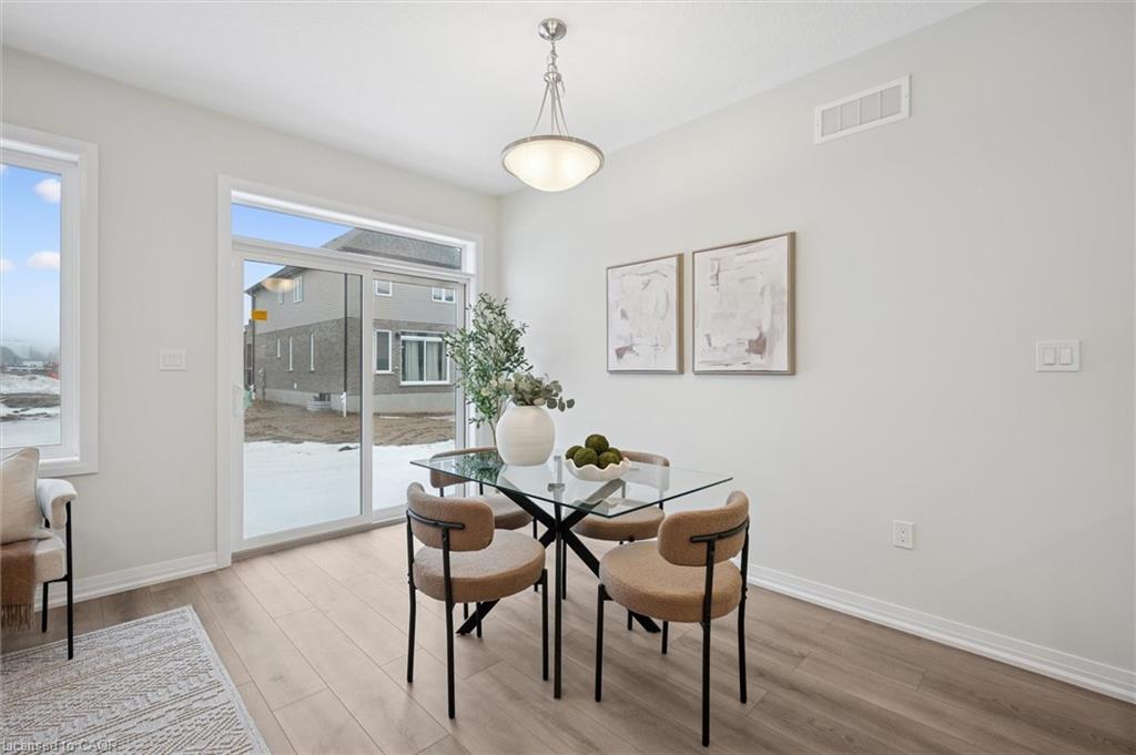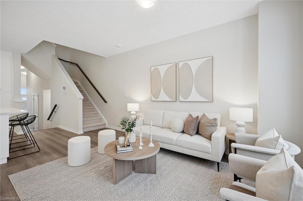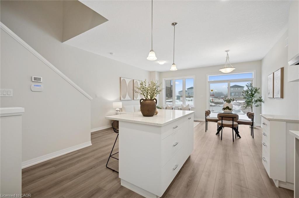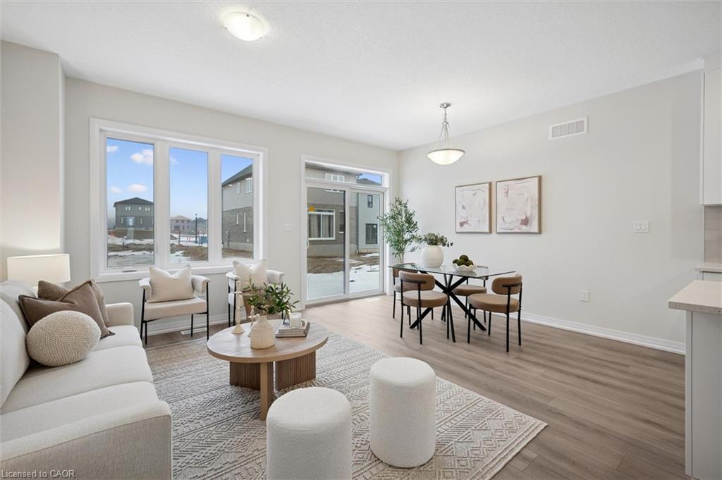 Brand new, FREEHOLD townhouse, ready now, at Harvest Park in Doon South, with finishes chosen by the builder's design team. 9 ft ceiling on the main floor, kitchen with white cabinetry, quartz countertops & island. On trend warm-tone laminate flooring on main floor. At the 2nd level, the primary bedroom is spacious and offers a large walk-in closet. The main, upstairs bath offers double vanity & quartz countertops. Three additional bedrooms complete this level. Excellent location in a sought-after neighbourhood - near HWY 401 access, Conestoga College and beautiful walking trails. Energy star certified! CURRENT PROMOTION - enjoy A FREE stainless FRIDGE, STOVE AND DISHWASHER. Sales Centre located at 154 Shaded Cr Dr in Kitchener - open Monday, Tuesday, Wednesday, 4-7 pm and Saturday, Sunday 1-5 pm. 3 bedroom, 2.5 bath version of this layout (same main floor) are also available.