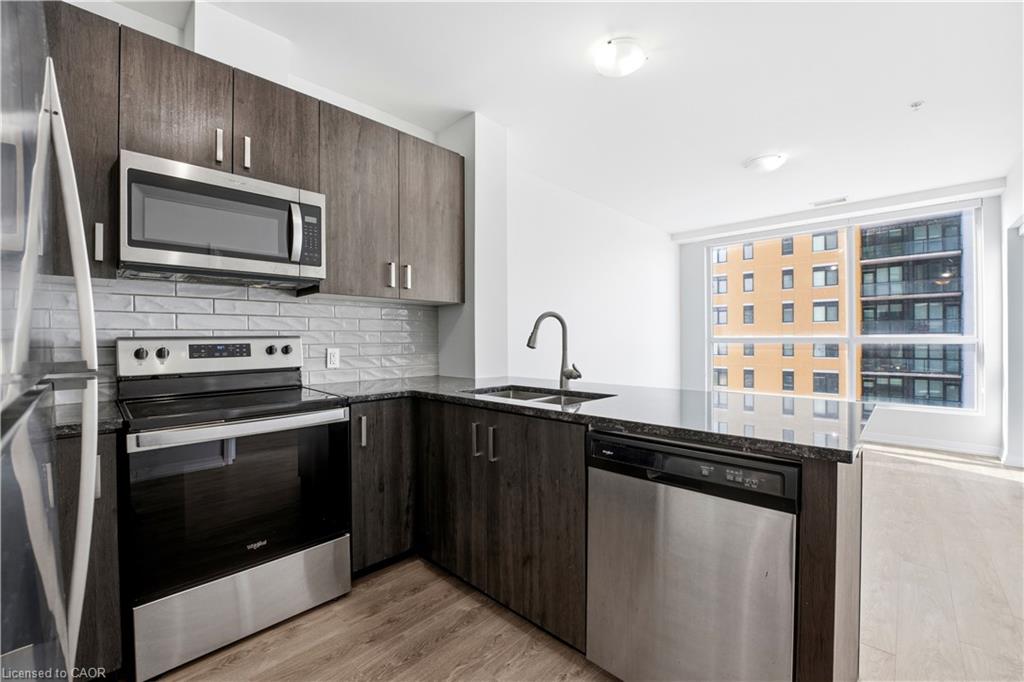 Perched high above the vibrant Kitchener skyline, this ONE-BED + DEN condo at 104 Garment St, Unit 1206 offers an exceptional opportunity in Downtown Kitchener’s most sought-after addresses. BRIGHT OPEN-CONCEPT LAYOUT enhanced by PREMIUM FLOORING AND FRESHLY PAINTED neutral tones. The contemporary kitchen offers GENEROUS GRANITE COUNTERTOPS, STAINLESS STEEL APPLIANCES, A TASTEFUL TILE BACKSPLASH, & a breakfast bar that overlooks the main living area. The spacious living room is flooded with natural light from IMPRESSIVE FLOOR-TO-CEILING WINDOWS and offers direct access to a private balcony overlooking the terrace below. The PRIMARY BEDROOM IS BOTH COMFORTABLE AND FUNCTIONAL, featuring a large walk-in closet and a GENEROUS WINDOW FRAMING ELEVATED CITY VIEWS. A versatile den provides the perfect space for a home office, reading nook, or guest area, also offering a full 4-piece bathroom, convenient in-suite laundry, and additional storage. Residents of this highly desirable building enjoy an impressive array of PREMIUM AMENITIES INCLUDING A ROOFTOP TERRACE with stunning city views, a fully equipped fitness centre, private theatre room, party room, and a stylish media lounge—perfectly suited for today’s dynamic professional lifestyle. The unit also comes complete with one underground parking space for added convenience. Ideally situated in the heart of Downtown Kitchener’s Innovation District, this prime location places you just steps from the ION LRT, Grand River Hospital, Victoria Park, and an incredible selection of restaurants, cafés, and boutique shops. With major employers such as Google and the thriving tech hub nearby, THIS LOCATION IS PERFECTLY POSITIONED FOR PROFESSIONALS SEEKING BOTH CONNECTIVITY AND LIFESTYLE. Offering the perfect blend of modern design, functional living space, and unbeatable downtown convenience, this impressive condominium is a remarkable opportunity to enjoy the very best of city living.