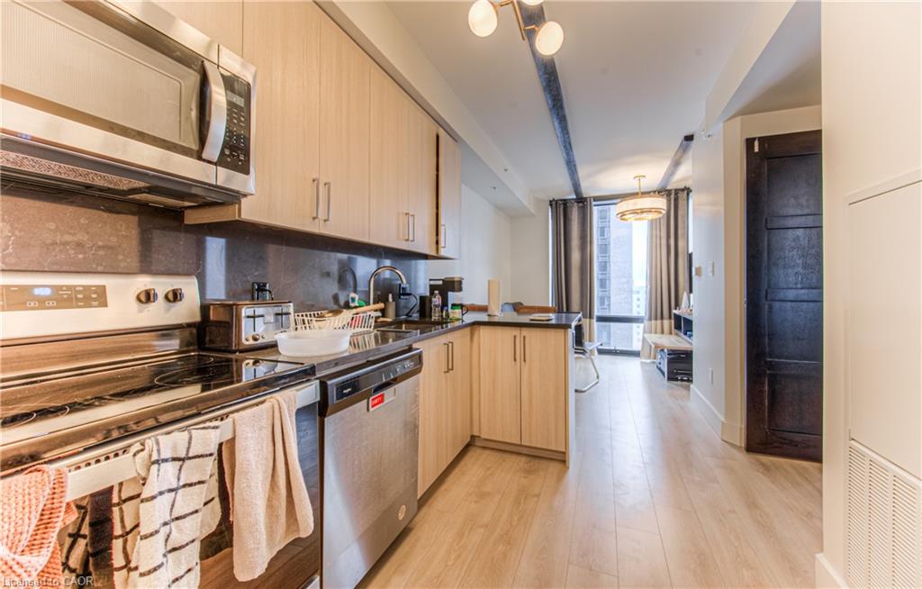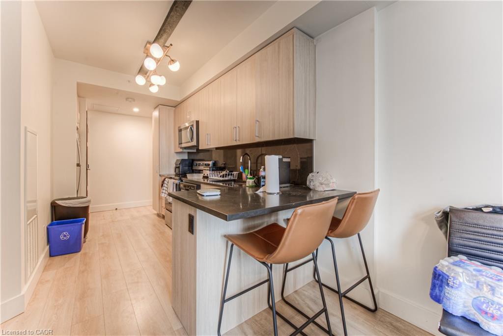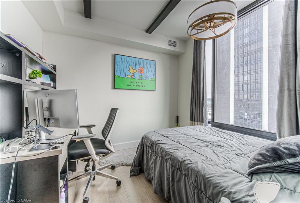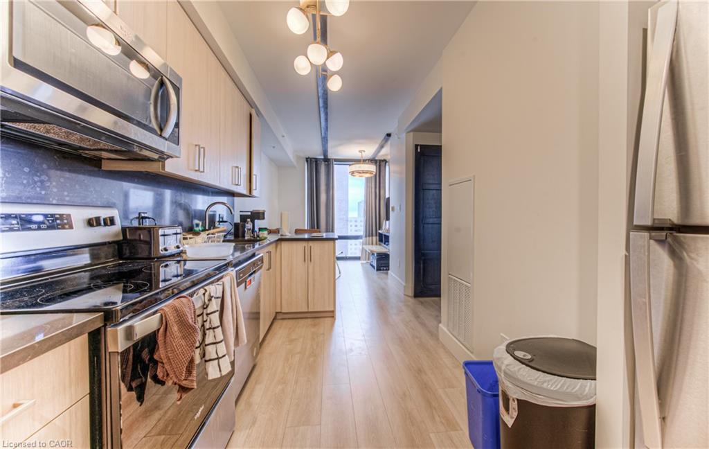 Welcome to Society 145, a brand-new luxury condominium ideally located in the heart of Waterloo, just steps from both the University of Waterloo and Wilfrid Laurier University. This rare, spacious corner unit offers a thoughtfully designed layout with 630 square feet of contemporary living space, filled with natural light through expansive floor-to-ceiling windows. The unit is adorned with high-end finishes, including hardwood floors, quartz countertops, stylish light fixtures, and rich carpentry throughout, ensuring a sophisticated and comfortable living environment. Whether you're a student, professional, or investor, this unit caters to all, offering a versatile space with a modern kitchen featuring stainless steel appliances, ample storage, and an open-concept living area perfect for entertaining. The bedroom and den (with window) are spacious. The den offers flexibility for use as a guest room, home office, or study space. Residents of 145 Society enjoy top-tier amenities, including a state-of-the-art fitness center, yoga studio, indoor basketball court, games room with billiards, ping pong, and arcade games, as well as a movie theater and business lounge. The building also features secure entry, a 24-hour concierge, and a rooftop patio with breathtaking panoramic views of the city. The ideal blend of luxury, convenience, and modern living - a perfect choice for anyone looking to invest in one of Waterloo's best buildings. With easy access to the dining, shopping, and entertainment options, this condo offers the perfect combination of comfort, convenience, and style. Don’t miss the opportunity to own in this highly desirable location with tremendous potential for growth and appreciation in value. Lease in place until December 26, 2026. Embrace the best of condo living in Waterloo at 145 Society!