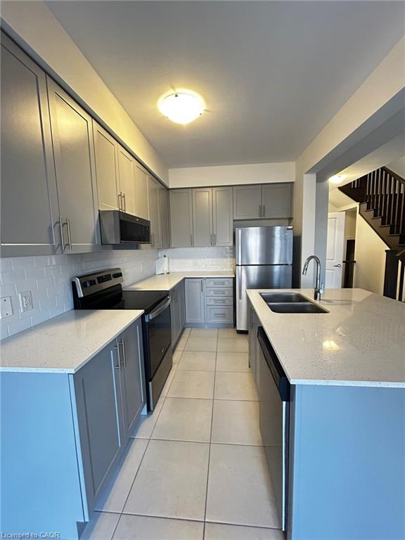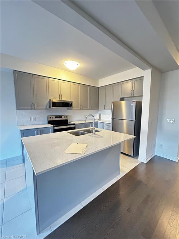 Welcome to 123 Broadacre Dr, Kitchener, a stunning end-unit townhouse available for lease in the highly desirable Huron Park neighborhood. This nearly new home offers modern elegance with hardwood flooring throughout the main floor, creating a seamless and sophisticated living space. The open-concept design features a chef-inspired kitchen with brand-new stainless steel appliances, sleek granite countertops, stylish cabinetry, and a spacious center island, perfect for both meal preparation and casual dining. Adjacent to the kitchen, the walkout deck provides a serene outdoor retreat for relaxation and entertaining. Upstairs, the primary suite is a luxurious escape, complete with a large walk-in closet and a 5-piece ensuite bathroom featuring dual sinks, a soaker tub, and a glass-enclosed shower. Two additional spacious bedrooms share a beautifully designed 4-piece bathroom, making this home ideal for families. The fully finished basement extends the living space with a large recreation room, a modern 3-piece bathroom, and extra storage, along with convenient in-unit laundry facilities. An attached garage and private driveway provide ample parking, while the home’s prime location ensures easy access to top-rated schools, shopping centers, and major highways. To enhance comfort, the landlord will provide a water softener, and AAA+ tenants with a strong credit score are preferred. This exceptional home is move-in ready—book your showing today!