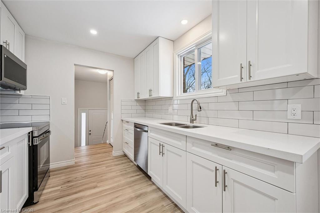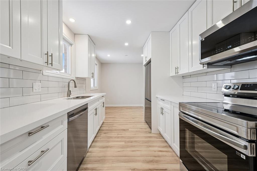 This home has been fully renovated, and is ready for its next occupant. The upper unit features a brand new kitchen with quartz countertops, all new Stainless Steel Appliances (Fridge, Stove, Dishwasher, Over The Range Microwave), oversized cupboards, and a quaint breaksfast room. The entire unit is carpet free with new vinyl flooring throughout, and the 3 bedrooms are all generous in size. All new windows, doors, and lighting throughout, along with a new 4pc bathroom and a great sized laundry with stackable washer/dryer. You also get 3 dedicated parking spots (1 garage and 1 driveway).