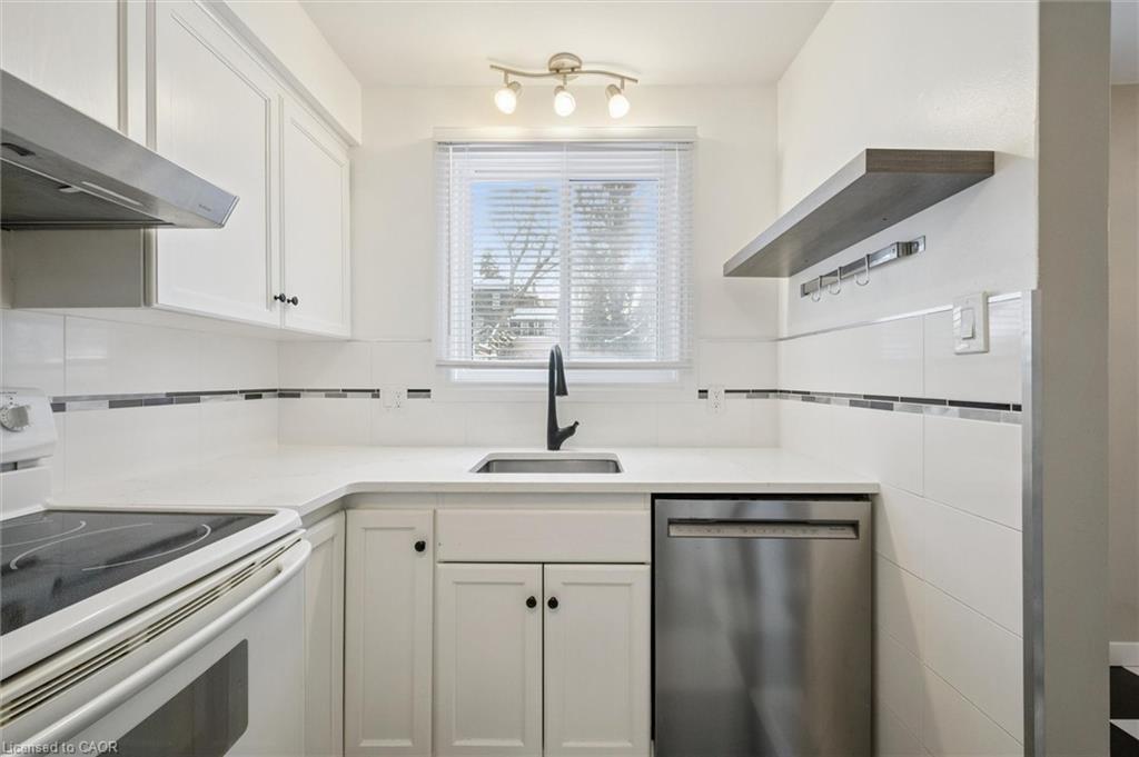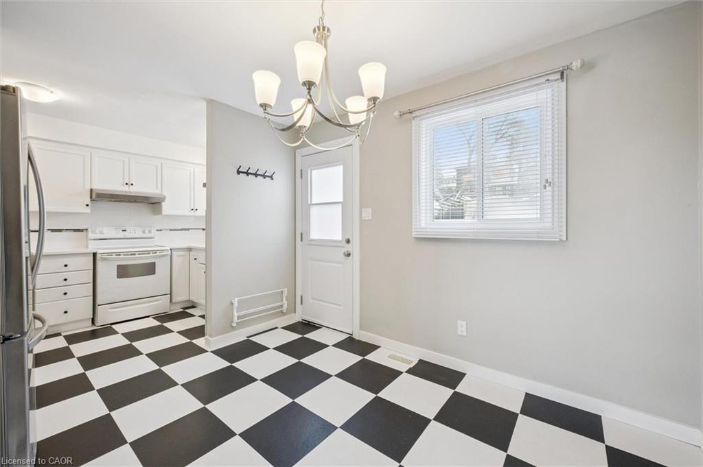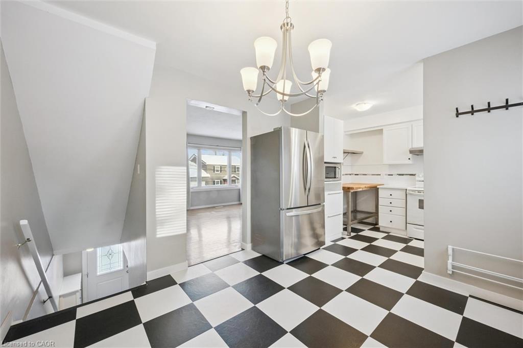This semi-detached property in desirable Hespeler combines practical updates with a highly walkable, lifestyle-driven location. The main floor has been refreshed with a clean, efficient kitchen featuring new countertops, sink, dishwasher, and fridge (2023), plus new flooring throughout the kitchen and entry level. A dedicated dining area opens directly to the backyard, while the adjoining family room is grounded by hardwood floors and a comfortable, no-nonsense layout. Upstairs, two well-sized bedrooms continue the hardwood flooring, alongside a fully renovated four-piece bath completed in 2025. The ground-level entry offers direct access to the single-car garage and extra storage. Out back, the fully fenced yard is low-maintenance and functional, complete with a deck off the dining room that's built for easy entertaining or quiet downtime. Parking for four vehicles in the driveway is a standout rare feature in this category. Key updates include a paved driveway (2017), new windows and doors (2017), furnace and A/C (2017), stair carpeting (2023), and a 2025 roof inspection with flashing repairs completed. Easy 401 access, walkable shops and restaurants, the Grand River across the street, and nearby trails round out a location that truly delivers.