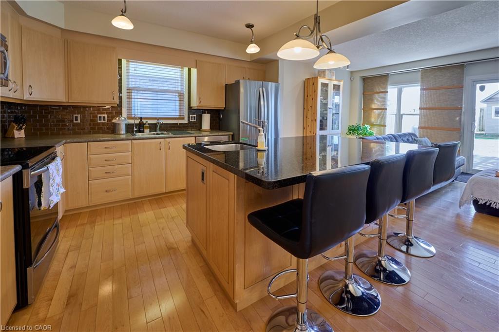 Welcome to a home designed for real life, offering nearly 2,500 sq ft of finished living space in Kitchener’s desirable Activa/Laurentian West neighbourhood. From the inviting front porch to the bright, open interior, this home delivers comfort, function, and room to grow. Step inside to a spacious entry with natural stone flooring, leading into expansive open-concept living areas. The kitchen is a true centrepiece, featuring stainless steel appliances, hardwood cabinetry, and a massive granite island with seating and additional storage, perfect for everyday living and entertaining. Pre-plumbed for a reverse osmosis system, it’s designed with both convenience and quality in mind. The living room offers a wall of windows overlooking the large, south-facing backyard, filling the space with natural light. Step out to the deck with a pergola wrapped in mature greenery, creating a private and inviting outdoor setting ideal for relaxing or hosting. The shed is wired with hydro for any hobbyist. Upstairs, you’ll find a versatile open loft space with vaulted ceilings and abundant light, perfect as a family room, home office, or multi-use area. The generous primary bedroom features a walk-in closet with its own window, while the bright main bath serves as a cheater ensuite. Hardwood flooring and natural maple stairs add warmth throughout. The finished basement provides additional flexible space for movie nights, a playroom, or comfortable space for guests. Set on the edge of the city with a touch of country feel, this location offers easy access to schools (both public and Catholic), parks, and trails including Huron Natural Area for hiking and outdoor escapes. Minutes to Sunrise Centre for everyday shopping, with quick access to the expressway and Highway 401 for an easy commute. Solar system in place under existing agreement with modest annual payment and no maintenance responsibility during term, with ownership transferring to the homeowner at the end.