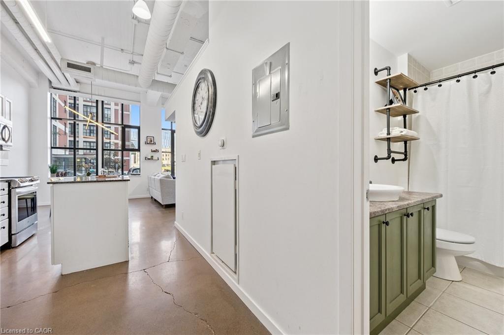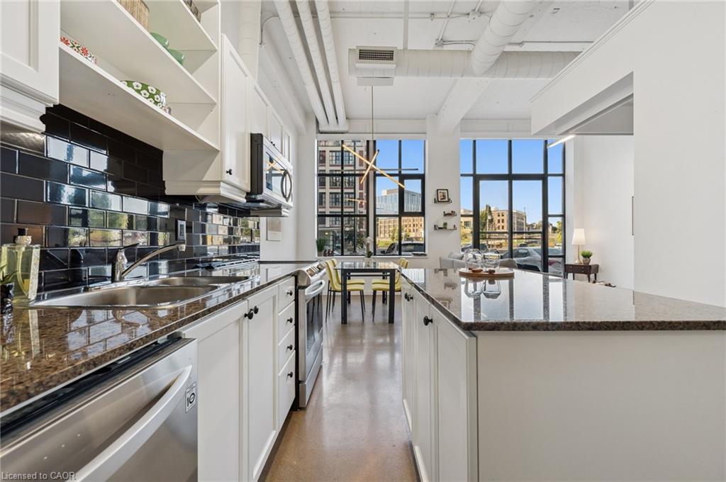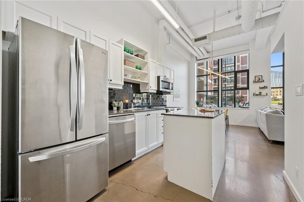 Unit 128 welcomes you with soaring 13' ceilings, striking black-framed windows, and polished concrete floors that highlight the building’s industrial roots, while a fresh kitchen and newer appliances add a sleek, contemporary touch. Natural light floods the open-concept floor plan, and a Juliette balcony brings the downtown energy right to your living space. Perfect for professionals, university students, or downsizers who want to be at the center of it all, this loft offers unbeatable access to Kitchener’s thriving tech hub—including Google just steps away—as well as the city’s best restaurants, cafés, shopping, and nightlife. With the LRT right outside your door, commuting is effortless, and you’re just minutes from the GO Station and Highway 7/8.