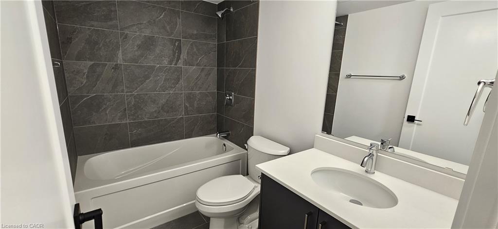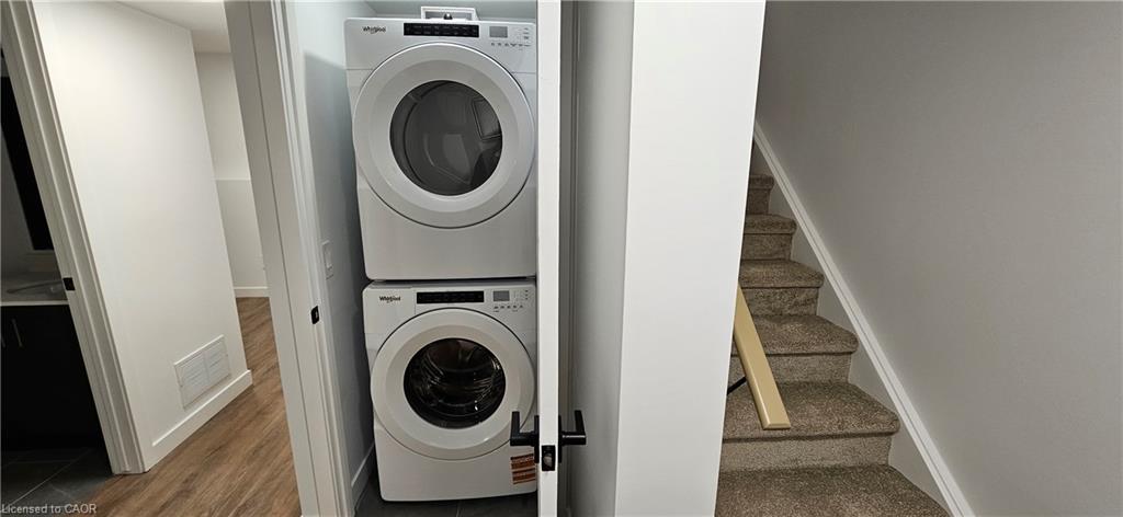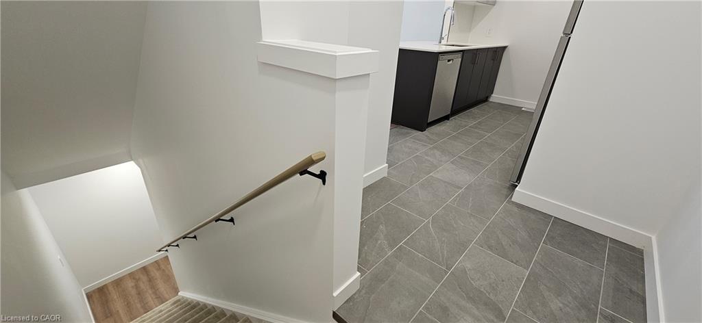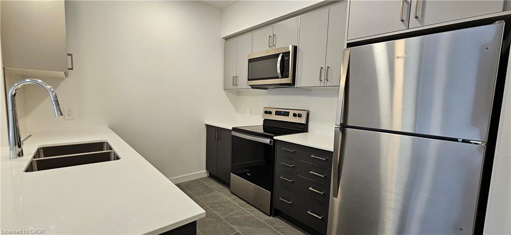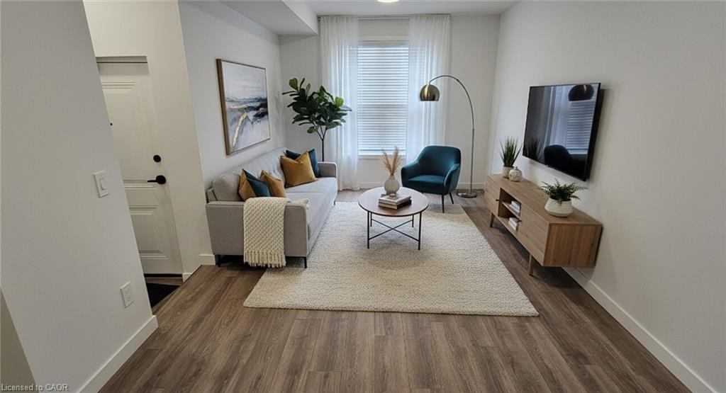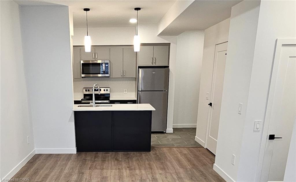 FOR LEASE IN THE VIBRANT NEW VIVA COMMUNITY. Experience modern living at VIVA, the newest and brightest addition to Downtown Kitchener. Located on Mill Street, this exclusive community offers the perfect balance of nature, neighbourhood, and nightlife. Step outside and instantly connect with the Iron Horse Trail—ideal for walking, running, and cycling—and enjoy quick access to parks, green spaces, the iON LRT, and all the vibrant amenities that downtown has to offer. Victoria Park is also just moments away, featuring scenic grounds, recreation areas, and seasonal activities. This beautifully crafted Monstera END model stacked townhome features a bright open-concept main floor designed for both comfort and entertaining. The kitchen is thoughtfully appointed with quartz countertops, a breakfast bar, stainless steel appliances, and ceramic and luxury vinyl plank flooring throughout. Offering 1032sq. ft., this unit includes 1 bedroom + a den—perfect for a home office or reading nook—and 1.5 bathrooms. Live in a professionally landscaped community where peaceful residential living meets the convenience of city life. Whether you’re grabbing your morning coffee, running errands, or heading to yoga in the park, everything is within reach. Heat, hydro, water, and hot water heater are to be paid by the tenant(s). Good credit is required, and a full application must be submitted. AVAILABLE immediately! Photos are virtually staged AND a likeness from the interior unit.