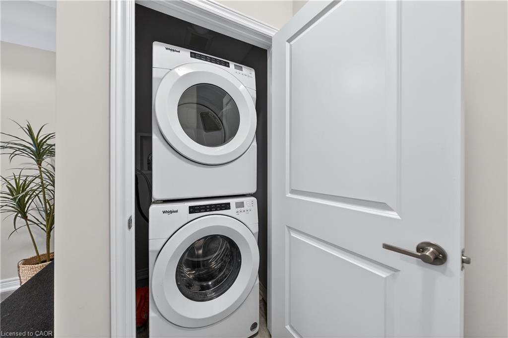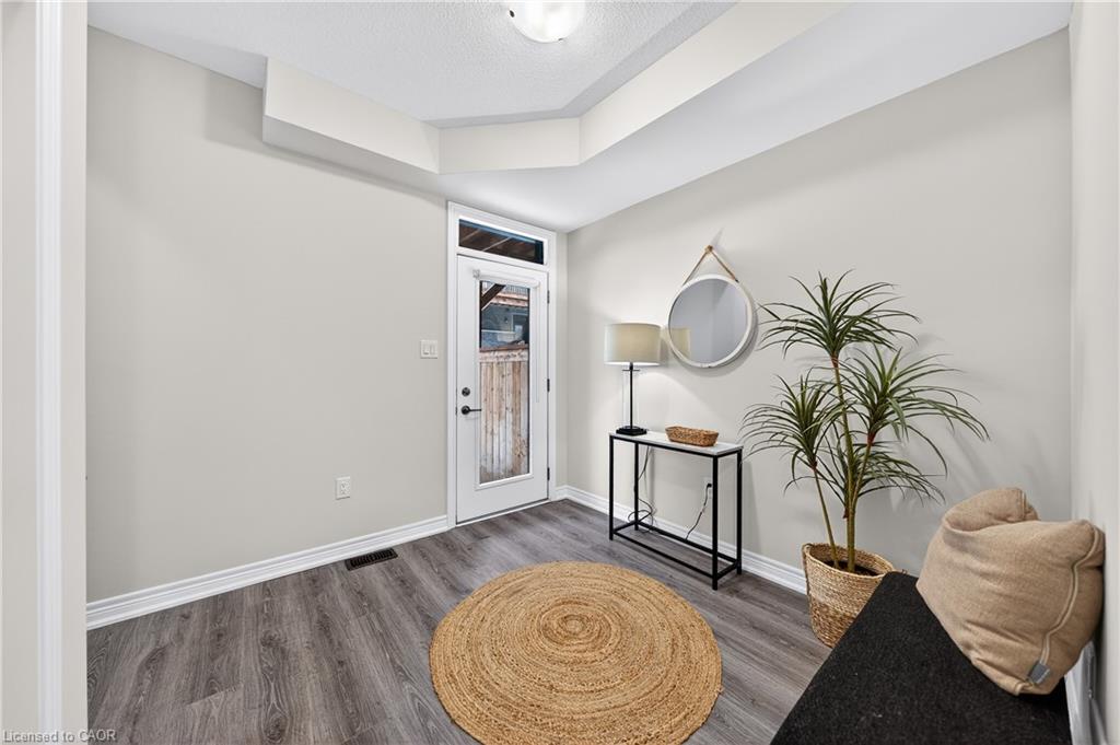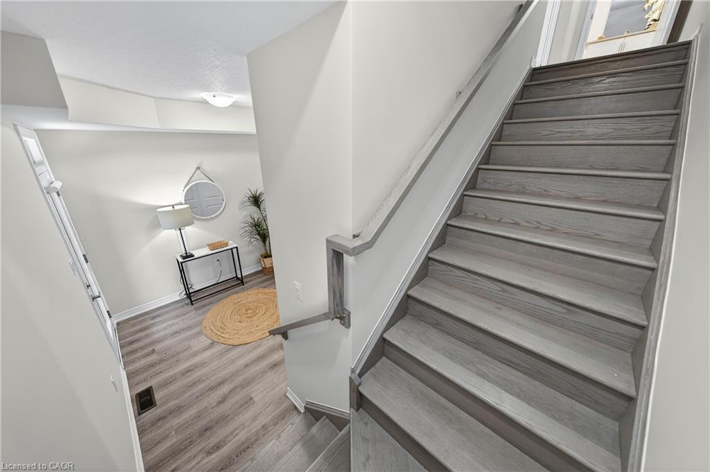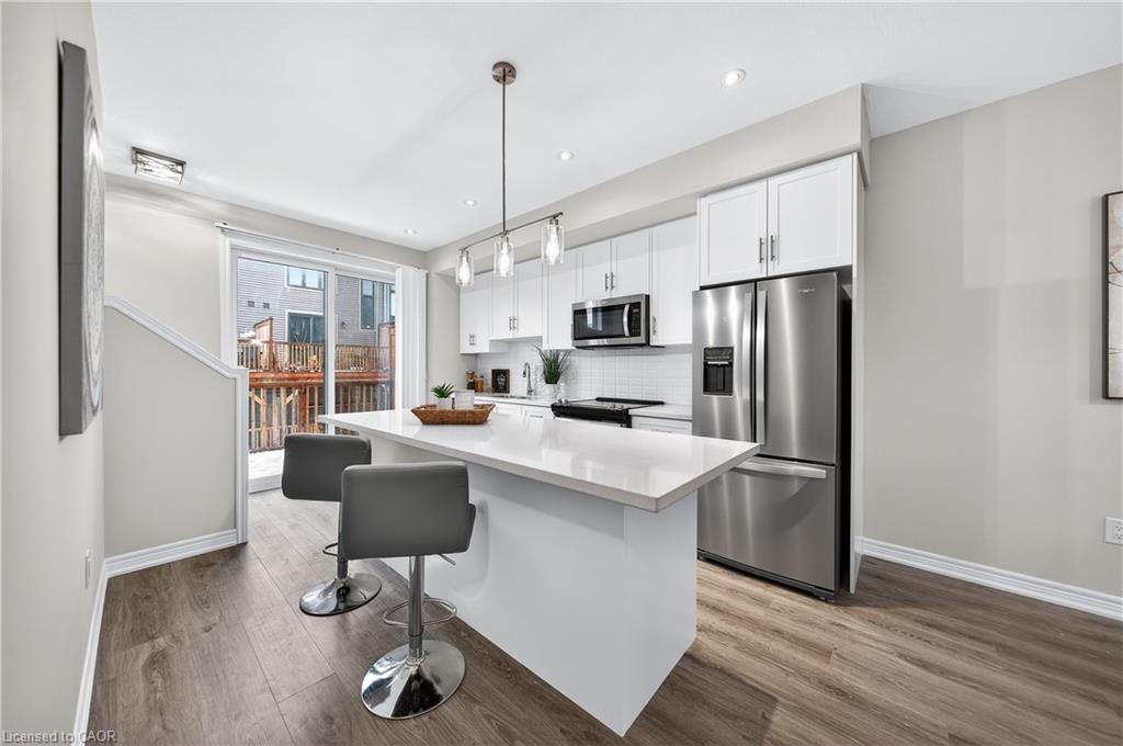 Welcome to this exceptional, move-in ready townhome nestled in one of Cambridge’s most desirable communities. Thoughtfully designed for modern living, this bright and beautifully appointed home features 9 ft ceilings, elegant finishes, and a spacious open-concept layout that seamlessly blends style, comfort, and everyday functionality—perfect for first-time buyers, growing families, or professionals. The main living level impresses with an abundance of natural light streaming through oversized windows, highlighting a warm and inviting living space anchored by a sleek electric fireplace. The contemporary white kitchen is both stylish and practical, showcasing quartz countertops, a large centre island with breakfast seating, stainless steel appliances, subway tile backsplash, and ample cabinetry, all complemented by convenient roll-down blinds. Step outside to the private rear deck with privacy side panels, offering a peaceful retreat for relaxing or entertaining. A hardwood staircase leads to the upper level where three generously sized bedrooms provide comfort and versatility, each featuring large windows and neutral décor. The 4-piece bathroom includes a quartz vanity, soaker tub, and ceramic tile shower surround. Excellent location approximately 35 minutes to Mississauga, 15 minutes to University of Waterloo and Wilfrid Laurier University, and 20 minutes to University of Guelph. Walking distance to Walmart, Home Depot, Tim Hortons, Canadian Tire, Starbucks, and numerous shops, dining, and everyday amenities.