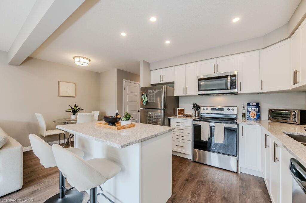 The main floor features a generously-sized kitchen equipped with stainless steel appliances, quartz countertops, and ample cupboard space. This