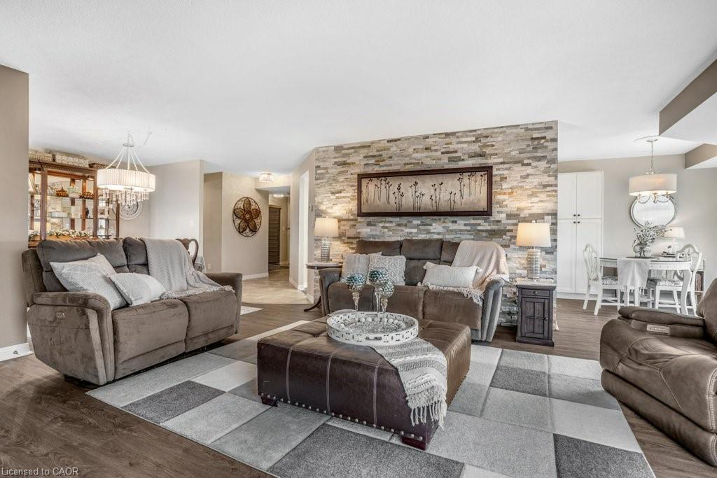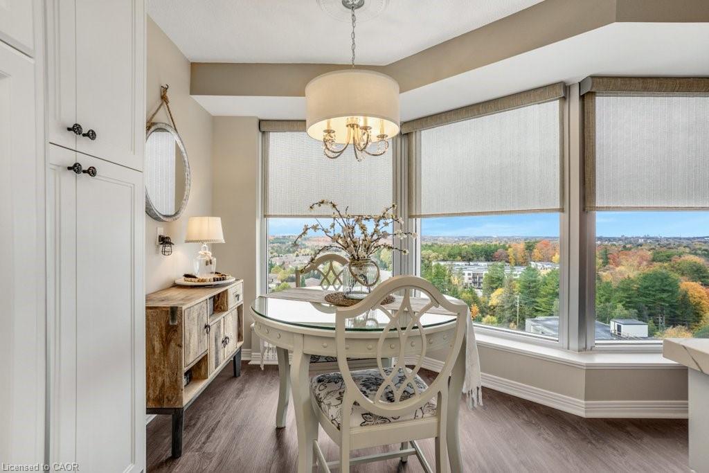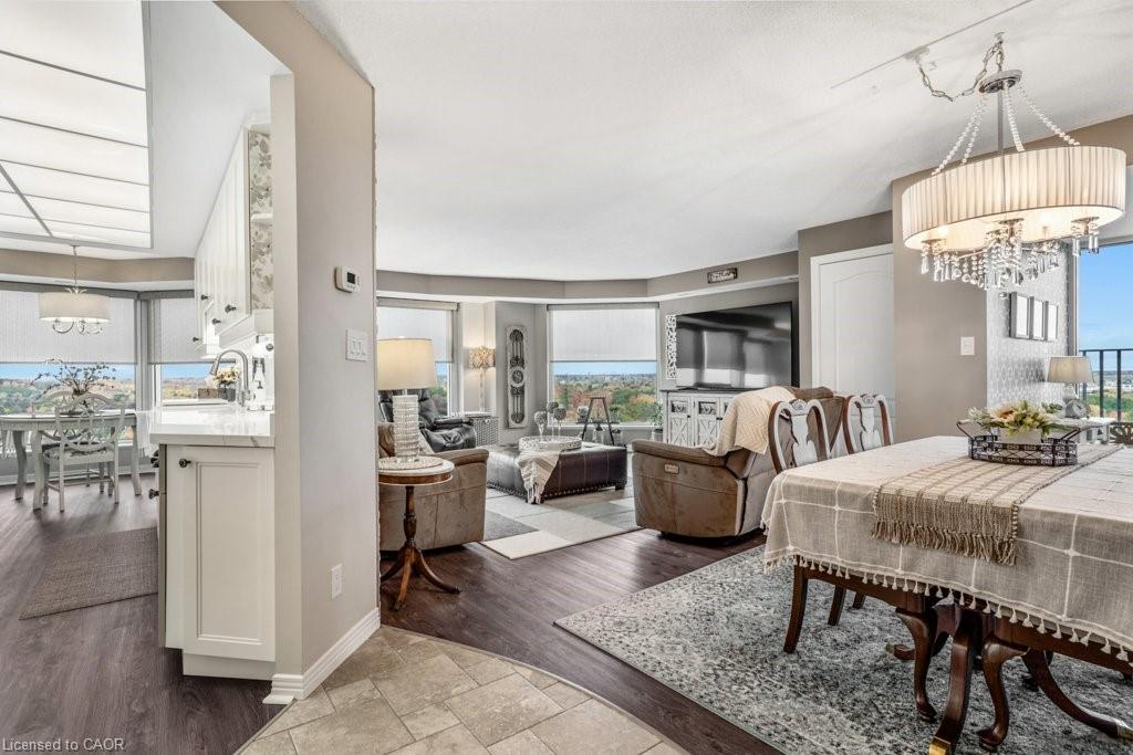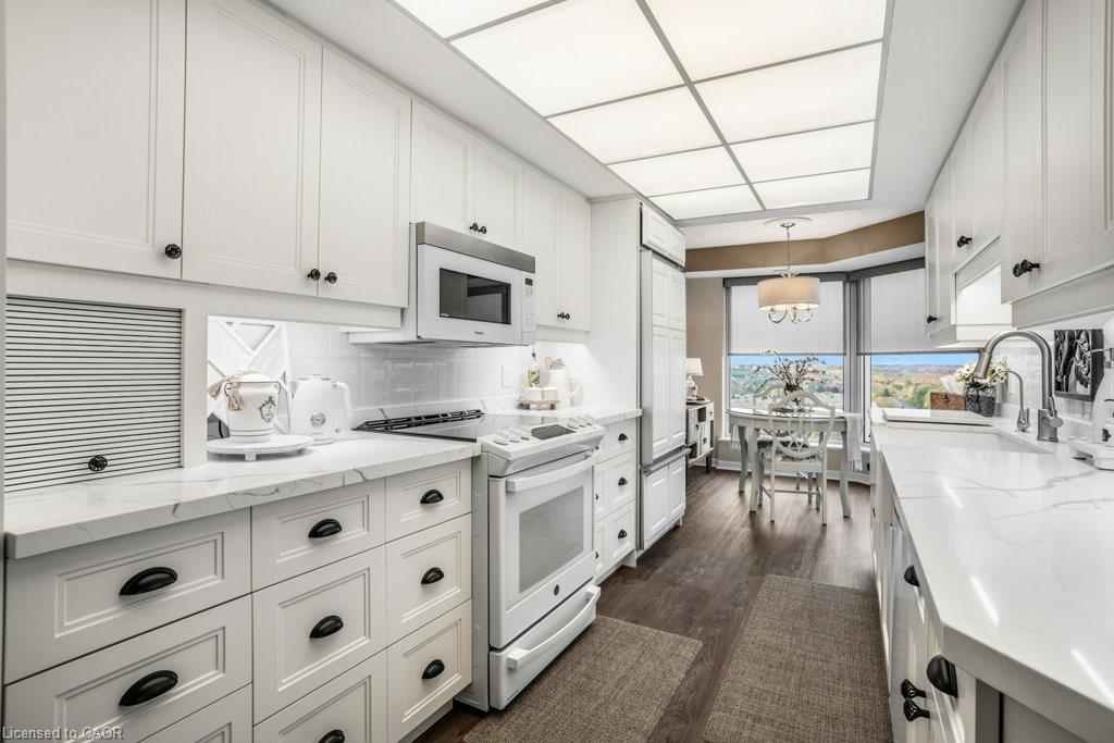 Transition seamlessly into condo living with this outstanding end unit in the prestigious Black Forest Building, located in the vibrant heart of Cambridge. This spacious 1,572 sq. ft. suite, renovated in 2023, is bathed in natural light from three sides of windows, creating sun-drenched rooms and offering spectacular views to the east, west, and north. The kitchen features updated white cabinetry, a pantry, sleek quartz countertops, newer appliances with an original Sub-Zero fridge and tile back splash. Entertain easily with a separate dining room and a large, inviting living room; perfect for gatherings and everyday comfort. Retreat to the luxurious primary bedroom suite, complete with a walk-in closet, linen closet, generous bedroom space, and an updated en-suite bath boasting a tiled shower with glass doors & double sinks. A second closet is located at the far end of the ensuite. A second king-sized bedroom and another full bathroom provide ample space for family or guests. Enjoy in-suite laundry, a large front hall closet with some storage, two underground parking spots, and a separate storage locker. The Black Forest Building offers controlled entry for peace of mind, an indoor pool, tennis/pickleball court, exercise room, his & hers saunas, library, workshop, BBQ/Gazebo, pool table, walking trails, a hospitality room, and a rentable guest suite for visitors. Steps away from the YMCA and Cambridge Mall, with restaurants, shopping, and Highway 401 just minutes away, this location offers convenience and connectivity to all that Cambridge has to offer. Be sure to review the marketing video, floor plans, and 360-degree photography for a complete picture of this exceptional property.