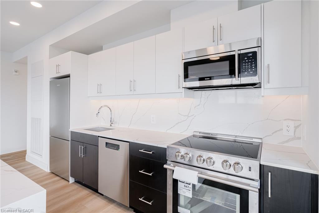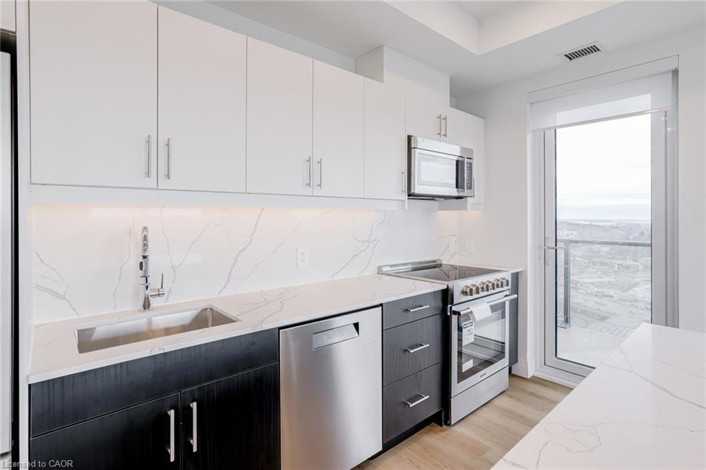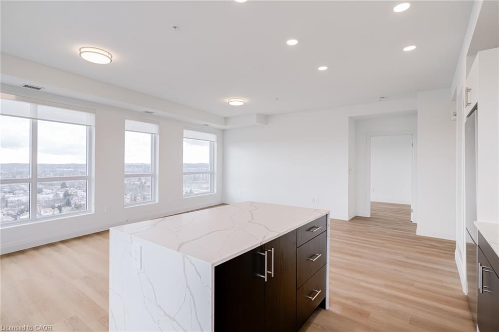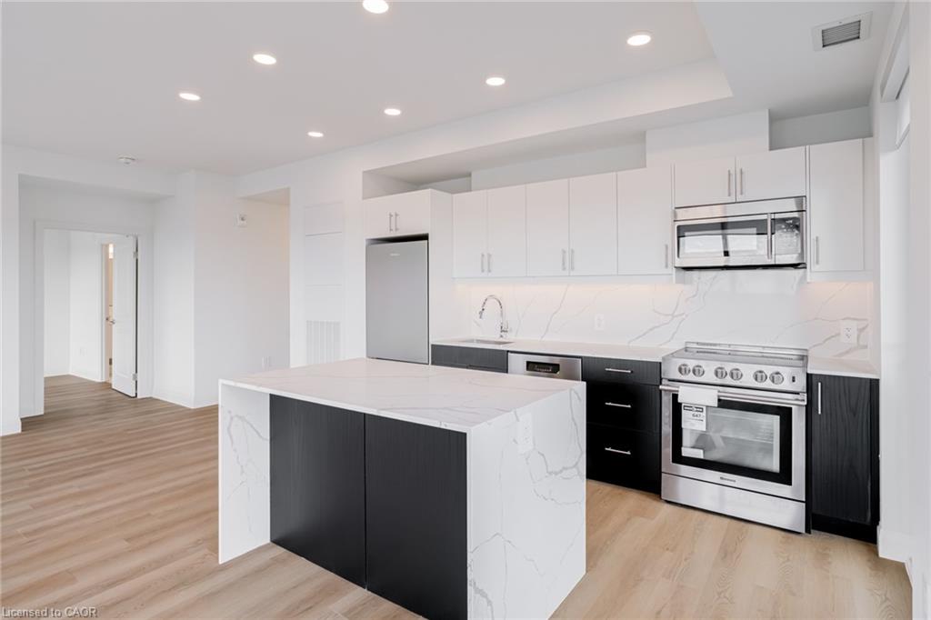 DISCOVER WEBER YARDS — Kitchener’s newest 15-storey condominium! FIRST MONTH RENT FREE ON A 13-MONTH LEASE, plus FREE STORAGE LOCKER USE FOR ONE YEAR! Suite 1504 is a rare top-floor corner penthouse that truly stands out. This luxurious 2-bedroom, 2-bathroom suite is packed with upgrades and offers 1,129 sq. ft. of beautifully designed living space with an exceptional layout. With oversized windows and sweeping city views, the suite is flooded with natural light. The open-concept kitchen, dining, and living area is made for entertaining, featuring striking two-tone cabinetry (white uppers, dark lowers), sleek quartz countertops with matching backsplash, a stunning waterfall island, and premium upgraded Blomberg stainless steel appliances. Custom window coverings are also included. Enjoy the convenience of in-suite laundry and a private balcony for added outdoor living space. Centrally located in Waterloo Region, you’ll enjoy quick access to Highway 7/8 and the 401, making commuting fast and convenient. Shopping is effortless with Fairview Park Mall just minutes away, and public transit is highly accessible with nearby bus stops. Everyday essentials are within walking distance, including Zehrs, Dollarama, Fit4Less Gym (24/7), Shoppers Drug Mart, Tim Hortons, FreshCo, and The Beer Store. Luxury building amenities include 24/7 concierge, a fitness studio, shared workspace, dog wash station, and an impressive party room complete with a full kitchen, dining area, and lounge. Parking is available at an additional cost and spaces are limited. Tenant pays utilities. Excellent credit is required and a full application must be submitted. Book your private tour today!