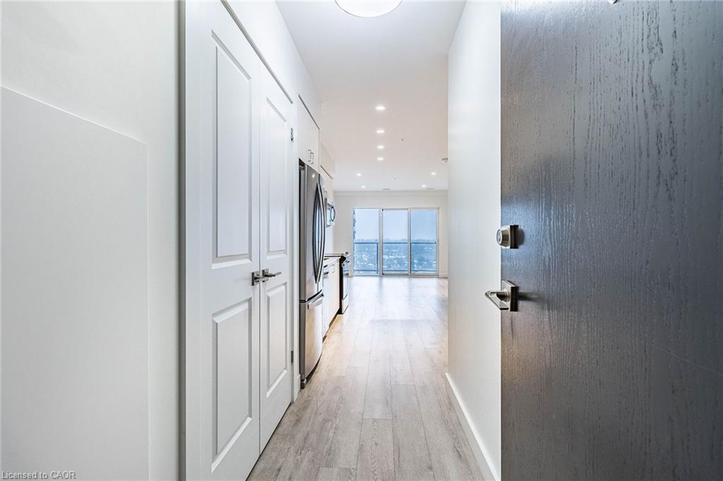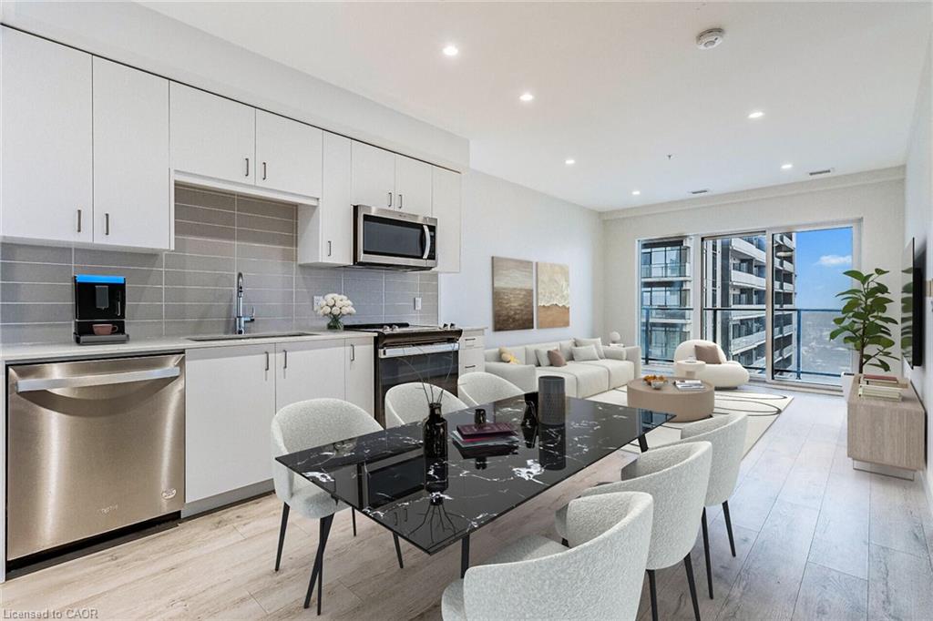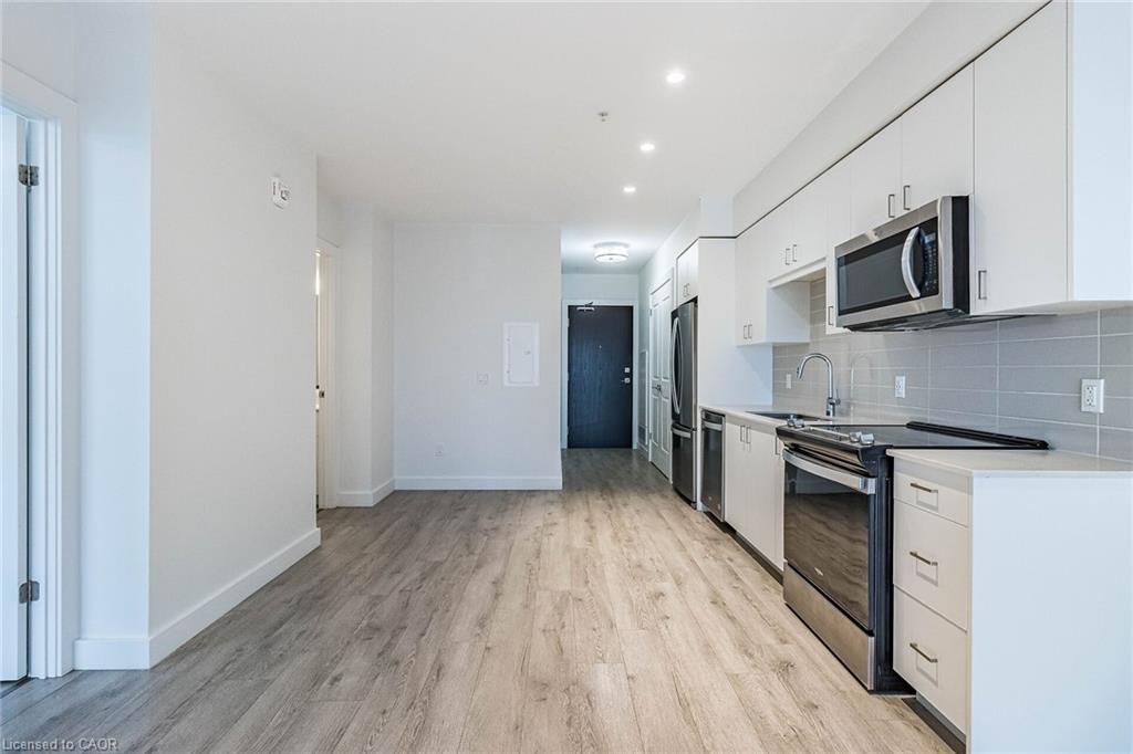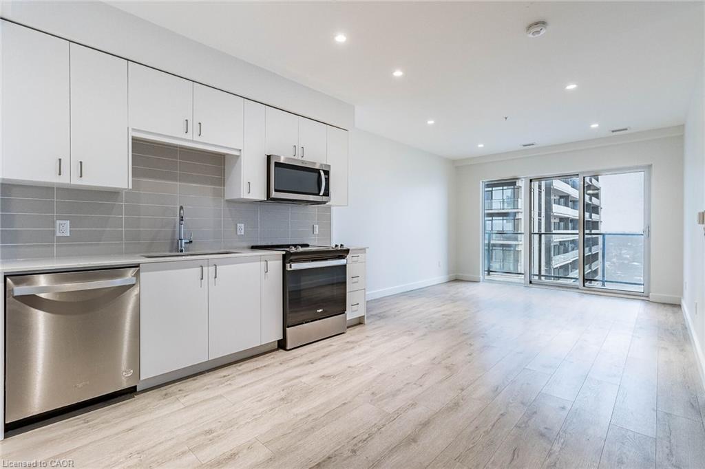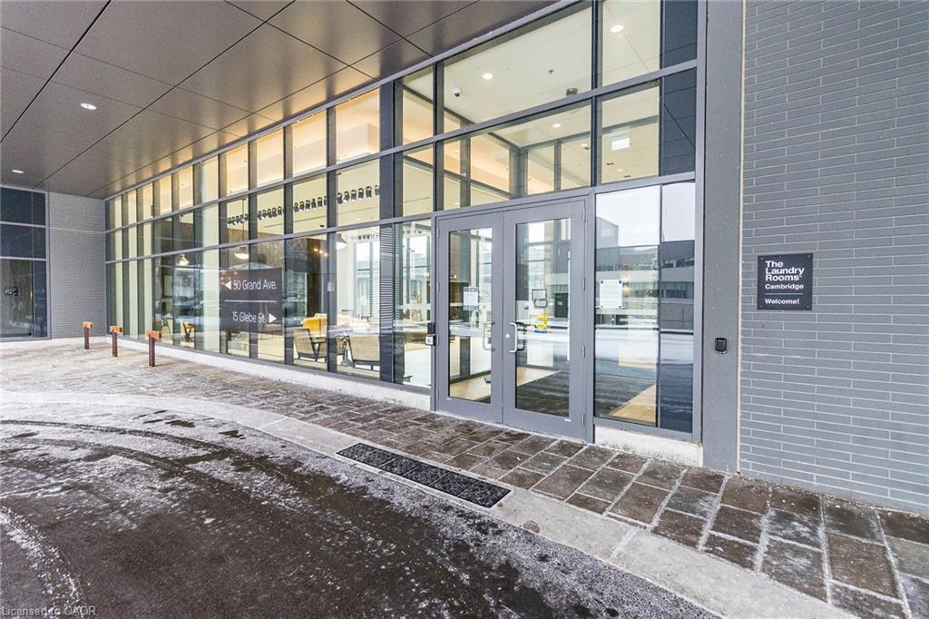 Welcome to the Gaslight District in historic downtown Galt - one of Cambridge's most sought-after communities, known for its vibrant atmosphere, dining, entertainment, and year-round events. This spacious 1-bedroom suite offers 804 sq. ft. of total living space (676 sq. ft. interior + 128 sq. ft. balcony) with 9' ceilings, a bright open-concept layout, and floor-to-ceiling windows showcasing panoramic views of the Grand River and historic downtown Galt. Enjoy two private balconies, accessible from both the living room and bedroom - the perfect place to unwind and take in the beautiful river and city views. The modern kitchen features quartz countertops, quality cabinetry, a ceramic tile backsplash, an undermount sink, and upgraded stainless steel appliances, seamlessly connecting to the open living space for everyday comfort. Additional highlights include in-suite laundry, a walk-in closet, and 1 underground parking space. Residents enjoy exclusive access to an impressive collection of amenities, including a fully equipped fitness centre, yoga studio, games room with pool table and ping pong, resident lounge/party space, and private meeting/work rooms - plus a spacious outdoor terrace with pergolas, fire pits, BBQs, and lounge seating overlooking Gaslight Square. Enjoy a truly walkable lifestyle with restaurants, cafes, entertainment, boutique shops, public transit, and scenic river trails just steps away. This is an outstanding opportunity to own in one of Cambridge's most vibrant and distinctive communities, where historic charm meets modern living. Some photos virtually staged.