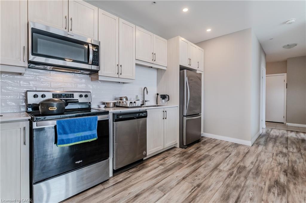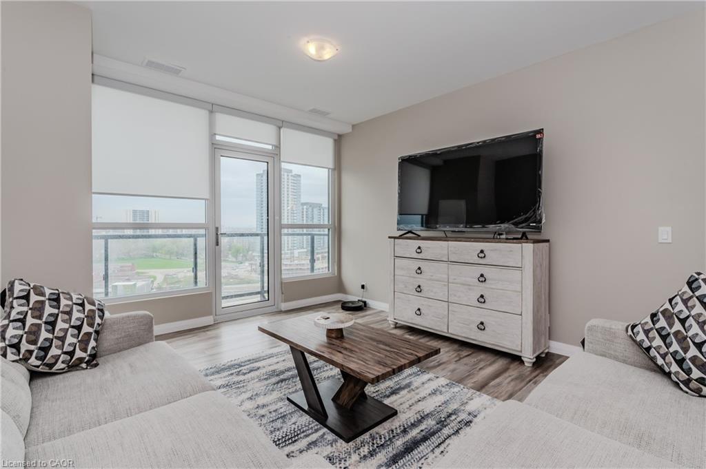 Welcome to the desirable 104 Garment St building, where you will find this elegant 2bed + 2bath condo! This spacious unit is sure to meet all your lifestyle needs. The open concept floor plan is ideal for entertaining, relaxing or working from home. This unit features a spacious kitchen, with lots of storage including a built in pantry cabinet. The sleek stainless steel appliances and stone countertop put the finishing touches on this well thought space. Just off the kitchen is a spacious living room, with large windows letting in lots of natural light. Looking to enjoy relaxing or dinner on the balcony? This large North West facing balcony is the perfect place to enjoy. Off the main living spaces, find two large bedrooms. The primary bedroom features dual closets and a 3 pc ensuite bathroom. The best part about the 104 Garment street condos is the bonus 7'x3'7" storage room, perfect to store and pack seasonal decor and so much more. Experience the luxury amenities this condo has to offer including a media room, party room, fully equipped gym and gorgeous rooftop patio complete with BBQ's and loungers; you will definitely want to spend summer nights watching the sunset here. Just moments outside of the building, see all that downtown Kitchener has to offer, with local eats, shopping, boutiques and so much more within walking reach. You are not going to want to miss out on this opportunity, so book a showing today to see all this modern condo unit has to offer you!