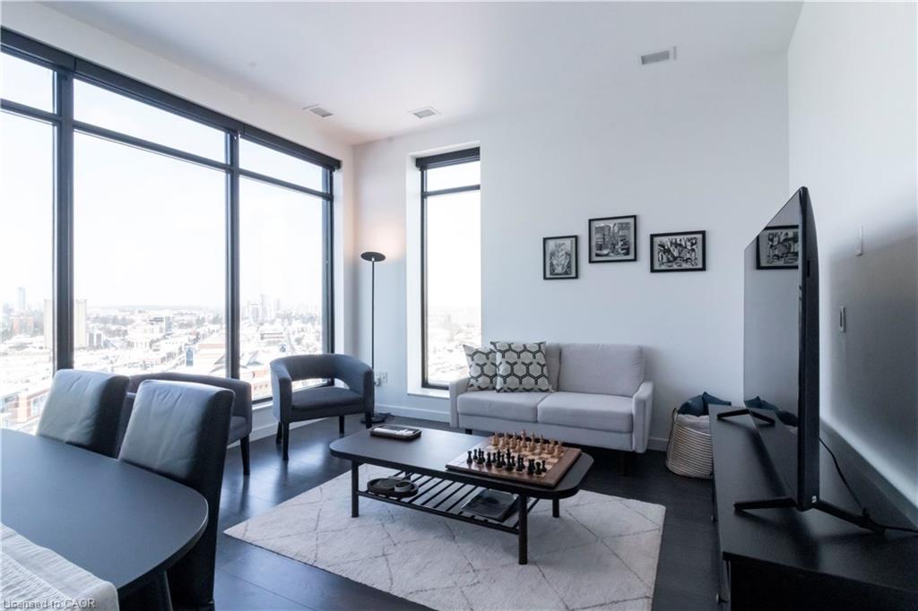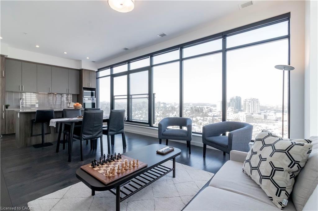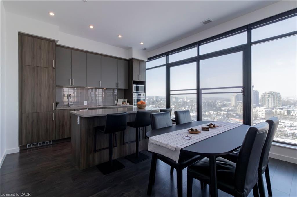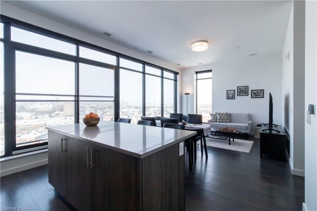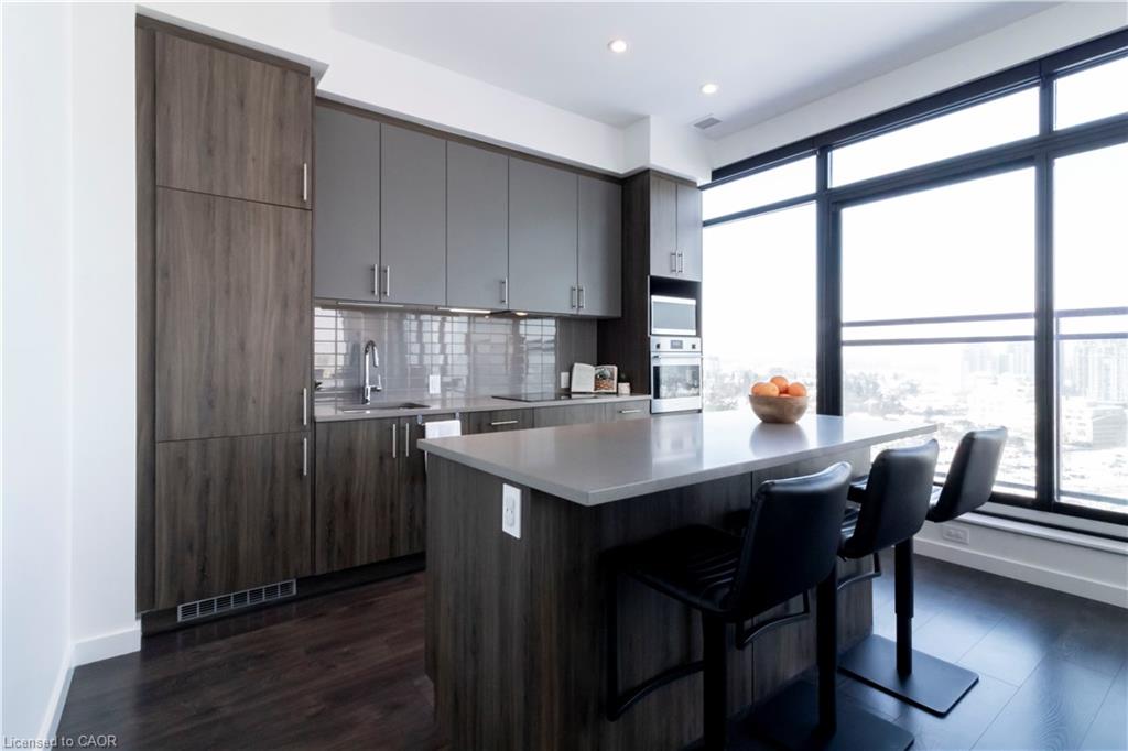 Welcome to Circa 1877, one of Uptown Waterloo’s most prestigious condominium residences, where refined urban living meets contemporary luxury. Suite 1513 at 181 King Street offers an exceptional blend of sophisticated design, generous space, and the rare convenience of two dedicated underground parking spots. From the moment you step inside, soaring 10-foot ceilings set the tone for a residence that stands apart from the ordinary. This beautifully appointed 2-bedroom, 2-bathroom suite offers 1,250 square feet of elegant interior living space, complemented by two private balconies with breathtaking northwestern views and stunning nightly sunsets. The expansive open-concept layout is thoughtfully designed for both everyday living and upscale entertaining, filled with natural light from floor-to-ceiling windows and finished with premium, carpet-free flooring throughout. The chef-inspired kitchen is a true centerpiece, featuring sleek European built-in appliances, quartz counters, and a large island with ample seating. The spacious bedrooms provide comfort and style, each with built-in wardrobes and commercial-grade automatic roller shades throughout, including blackout options in the bedrooms. The primary suite includes a well-appointed 3-piece ensuite for added privacy and convenience. Additional highlights include a versatile den, a stylish bar area complete with a KitchenAid beverage cooler/freezer and wine fridge, smart WiFi thermostats and lighting controls, in-suite laundry, and a private storage locker. Residents of Circa 1877 enjoy exceptional amenities, including an outdoor saltwater pool with cabanas and BBQ area, a fully equipped fitness centre, yoga studio, co-working spaces, and a social lounge. Perfectly situated in the heart of Uptown, you’re just steps from Vincenzo’s, boutique shops, cafes, restaurants, the LRT, and Waterloo Park. Enjoy the added luxury of having Lala Social House right at your doorstep. This is urban living at its finest.