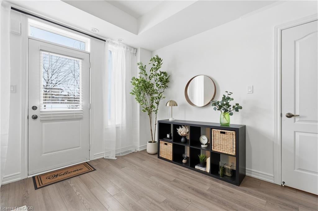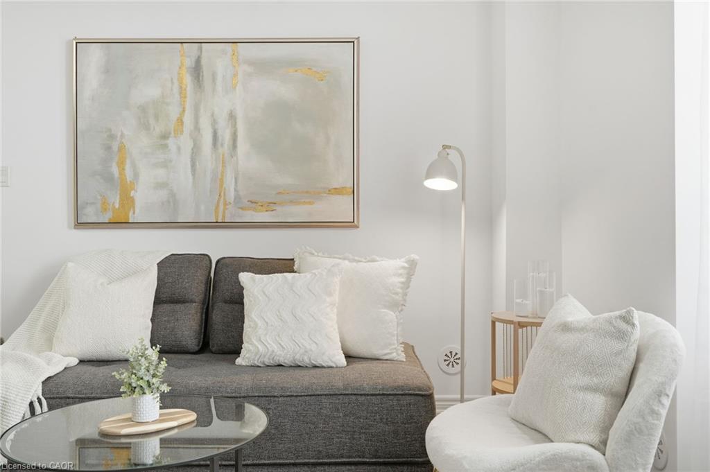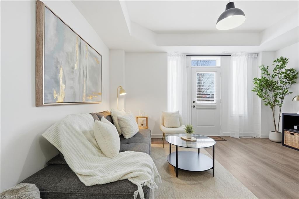 Modern ground-level, end-unit stacked townhome offering stair-free living, low condo fees, and exceptional value in one of Guelph’s fastest-growing neighbourhoods. This 1-bedroom, 1-bath home is ideal for first-time buyers and downsizers seeking a stylish condo alternative with a garage, outdoor living space, and excellent storage. Recently painted, this open-concept home features a bright living and dining area with upgraded laminate flooring and abundant natural light. The modern kitchen showcases upgraded Barzotti cabinetry, quartz countertops, subway tile backsplash, and stainless steel appliances. Thoughtful design sets this home apart from a typical apartment, with a spacious pantry and two hidden storage areas that maximize functionality. The bedroom features an oversized window that fills the space with light. The modern 4-piece bathroom offers granite counters and a deep soaker tub. Enjoy in-suite laundry, inside-entry from the attached garage, and two parking spaces—a rare find at this price point. Outside, a large fully fenced terrace with morning sun and afternoon shade is perfect for relaxing or low-maintenance outdoor living. Located just 10 minutes from the University of Guelph and close to parks, trails, shopping, and major commuter routes, this home delivers both convenience and lifestyle. With a new development proposed across the street, you’re not just buying a home today—you’re investing in the future of a growing community. A perfect opportunity for first-time buyers and downsizers seeking smart, low-maintenance living.