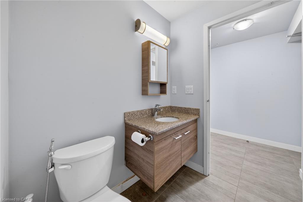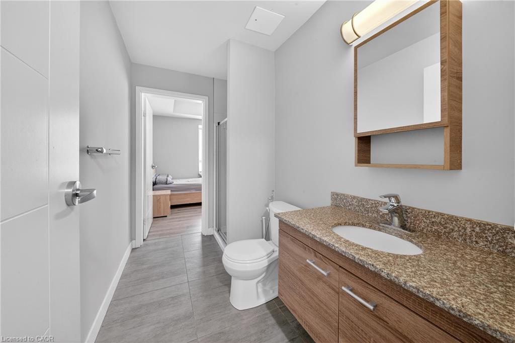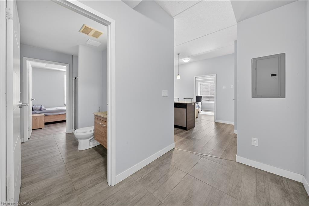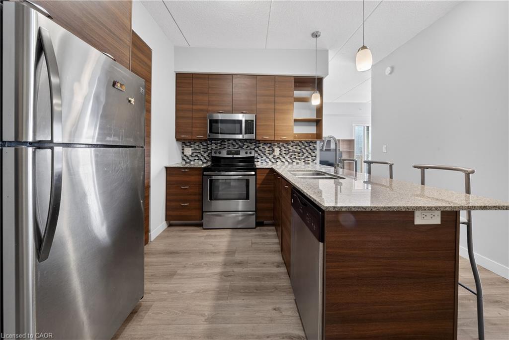 Modern condo living in a well-maintained building just minutes from the University of Waterloo and Wilfrid Laurier University. This bright west-facing suite offers approximately 953 sq. ft. of thoughtfully designed space with 2 bedrooms and 2 bathrooms, ideal for comfortable everyday living or investment potential. The open-concept layout seamlessly connects the kitchen, dining, and living areas, creating a functional and inviting space. The contemporary kitchen features sleek cabinetry, granite countertops, stainless steel appliances, and a breakfast bar with seating-perfect for casual meals or entertaining. A stylish mosaic backsplash adds a modern touch while generous counter space provides practicality for daily use. The living and dining area is filled with natural light from large windows and sliding doors leading to a private open balcony with west-facing exposure-an ideal spot to relax and enjoy sunset views. Durable flooring and neutral finishes throughout make the space easy to personalize. Both bedrooms offer comfortable proportions, while the primary bedroom benefits from its own private ensuite bathroom. Ensuite laundry adds everyday convenience. Residents enjoy access to building amenities while maintenance fees include common elements, heat, water, and central air conditioning, helping simplify monthly expenses. Situated in a vibrant and highly accessible neighbourhood close to universities, shopping, restaurants, transit, and parks, this condo offers an excellent opportunity to experience convenient urban living in Waterloo.