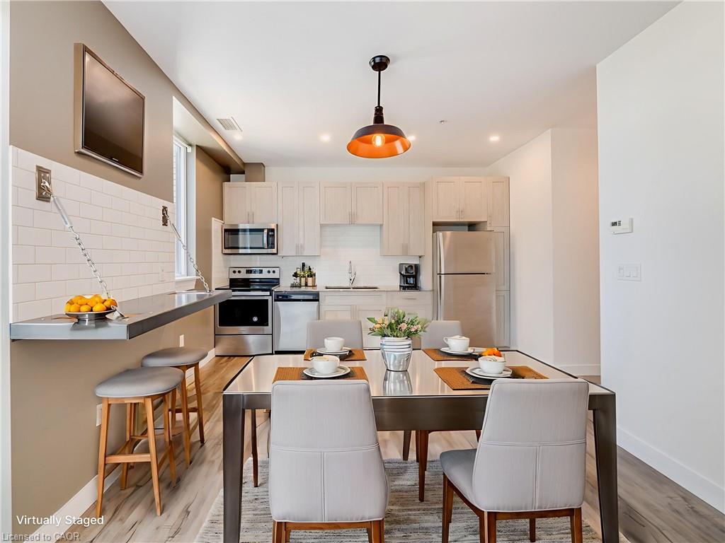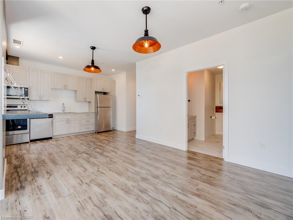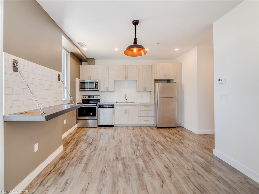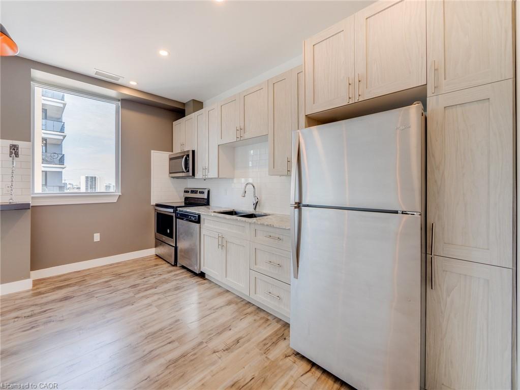 Available right away or for December 1st, this stunning 17th-floor penthouse in Downtown Kitchener offers breathtaking views. Bright and spacious, this one bedroom unit features a modern kitchen with upgraded cabinets, granite countertop, stainless steel appliances, stylish lighting, and reclaimed wood shelving units. Additional highlights include a versatile storage area/den, in-suite laundry, and one parking space. Internet is included in rent, only hydro is extra. Located in the heart of Kitchener's "Innovation District," the penthouse is steps away from Google, The Tannery, Downtown Kitchener, the University of Waterloo School of Pharmacy, LRT, shops, cafes and restaurants. Great building amenities: gym, media room, and rooftop terrace with BBQs. This is a rare opportunity for urban living at its finest.