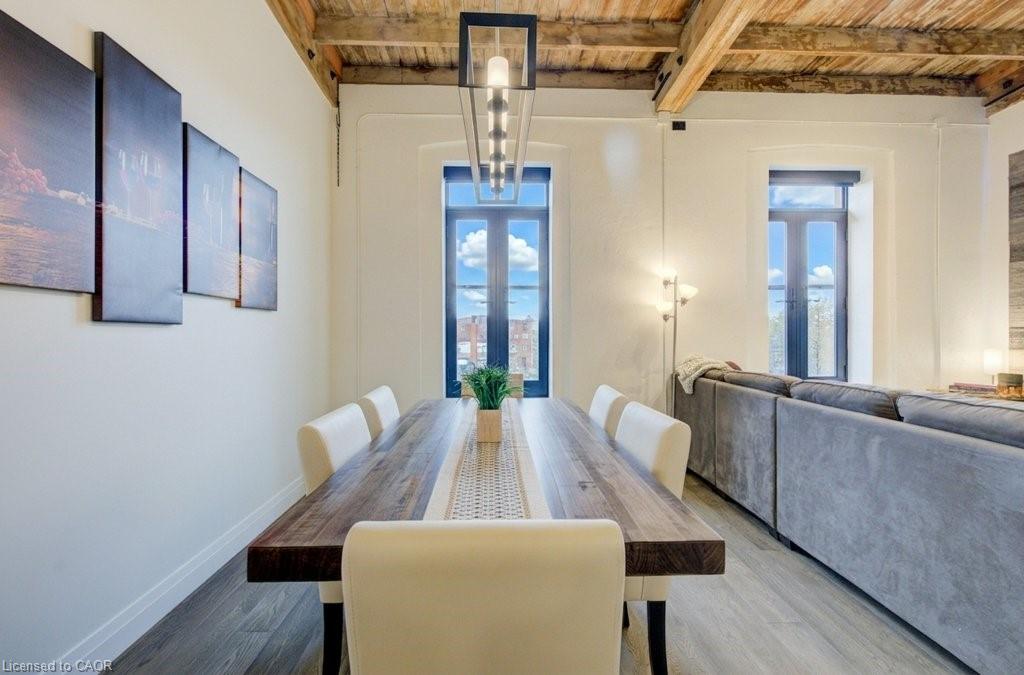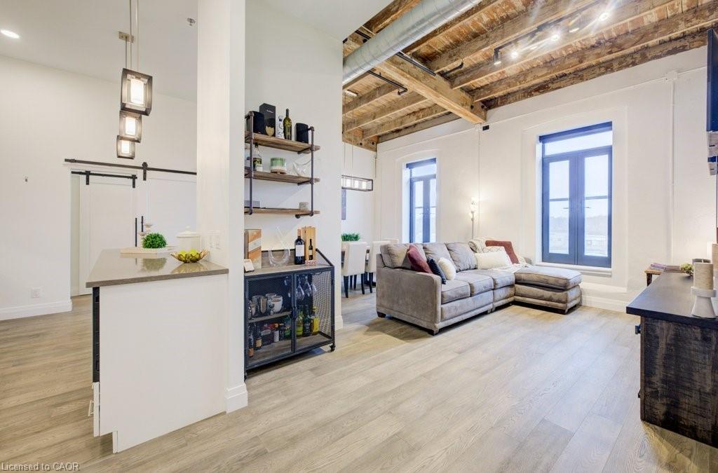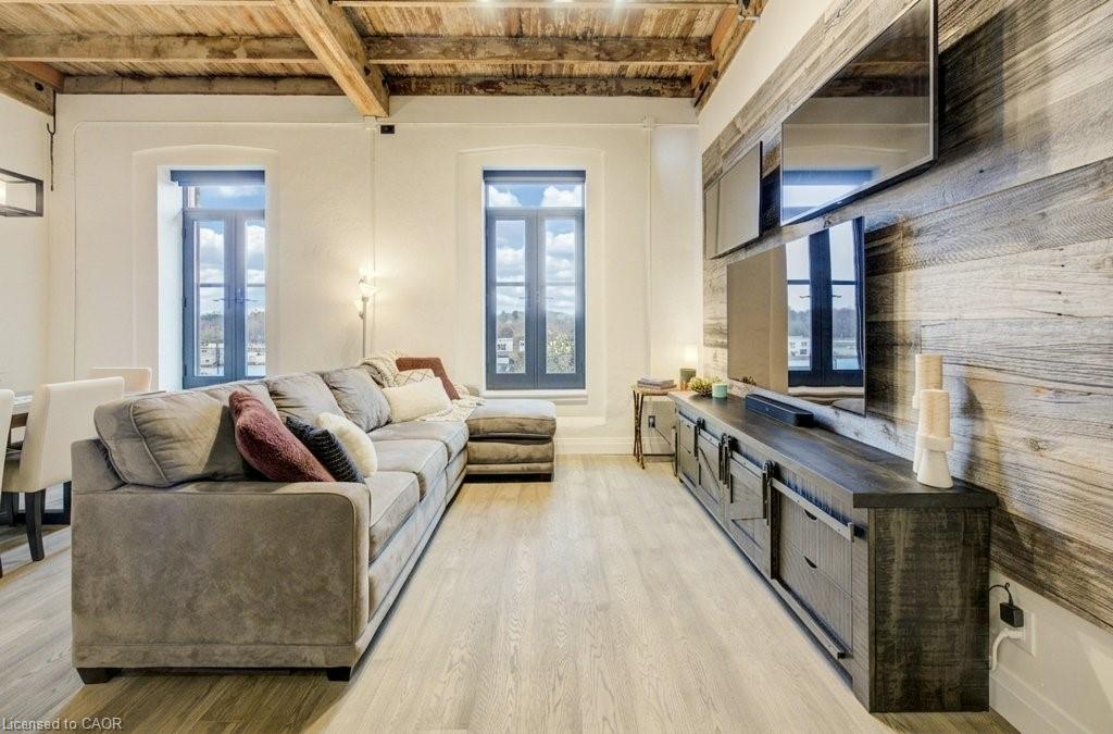 Welcome to riverfront living at its finest in the heart of Downtown Hespeler. Set within the beautifully restored American Standard Factory, thoughtfully converted into striking loft-style residences in 2020, this top-floor condo offers a rare blend of historic character and modern design. Spanning 1,087 square feet, this exceptional 2-bedroom, 2-bathroom suite is defined by its bright, open-concept layout and breathtaking views of the Speed River. Four oversized windows, each with its own Juliette balcony, flood the space with natural light and create a seamless connection to the Speed River below. The main living area is designed for both everyday living and entertaining, featuring a stunning gourmet kitchen that flows effortlessly into the dining area and inviting living room. Clean lines, elevated finishes, and the airy loft aesthetic make this space feel both sophisticated and comfortable. The thoughtfully designed layout offers ideal bedroom separation. The primary suite is a private retreat, complete with a spacious walk-in closet and a beautifully appointed ensuite bathroom. The second bedroom is located on the opposite side of the unit, adjacent to a full 4-piece bathroom, perfect for guests, family, or a home office. Additional highlights include in-suite laundry, an efficient heat pump system, and a tankless water heater for modern, low-maintenance living. This unit also comes with an owned parking space and locker for added convenience. Residents enjoy access to excellent building amenities including a fitness centre and secure bike storage. Step outside and experience everything Downtown Hespeler has to offer. From charming cafés and local restaurants to boutique shopping, the library, recreation centre, and tennis club, everything is just a short walk away. This is a lifestyle opportunity where urban convenience meets natural beauty. A truly unique offering in one of Cambridge’s most sought-after communities.