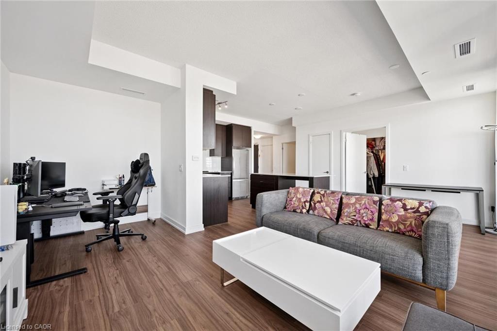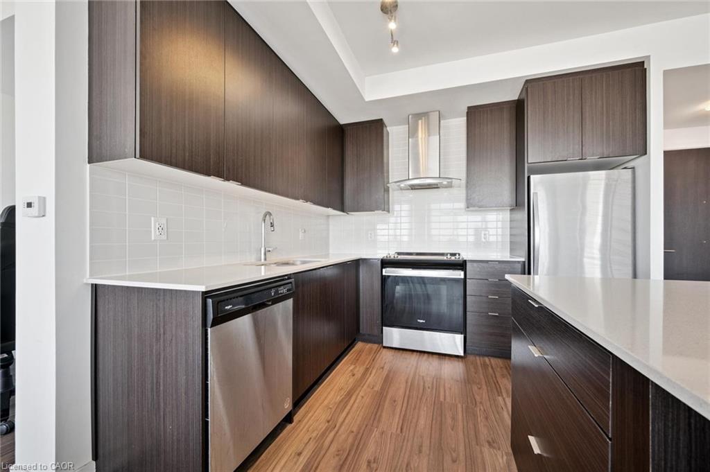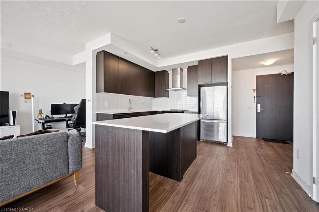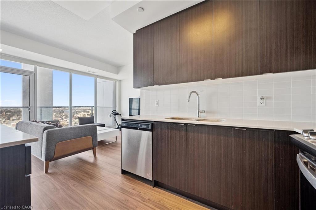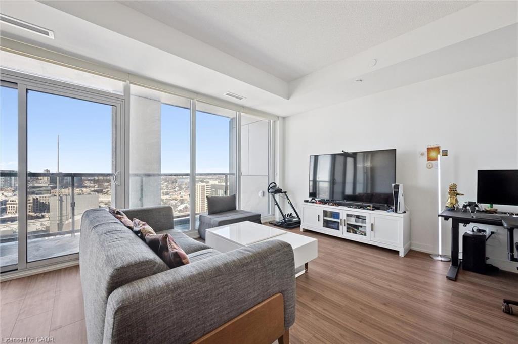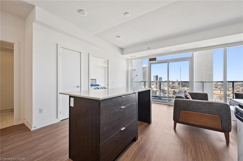 This 1 bedroom plus den condo is located in the bustling downtown area, offering a modern and stylish living space. As you step into the unit, you are greeted by a spacious open-concept living room and kitchen area, which is perfect for entertaining guests or relaxing after a long day. The kitchen features high-end stainless steel appliances, a kitchen island, and a sleek backsplash. The countertop provides ample space for meal preparation and doubles as a breakfast bar for quick meals. The bedroom is spacious and features large windows, which provide plenty of natural light and a stunning view of the city skyline. This unit features electric motorized blinds on all windows. The den can be used as a home office, or additional storage space, adding to the flexibility and functionality of the unit. The bathroom is elegantly designed with modern fixtures, a vanity sink, and a full-size bathtub. Other amenities include exclusive storage locker and parking, in-unit laundry, central air conditioning and heating, and a private balcony that provides a breathtaking view of the city. The building offers additional amenities, such as a fitness centre, a rooftop terrace, a walking/running track on the rooftop and 24-hour security, ensuring safety and convenience. This 1 bedroom plus den condo is perfect for those who want to experience the urban lifestyle with easy access to restaurants, cafes, shopping, and entertainment options that downtown has to offer. It is ideal for young professionals, couples, investors or small families who are looking for a comfortable and convenient living space in the heart of the city.