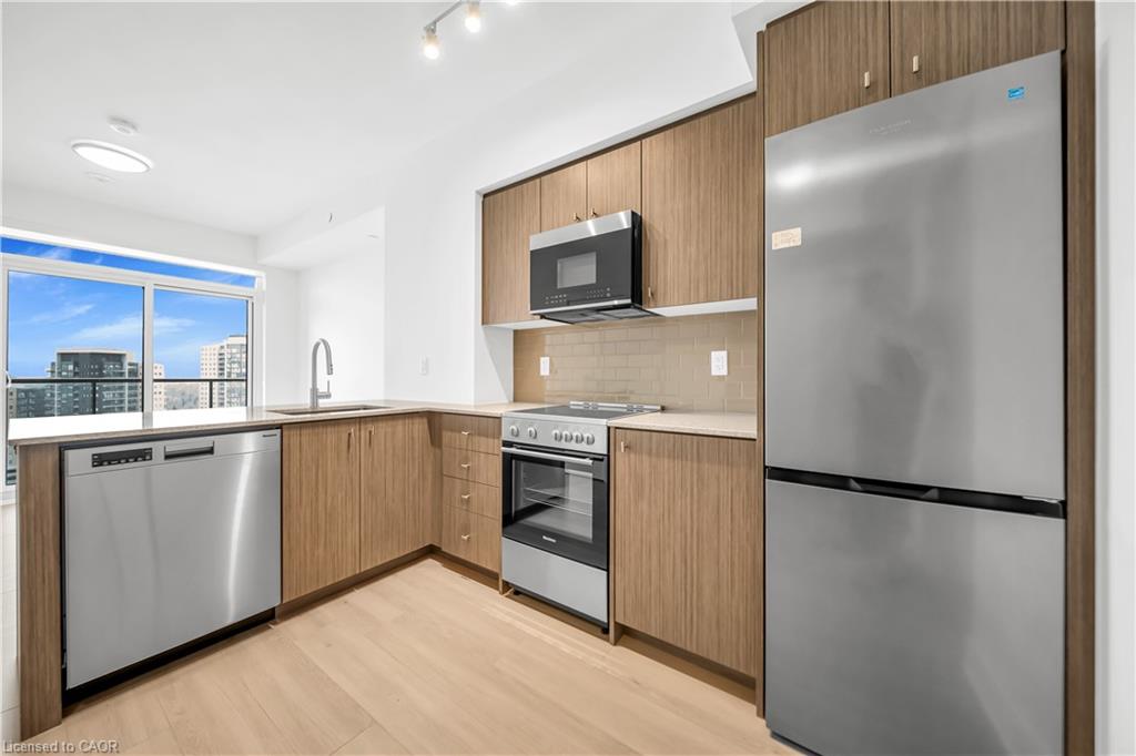 Never Lived-Brand New Residence Just Days Old, welcome to Unit 1914 at Station Park Duo-offering a rare opportunity to own a pristine, never-lived-in home in the heart of Midtown Kitchener. This impeccably crafted one-bedroom plus den suite delivers a seamless blend of sophistication, comfort, and investment potential within one of the region's most coveted communities.Bathed in natural light, the open-concept living space showcases refined finishes and seamless design. The contemporary kitchen is a statement in both style and function, featuring sleek stainless steel appliances, polished granite countertops, custom soft-close cabinetry, and elegant pot lighting-perfect for both everyday living and effortless entertaining.Unwind in the sun-filled living area or step onto your private balcony to take in breathtaking sunset views that elevate your everyday experience. A versatile denprovides the ideal space for a home office or guest retreat, while in-suite laundry and dedicated underground parking add an extra layer of convenience. Residents of Station Park enjoy an unparalleled suite of resort-inspired amenities designed to rival luxury hotels. From concierge service and an expansive sky deck to aswim spa, hot tubs, private bowling lanes, and a state-of-the-art fitness centre with Peloton studio-every detail is curated for an exceptional lifestyle. Social lounges, co-working spaces, BBQ terraces, EV charging, and pet-friendly features complete this dynamic offering. Positioned steps from the ION LRT, the Google campus, Downtown Kitchener, Uptown Waterloo, and the thriving Innovation District, this residence offers un-matched connectivity to the region's top employers, dining, and cultural destinations. With short-term rental permissions (Air bnb) and a limited licensing cap, this property also presents a compelling opportunity for the savvy investor seeking both lifestyleand income potential. Some Photo's are virtually staged.