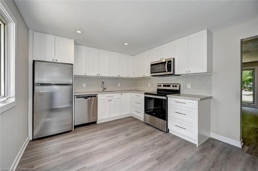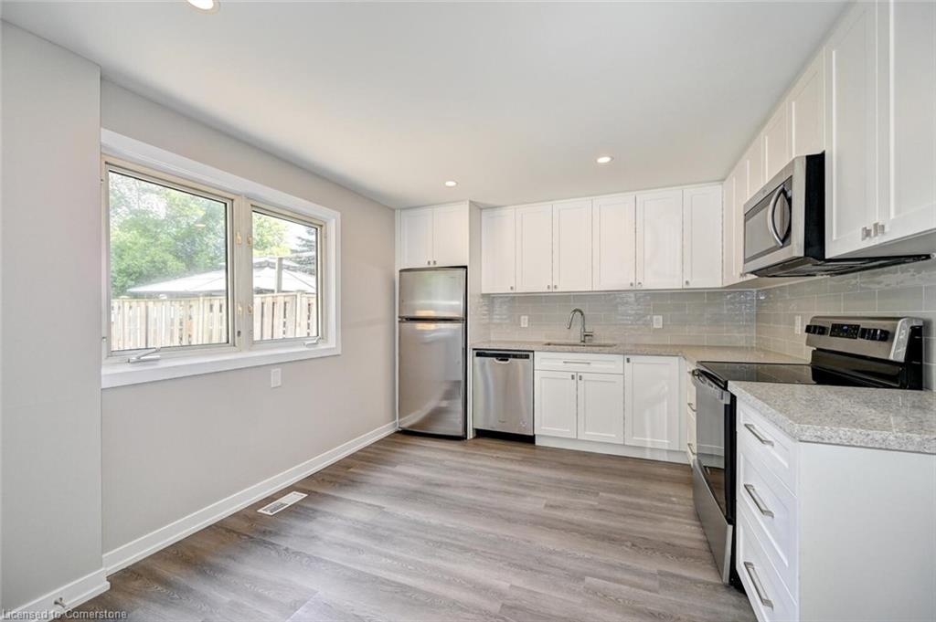 Renovated top to bottom in 2022, this stylish semi in the Cambridge Greenway-Chaplin neighborhood blends modern upgrades with a practical layout perfect for families and first-time buyers. Step inside to a bright main floor with new flooring and refinished hardwood throughout. The front living room offers a cozy space to unwind, while the renovated kitchen at the back is the heart of the home: extended white cabinetry, quartz countertops, glass backsplash, under-mount sink, pot lights, and stainless steel appliances. The dining area is open and connected, ideal for everyday living. Upstairs, three sunlit bedrooms feature new doors, trim, lighting, and custom closet organizers. The bathroom has been fully updated with quartz finishes and all-new fixtures fresh, polished, and move-in ready. The finished basement adds flexible living space with a rec room, second bathroom, laundry, and storage. Whether it's a home office, media room, or play area, there's room to make it yours. Outside, a fully fenced 150 deep backyard offers endless potential space for pets, gardens, or summer hangouts. The private driveway has parking for multiple vehicles.198 The Greenway is a turn-key home in a well-established community near schools, parks, shopping, and public transit. *Please note that some photos are virtually staged*