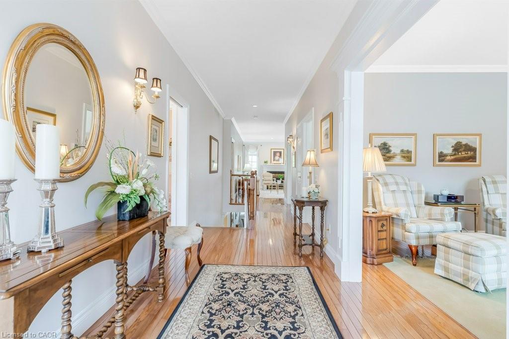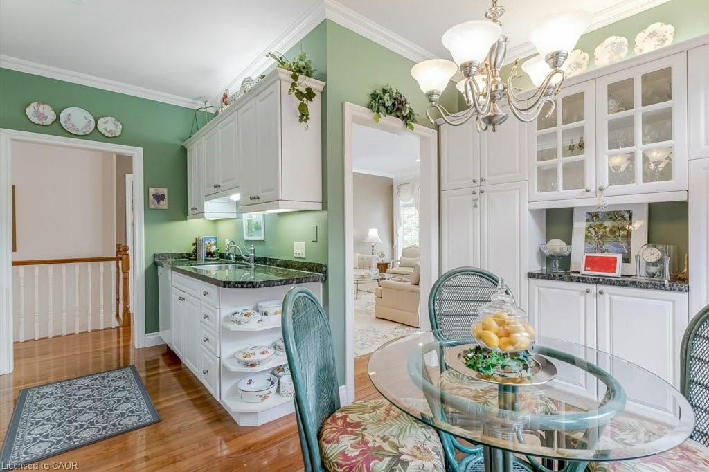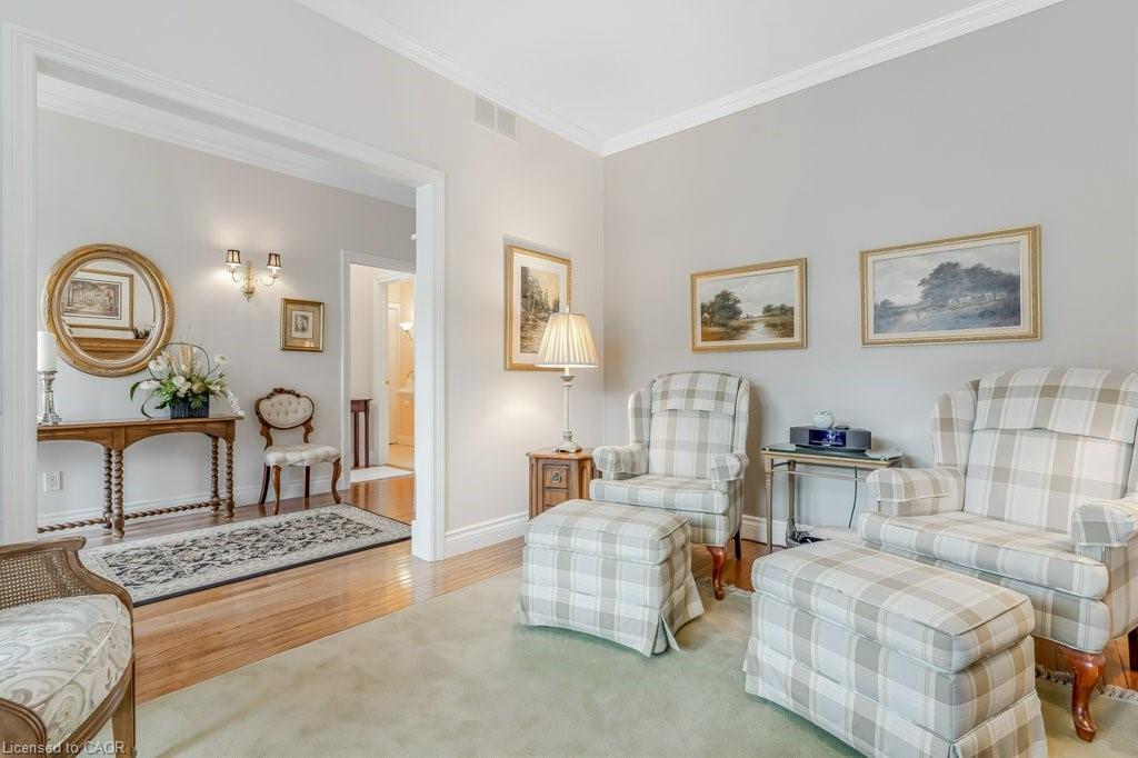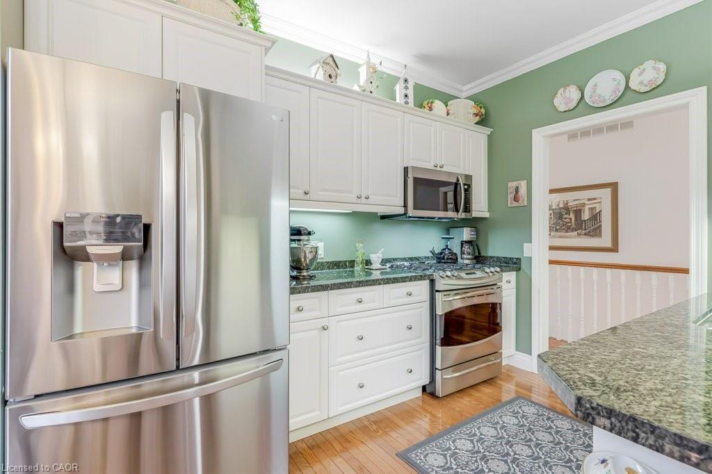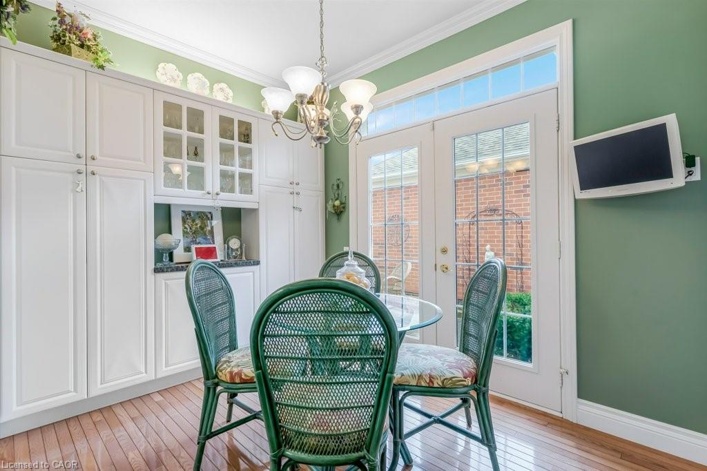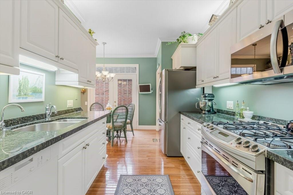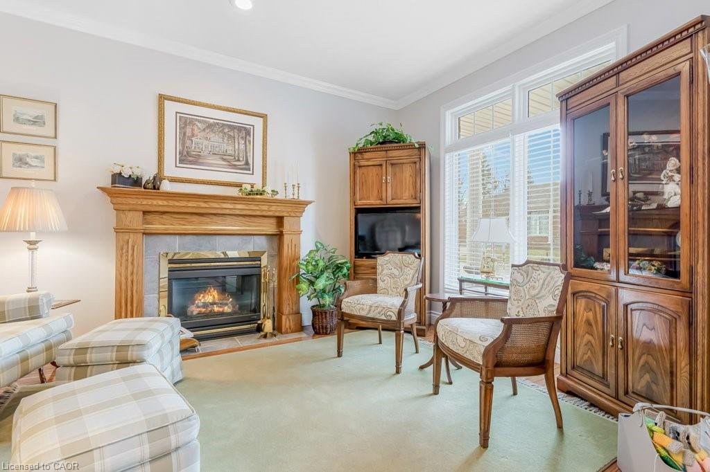 Don't miss this lovely bungalow townhome located in West Galt's highly sought after Riverwalk condominium complex. Situated on almost 17 acres along the Grand River, this beautiful complex offers easy access to walking and biking trails along the water, its own community garden plots, ample visitor parking and the Quarry House, a lovely community meeting place. Although the Quarry House is available for all of your special occasions, it also offers a variety of social activities scheduled throughout the week. The unit itself is a popular centre hall plan, with hardwood flooring and crown moulding running throughout. At the front foyer is a large den with gas f/p. The eat-in kitchen has had additional wall to wall white pantry cabinets added, granite countertops, S.S. appliances, and a door to the private courtyard. The living/dining room area has a gas f/p, 3 bay windows which allow for expansive views of the lawn and lots of sunshine. The primary bedroom also includes a bay window, a large walk in closet, and an ensuite with a glass shower, tile flooring, two sinks, & a soaker tub. The 2nd bedroom and 3pc bath with shower can be closed off from the front hall with a pocket door, making it a perfect retreat for overnight company. Completing this level is the spacious laundry room which leads to a double garage with ample storage, two garage door openers, an access to the courtyard, & a staircase down to the lower level. Downstairs, 3 large egress windows provide lots of sunlight to this spacious family room with a 3rd gas f/p. A 3rd bedroom with an egress window, a walk in closet, and a 4pc bath is great for extra company. If you can use a craft room, this one is outstanding, featuring bright overhead lighting and a sink for easy clean up. Finishing off the lower level is a spacious and organized storage area plus a cold room. This home has been loved and meticulously cared for. Make an appt to view today. You won't be disappointed!