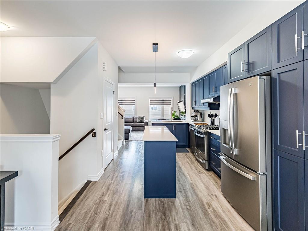 Welcome to this beautifully upgraded, modern-style 3-bedroom plus den townhome that is truly move-in ready and offers exceptional value for families. The main floor features a versatile den that can be used as a home office or entertainment room. The second floor showcases a bright open-concept layout with a stunning upgraded kitchen complete with hard-surface countertops, a large island, gas stove, stainless steel appliances, ample cabinetry, and an eat-in area, flowing into a spacious living room highlighted by a custom media wall and a convenient large size powder room. The third floor offers a generous primary bedroom with a walk-in closet and upgraded ensuite, along with two other well-sized bedrooms and another full bathroom. Recent upgrades include smart switches and dimmers, upgraded carpet, and upgraded tiles in the washrooms. With its beautiful exterior curb appeal and prime location close to amenities, schools, and highway access, this home is a must-see home ideal for young families and first-time buyers.