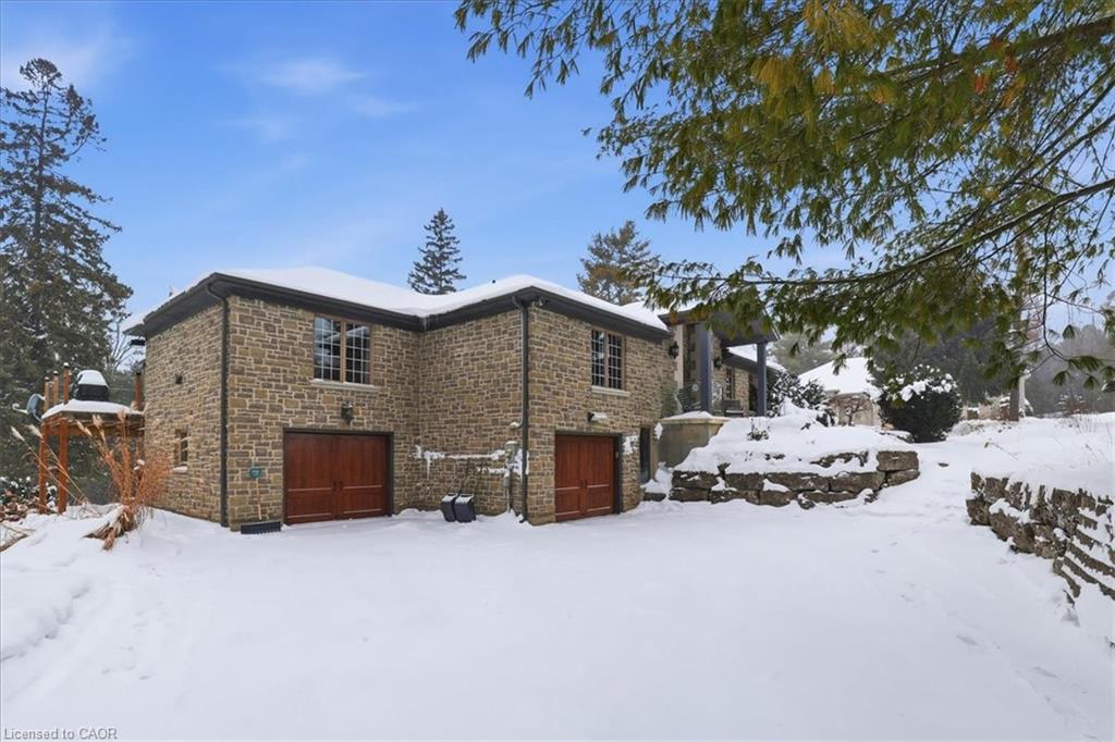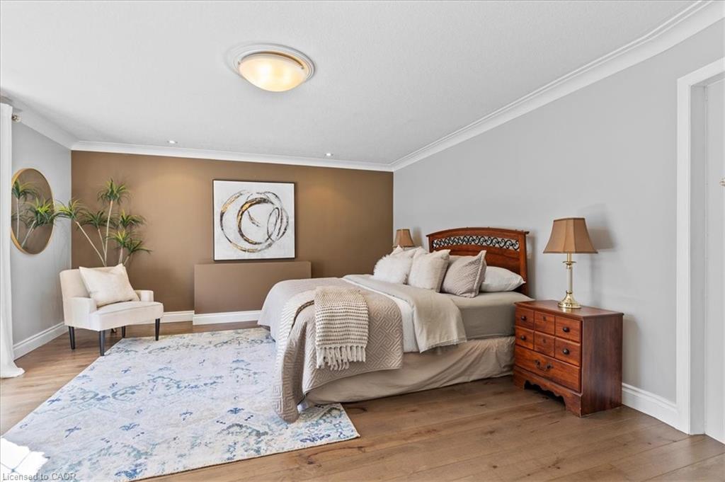 2-piece bathroom, and the primary suite, complete with walk in closet and recently renovated(2023) 5-piece spa like ensuite. A hardwood staircase leads to the lower level which is still completely above grade; the home was strategically placed to take full advantage of the walkout. Lower level gives access to the oversized, staggered double car garage. Perfectly suited as a multi-generational home, offering three bedrooms, a recently renovated (2023) 4-piece bathroom, recreation room with gas fireplace, and kitchenette along with wet bar. Roof(2024), Additional oversized garden shed for equipment storage. Minutes from the 401, amenities, and schools. Don’t miss this truly beautiful property!