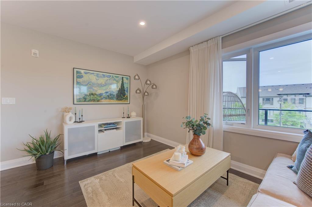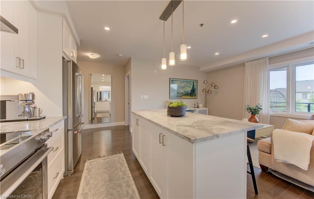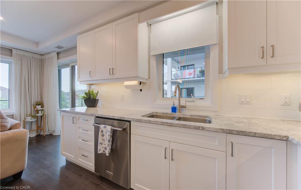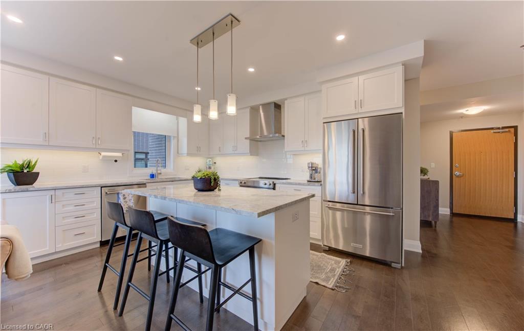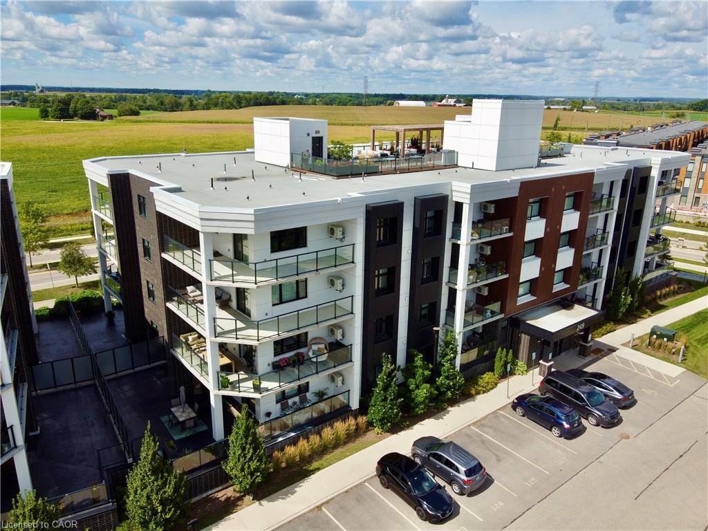 Rare corner condo offering over 1,100 square feet of brilliantly lit living space. Thanks to expansive windows, 8.5-foot ceilings, and wide, welcoming hallways, sunlight pours in from multiple exposures to create a bright, airy atmosphere the moment you walk through the door. At the heart of the home is a chef’s kitchen designed to impress. It features a quartzite island, soft-close custom cabinetry, and a full suite of KitchenAid appliances, complemented by smart details like USB outlets, under-cabinet lighting, and dimmer switches. The open living and dining area flows effortlessly onto one of the condo's standout features, a spectacular 320-square-foot wrap-around balcony. This massive outdoor extension is large enough for lounging, dining, and cultivating container gardens, giving you a private oasis to enjoy your morning coffee, and host friends. The serene primary suite features custom double closets and a spa-inspired ensuite with a sleek quartz vanity and a tiled walk-in shower with bench seating. A versatile second bedroom works perfectly as a guest room or bright home office, while the 4pc main bath offers a deep soaker tub. Throughout the unit, enjoy premium upgrades including engineered hardwood floors, built-in closet systems, in-suite laundry, and a smart thermostat. The perks of this condo extend up to the rooftop terrace, offering panoramic views of farmland and the Waterloo skyline alongside fire tables, BBQs, community gardens, and stylish lounges. Complete with two parking spaces (one underground with a locker, one at-grade) and ample visitor parking. Located steps from RIM Park, the Grey Silo Golf Course, and endless trails, with shopping and universities just minutes away. This is modern condo living at its finest.
