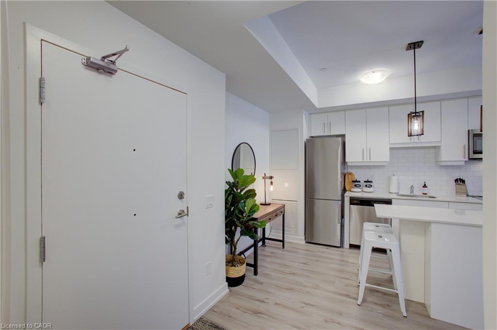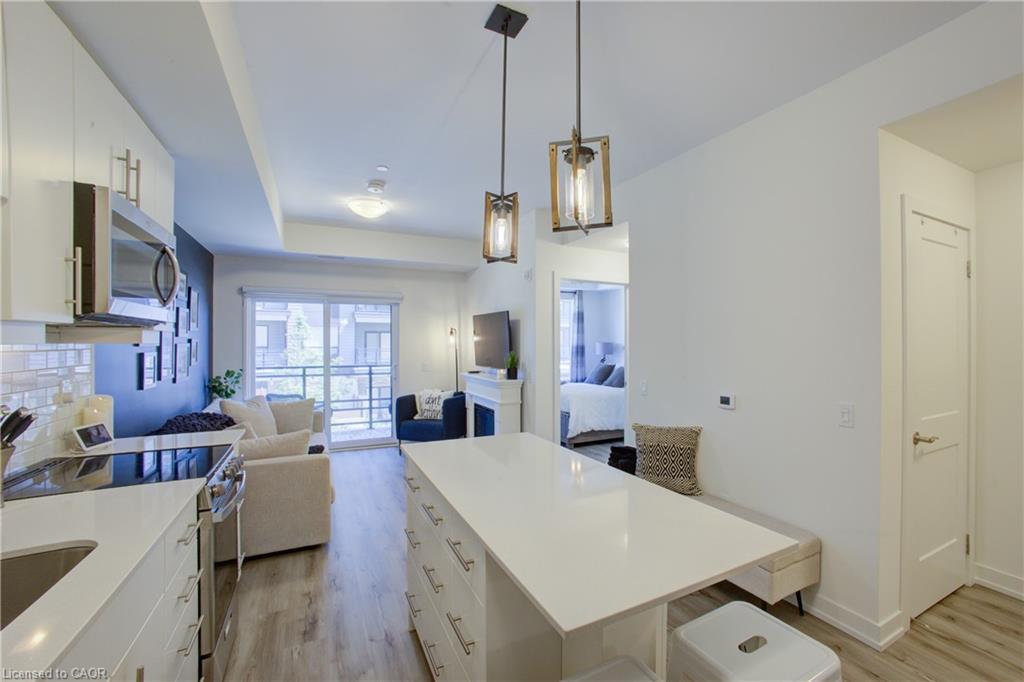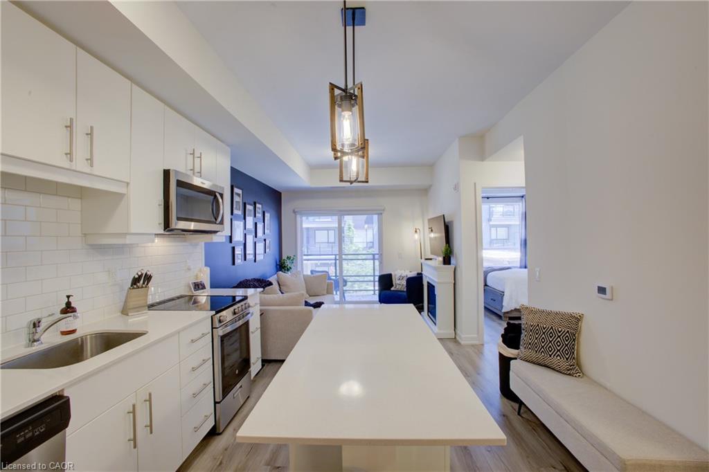 Blackstone Condominiums where modern design meets convenient lifestyle living. Owner Occupied, CARPET FREE one-bedroom suite offering an oversized four-piece bathroom and the convenience of an in-suite stackable washer and dryer, and REMOTE CUSTOM BLINDS. This impeccably tidy home, features a contemporary open layout with views of the tranquil courtyard from both the living room and the bedroom. A sliding PATIO DOOR leading to your private balcony, over 62 square fee, perfect for enjoying your morning coffee. The bright white kitchen is thoughtfully designed with UP-GRAGED QUARTZ countertops, stainless steel appliances, a classic subway TILE BACKSPLASH, a LARGE ISLAND with extra storage, hanging PENDANT LIGHTS over the island for your convenience. The bathroom is generously sized and includes a modern tub and shower combination, with plenty of space for comfort. This suite also includes an exclusively owned UNDERGROUND PARKING space and private STORAGE LOCKER for added value. Residents of Blackstone enjoy a wide range of shared amenities designed for a modern lifestyle, including a pet washing station, secure bike storage, a fully equipped gym, co-working lounge, spacious party room, a rooftop terrace in building 255, and beautifully designed outdoor gathering spaces between buildings 247 and 243. High-speed Rogers internet is included in the condo fees, offering even more convenience. Ideally located just steps from Brown's Social House and other local shops and services, this community is minutes from Conestoga Mall, the ION light rail transit line, and scenic walking trails. With quick access to St.Jacobs, RIM Park, Grey Silo Golf Course, Wilfrid Laurier University, University of Waterloo, and Conestoga College, this condo is perfectly situated for anyone looking to enjoy the convenience of Waterloo. Perfect for the professional, down sizer, investor or first time buyer.
