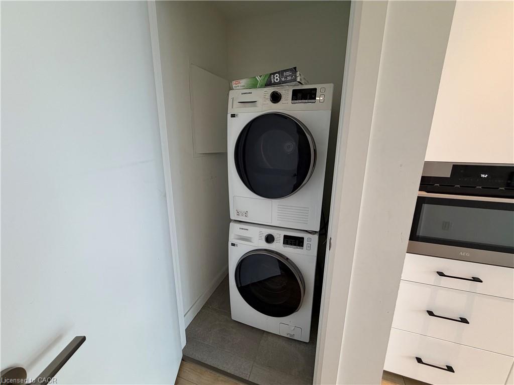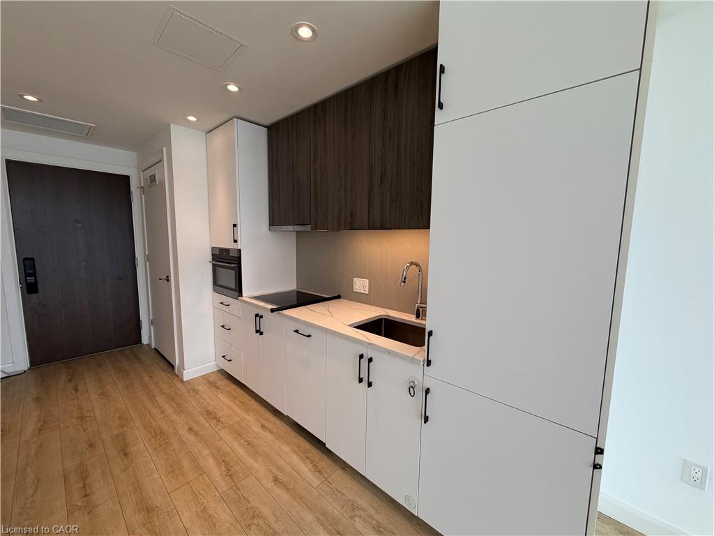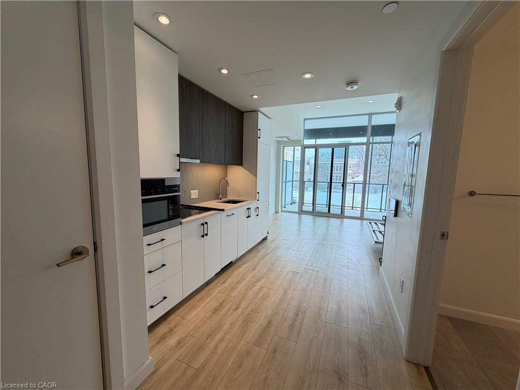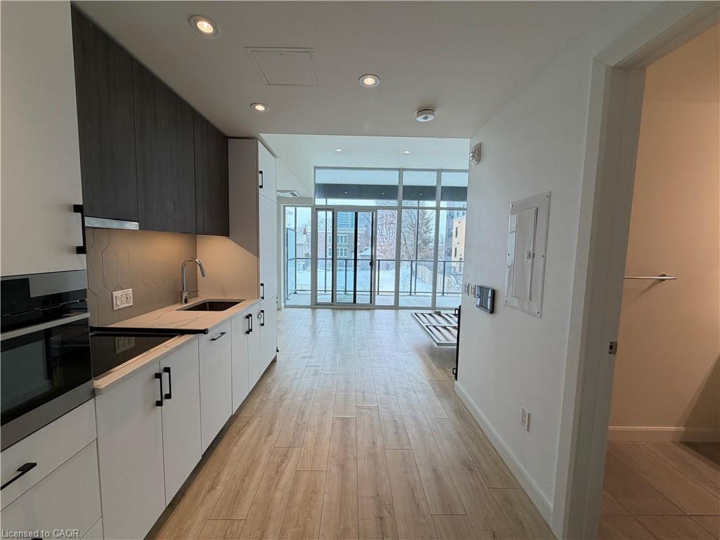 Bright and modern studio suite in the heart of Kitchener’s Innovation District at the Bright Building. This thoughtfully designed unit features floor-to-ceiling windows and an open-concept layout that fills the space with natural light. A sleek Murphy bed allows the living area to transform effortlessly from day to night, maximizing functionality and comfort. The contemporary kitchen is equipped with quartz countertops, built-in stainless steel appliances, and stylish cabinetry, while the bathroom offers "Heated Floors" for year-round comfort. Step outside to a private terrace—an ideal extension of the living space and a perfect spot to unwind. In-suite laundry adds everyday convenience. Residents enjoy premium amenities including a community BBQ, sauna, co-working space, social lounge, and rooftop terrace. Steps from the LRT, Google, Grand River Hospital, and downtown shops and restaurants, this is refined urban living at its best.